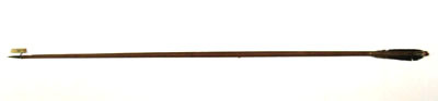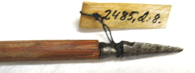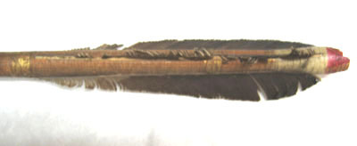 Spets i stål, L 23 mm. Triangulär med smalare konisk bas och tången inslagen i skaftet. Skaft av ljust furuliknande trä med tydlig ådring. Baktill skadade brunsvarta styrfjädrar. Yttre delen lindad med svart tråd och målad med tre band av guld. Ytterst tillskuret strängläge med två armar, målat i vitt och rött.