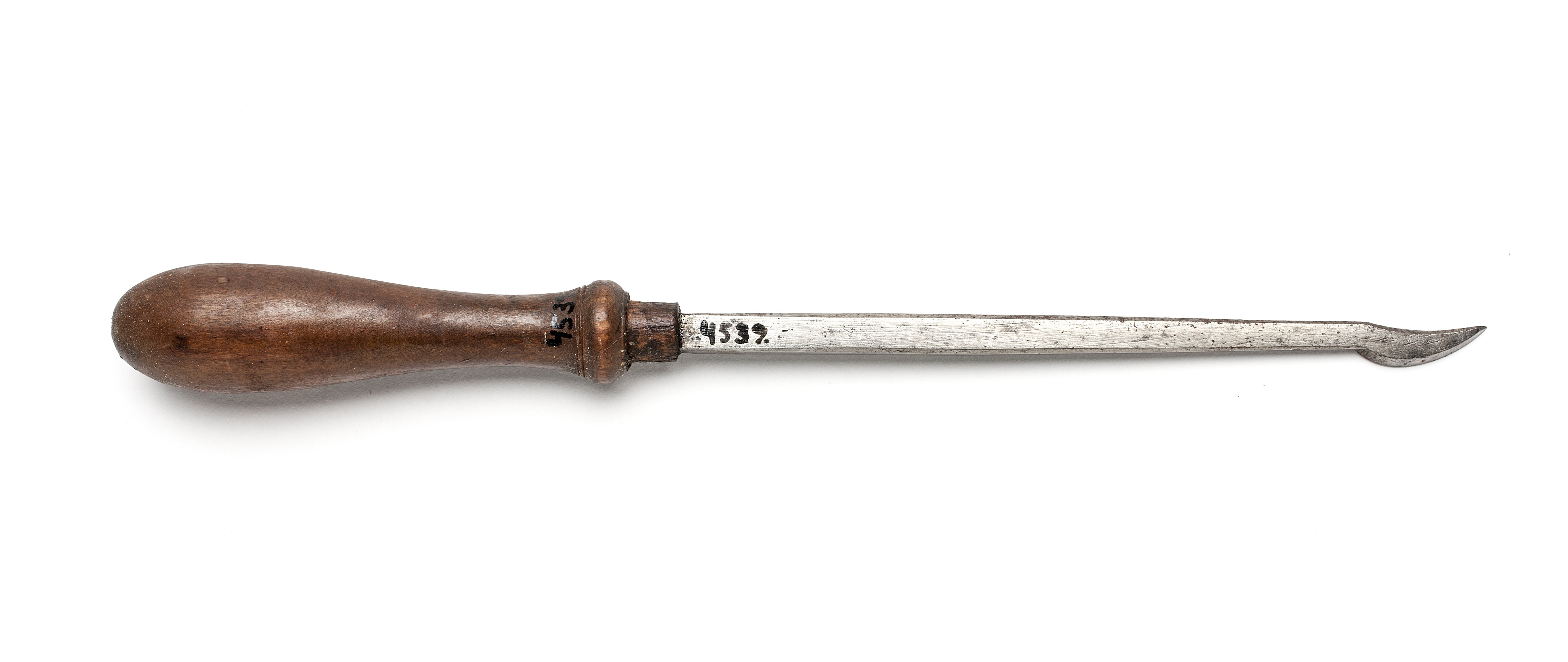 Klinga med rektangulär genomskärning, avfasade kanter. Änden formad som en månskära med egg efter ytterkanten. Stämplat på stålet: "IPS". Svarvat skaft av päronträ, med en vulst nedtill.