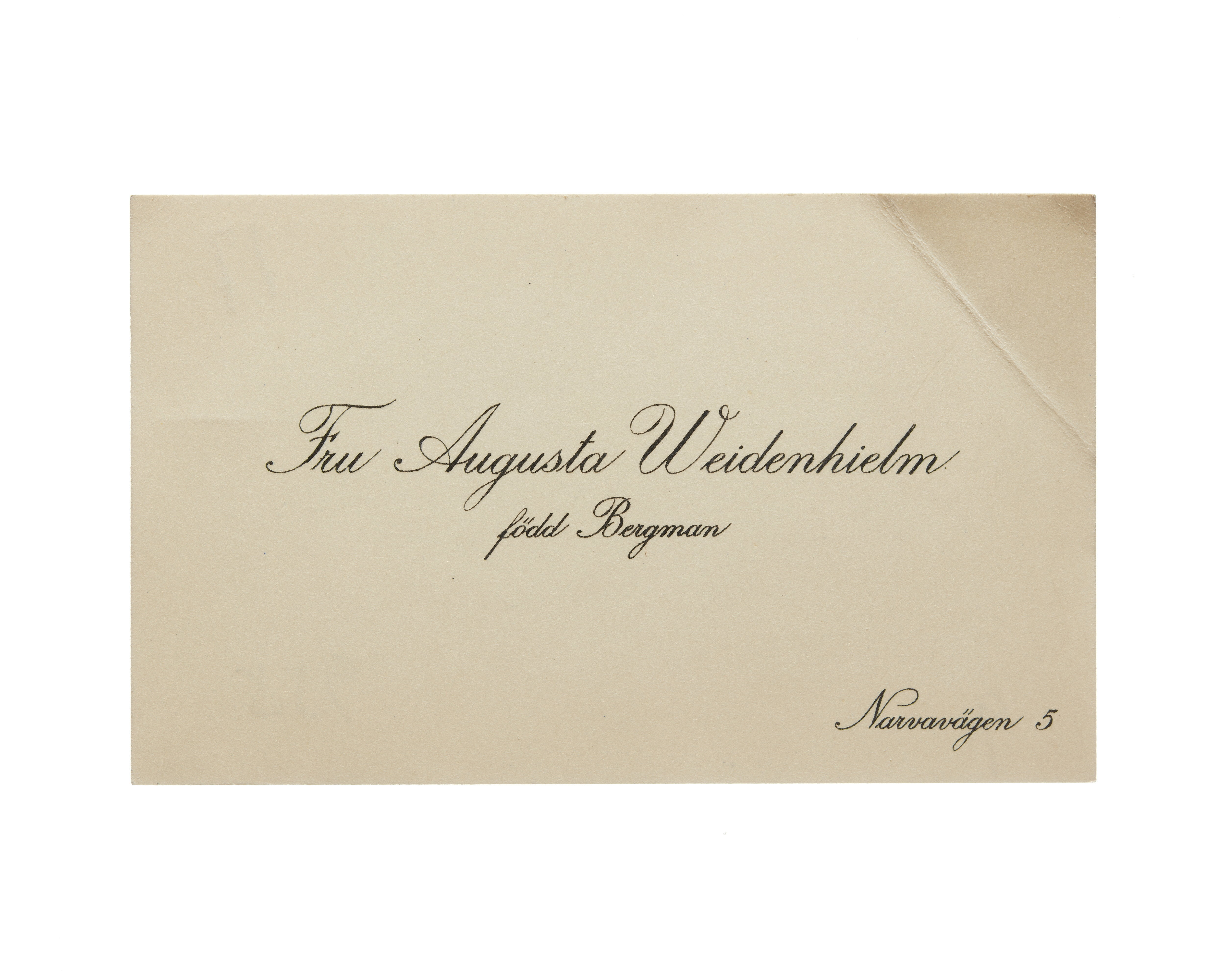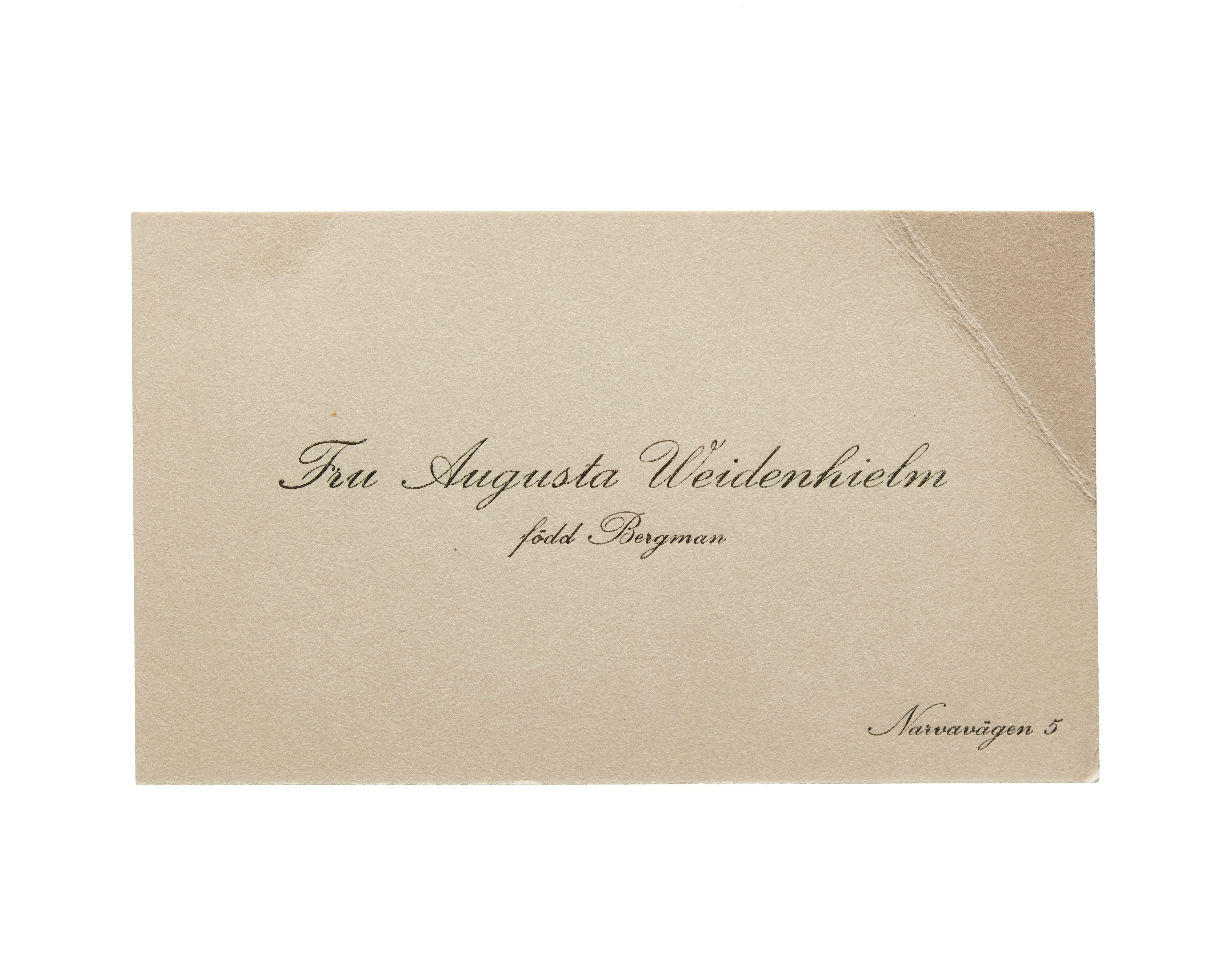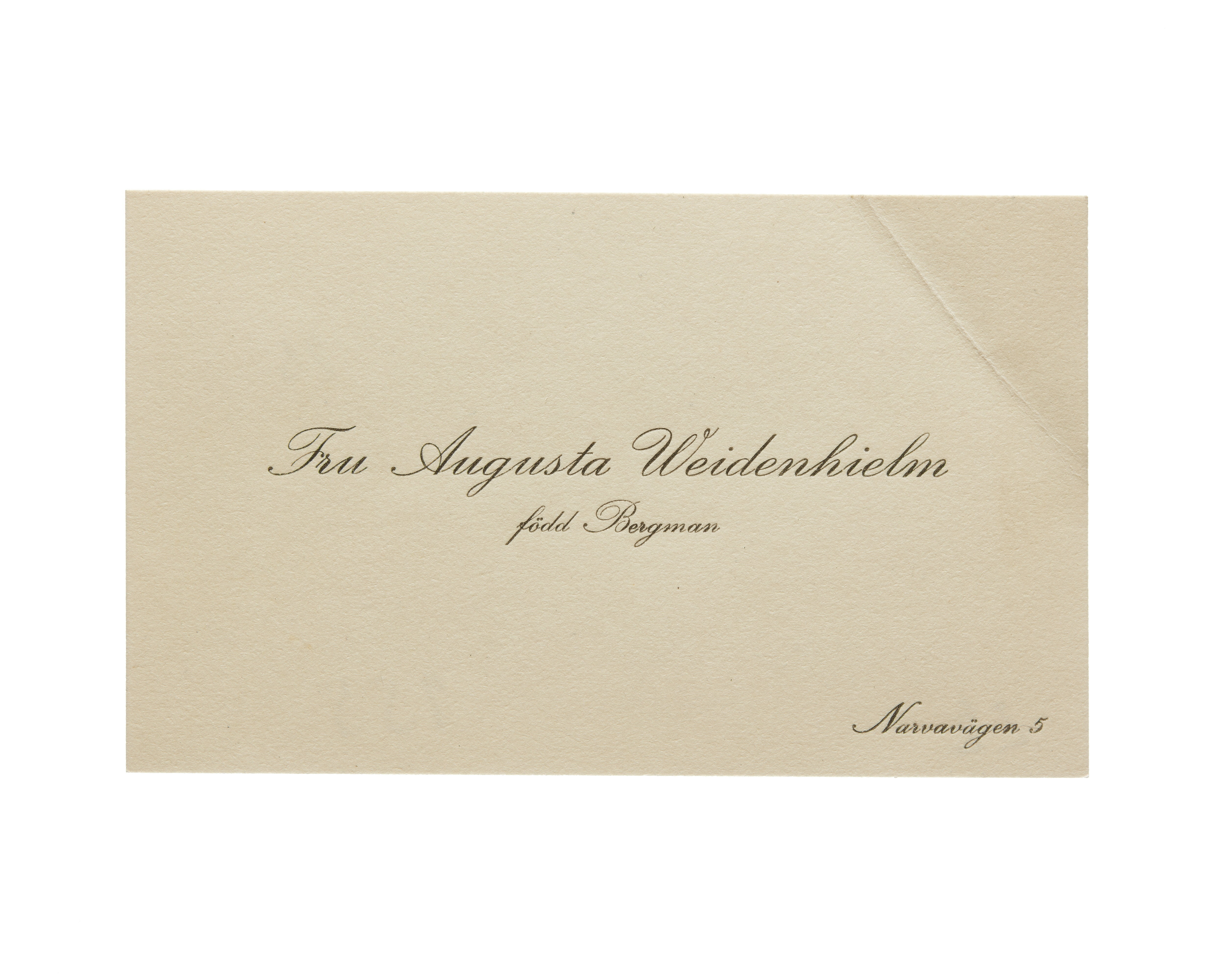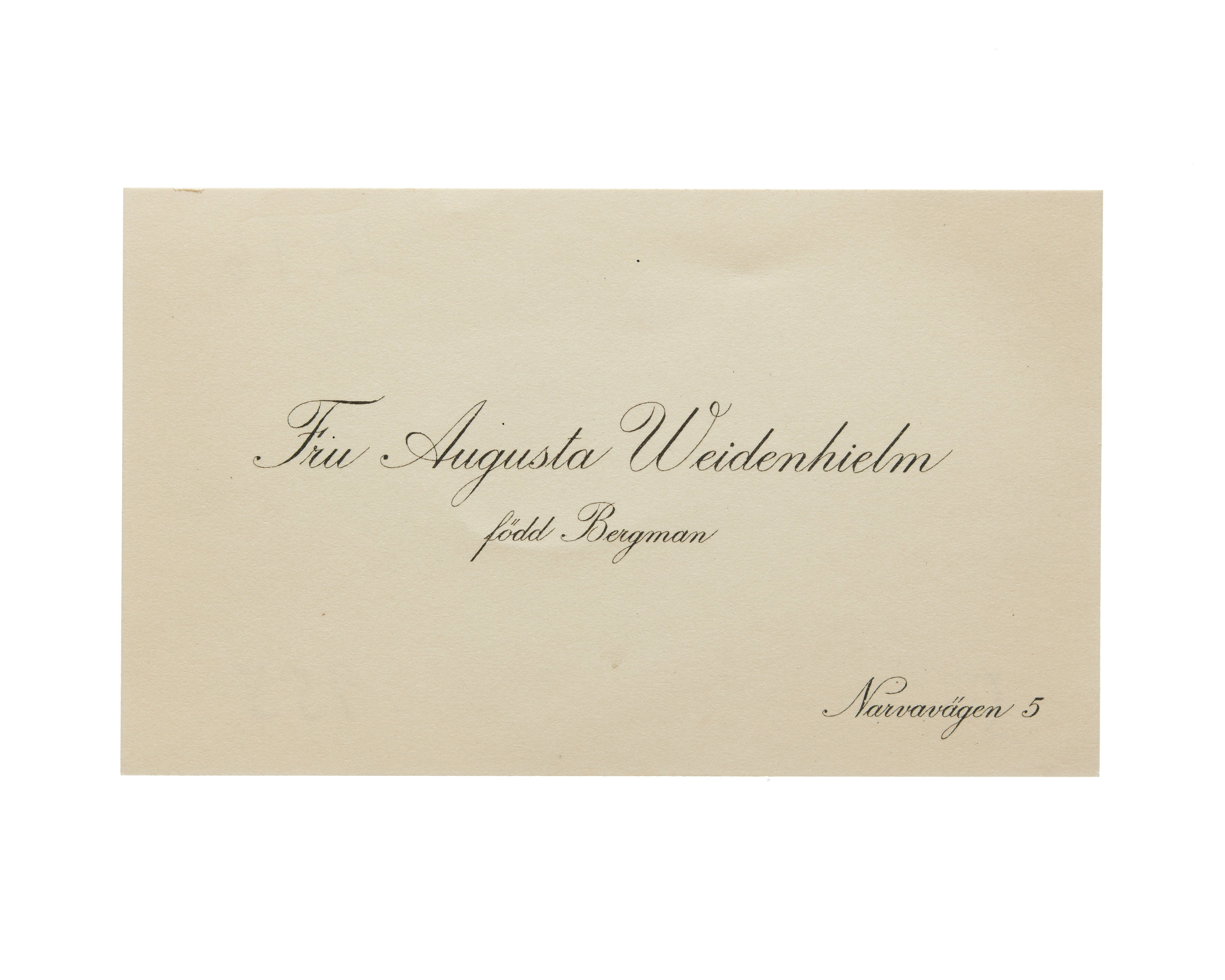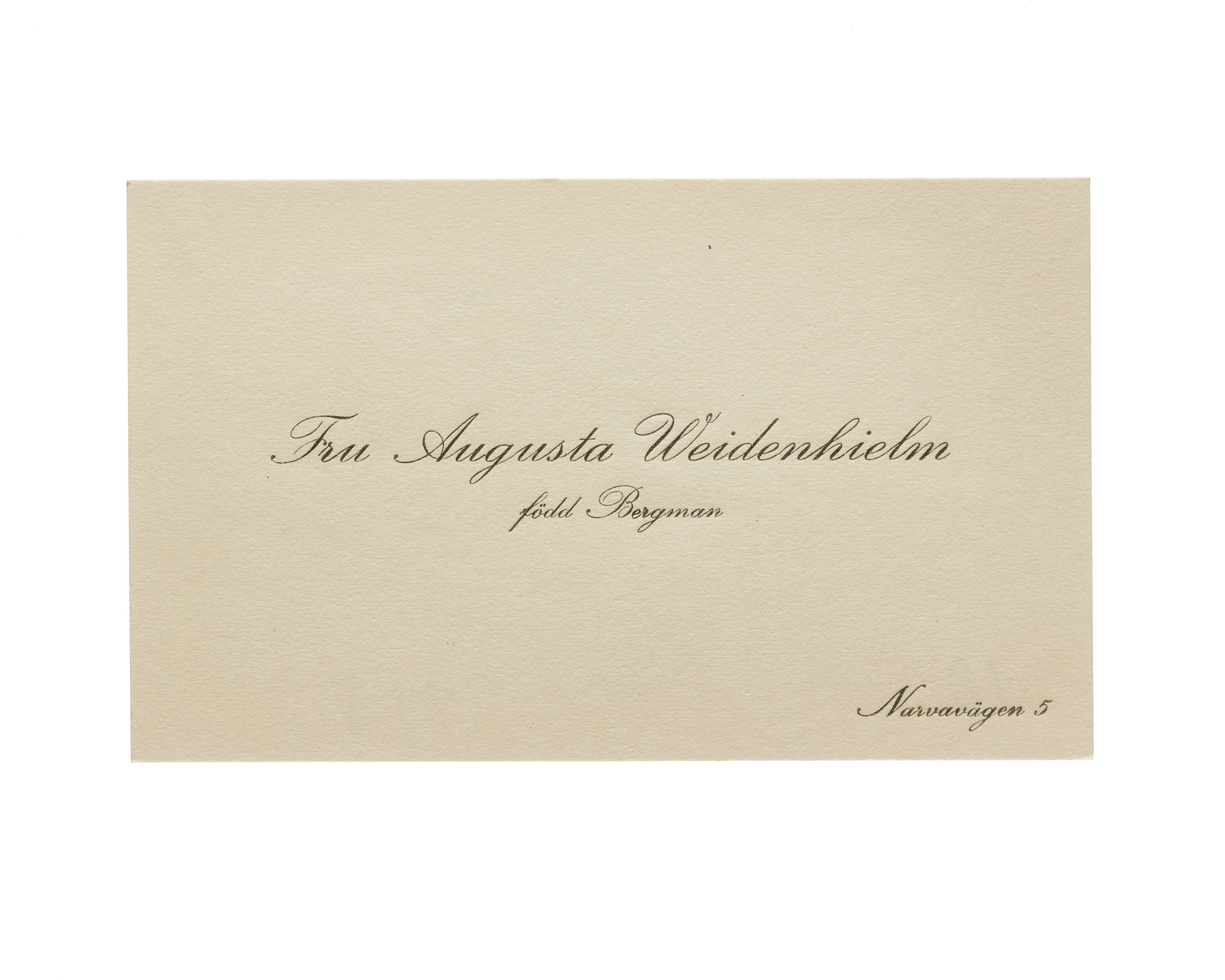 Visitkort från Fru Augusta Weidenhielm, f. Bergman.