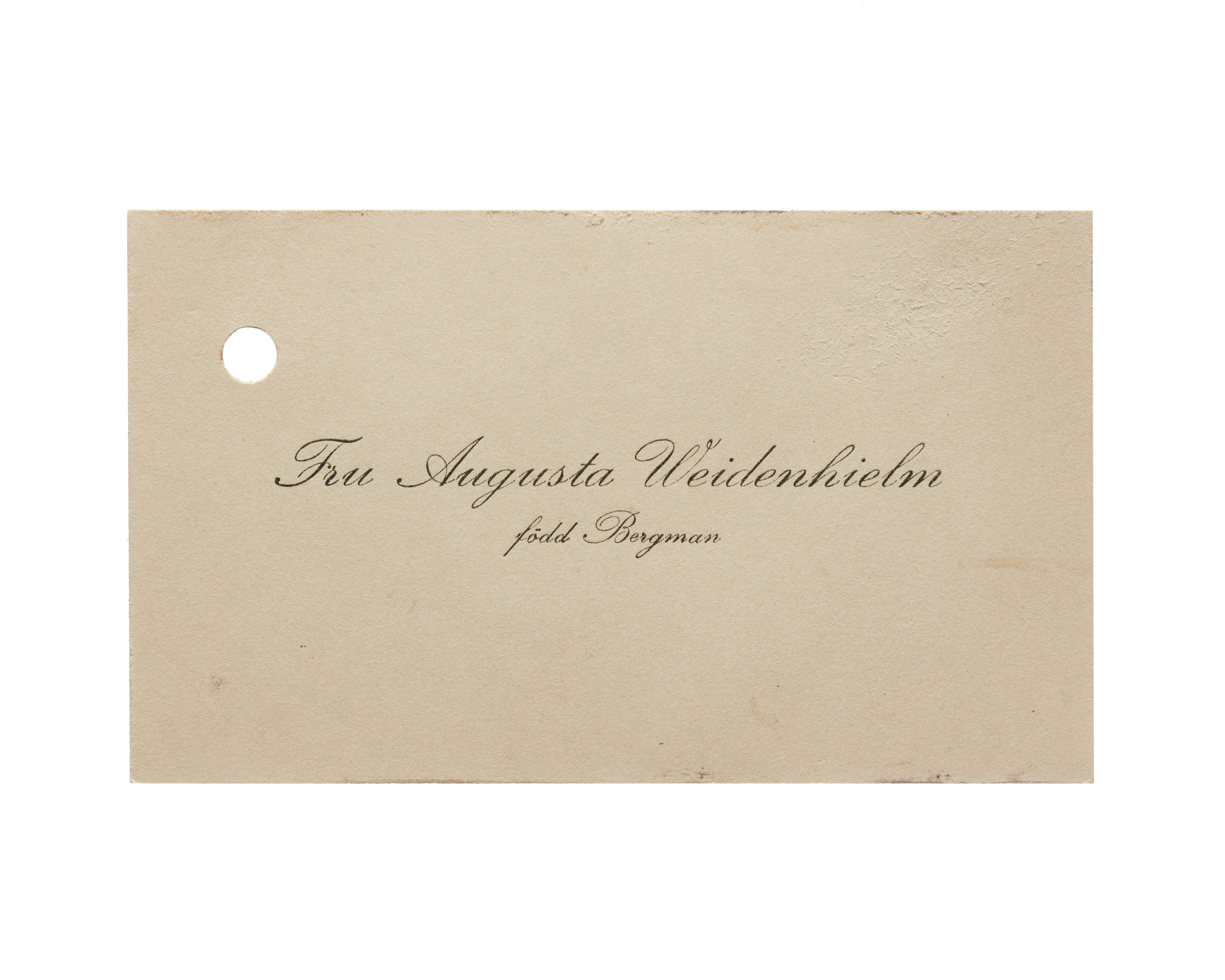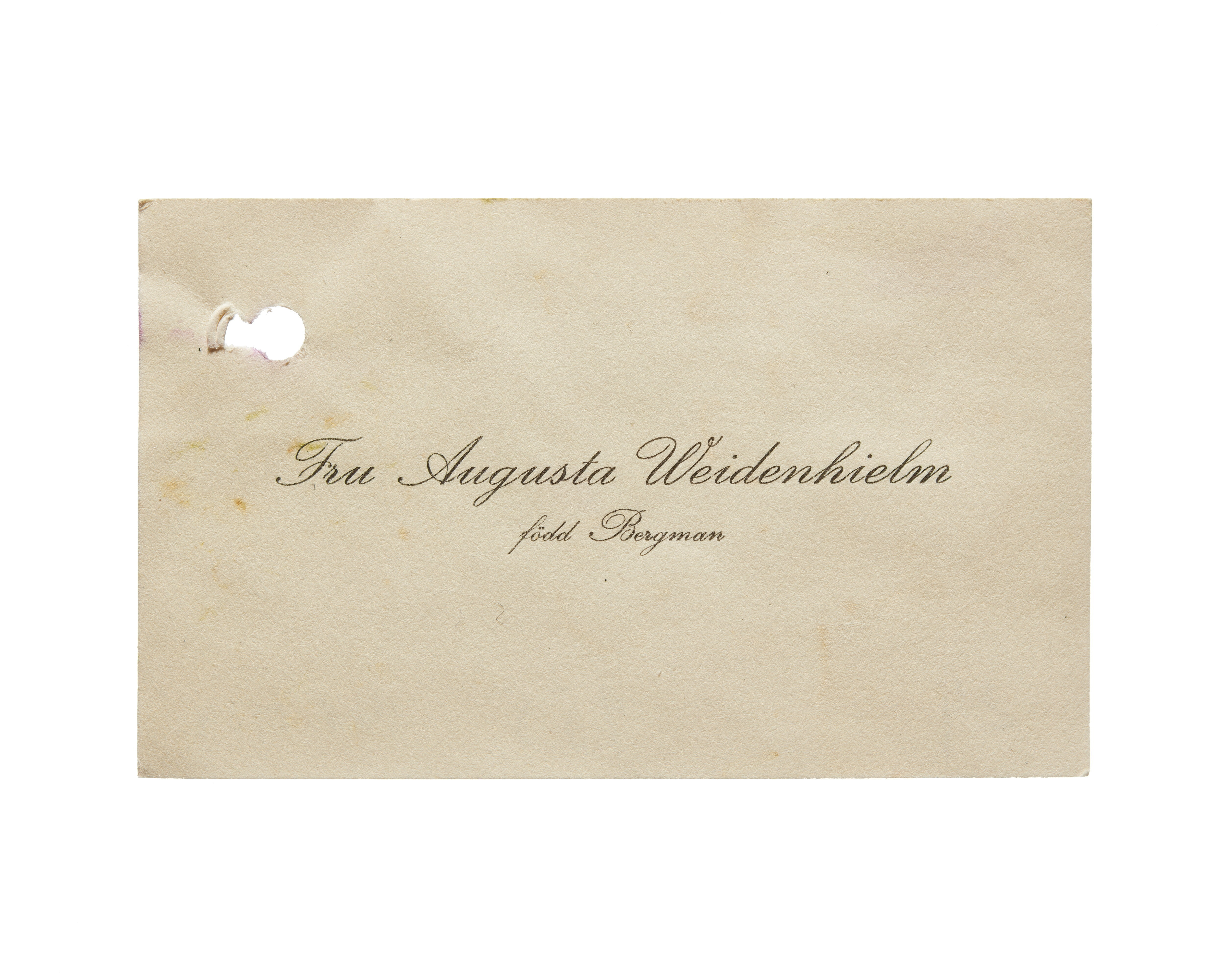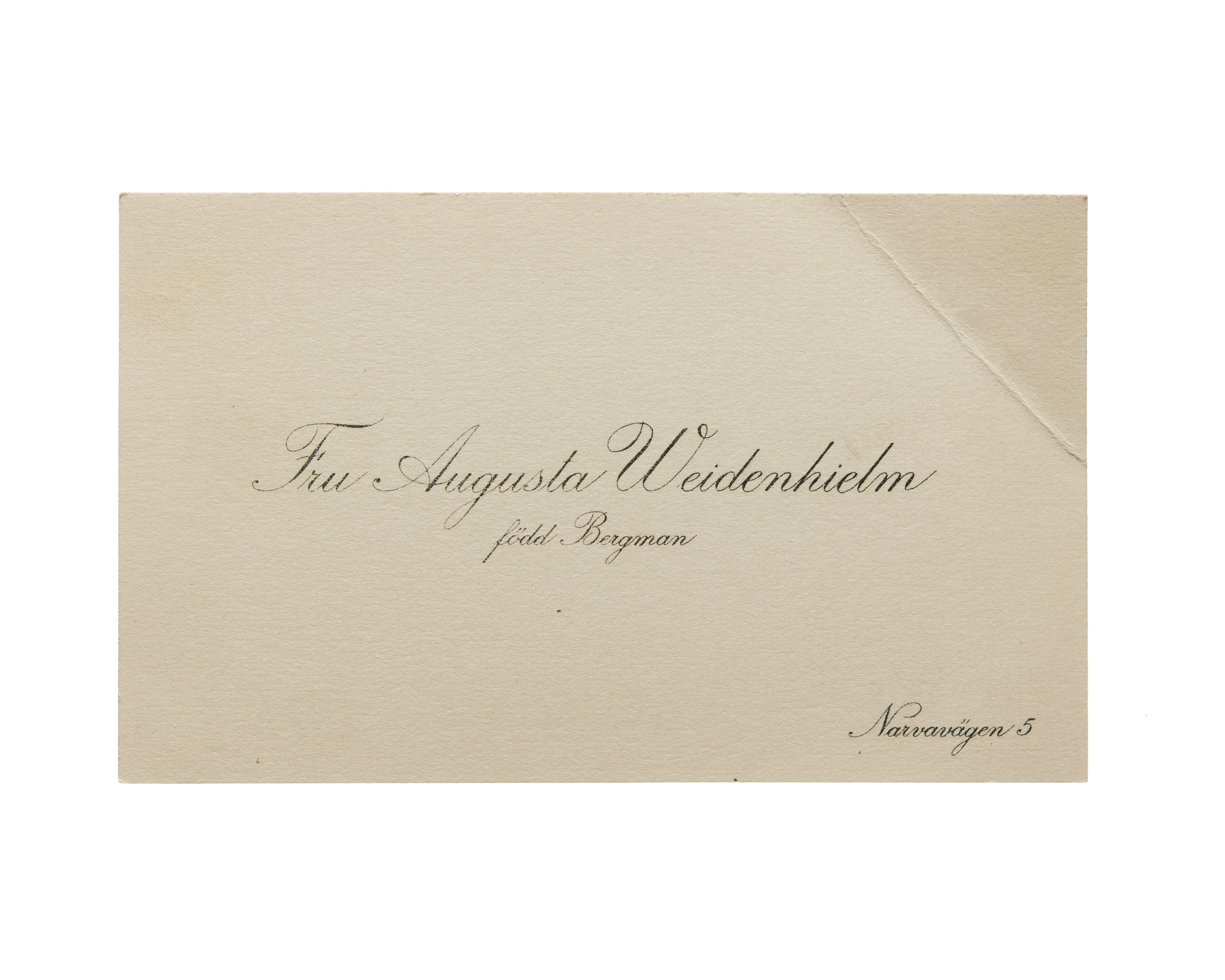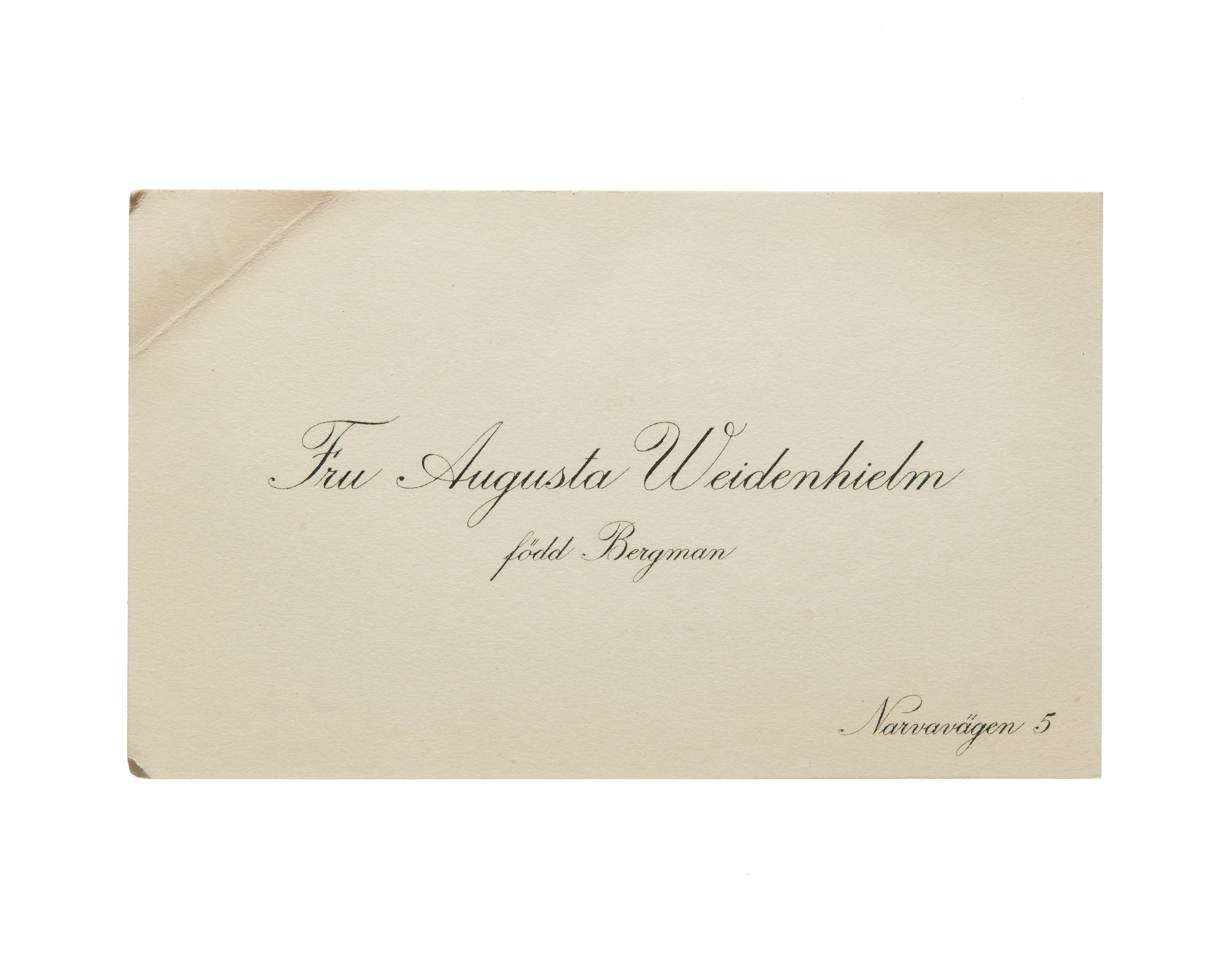 Visitkort från Fru Augusta Weidenhielm, f. Bergman.