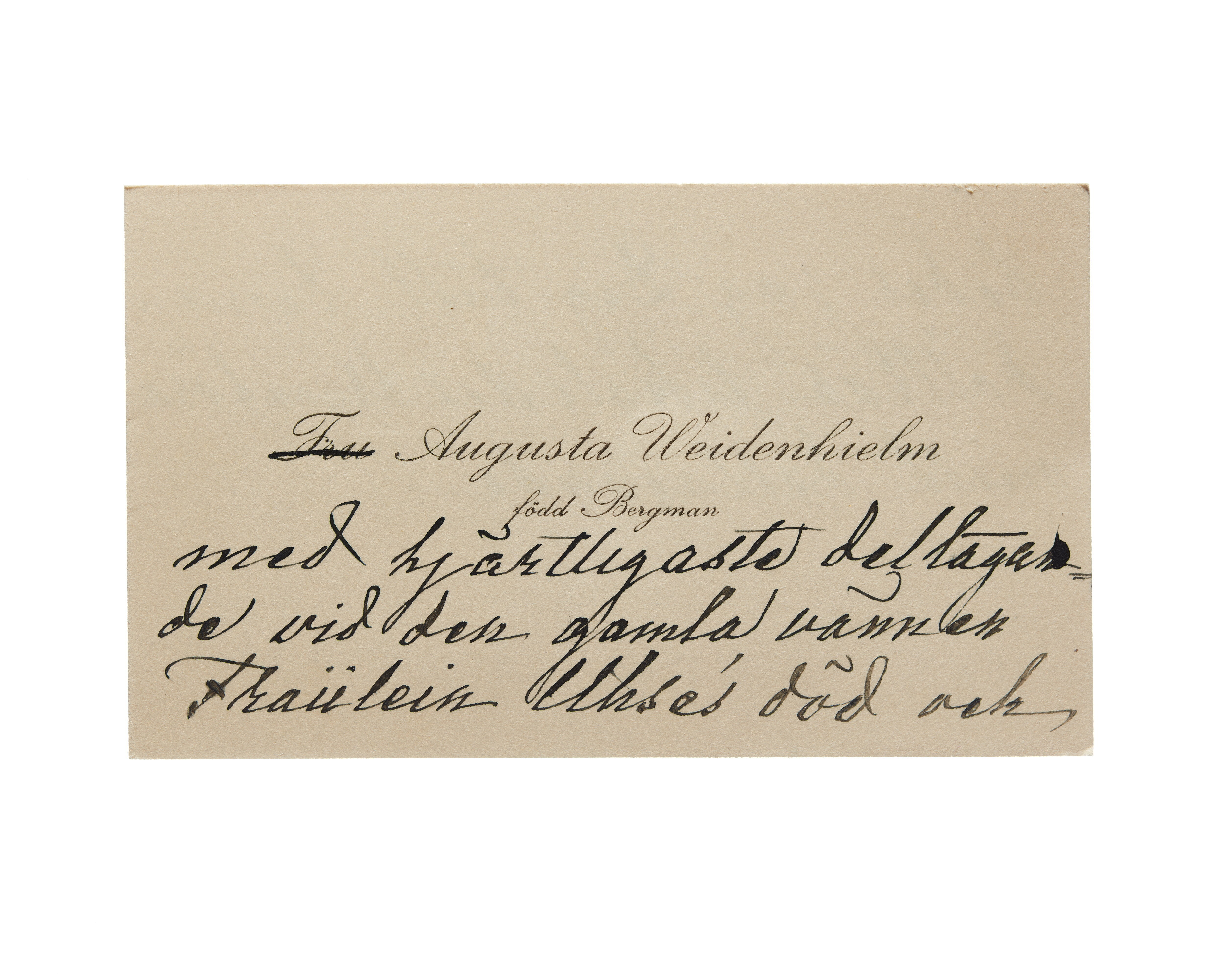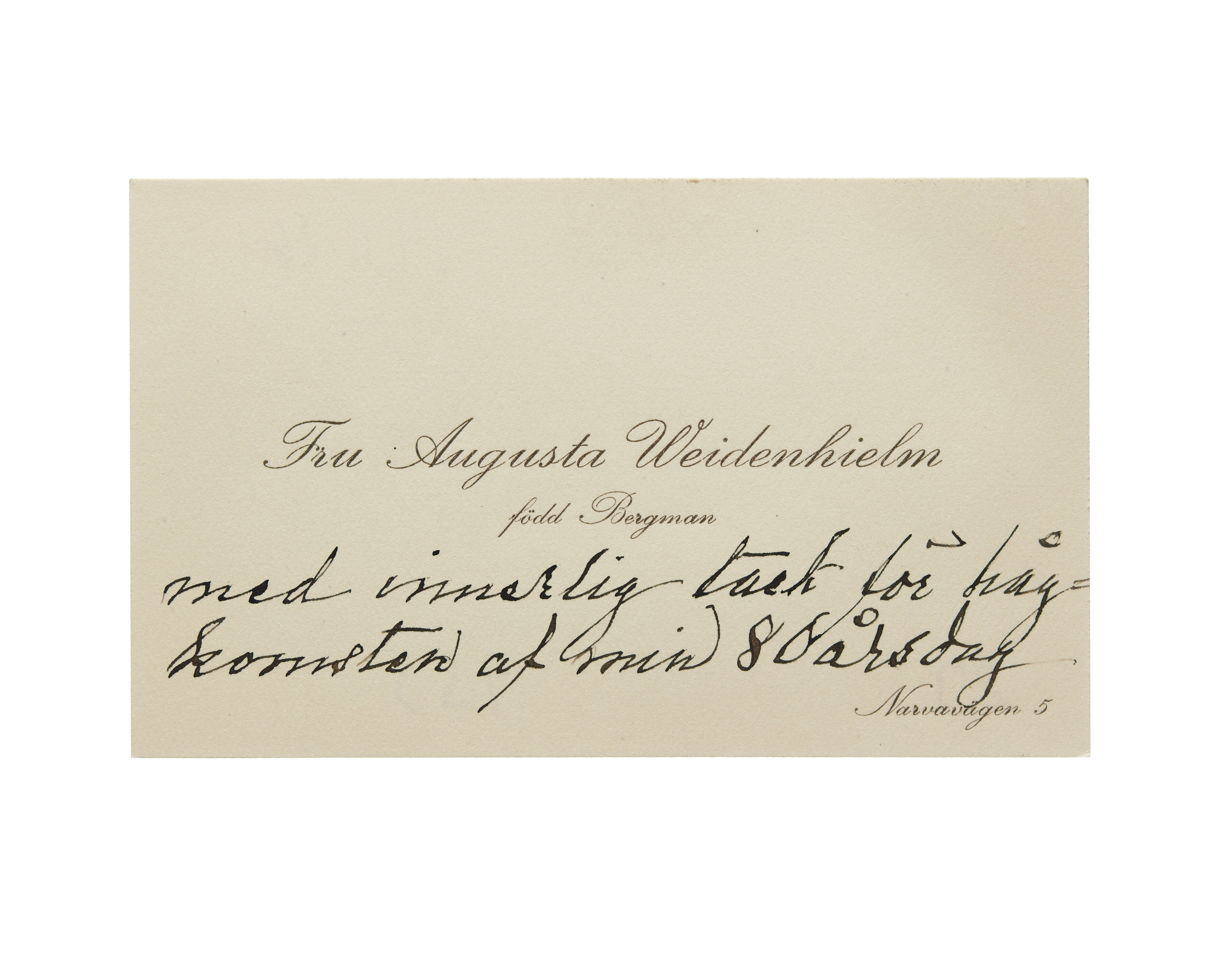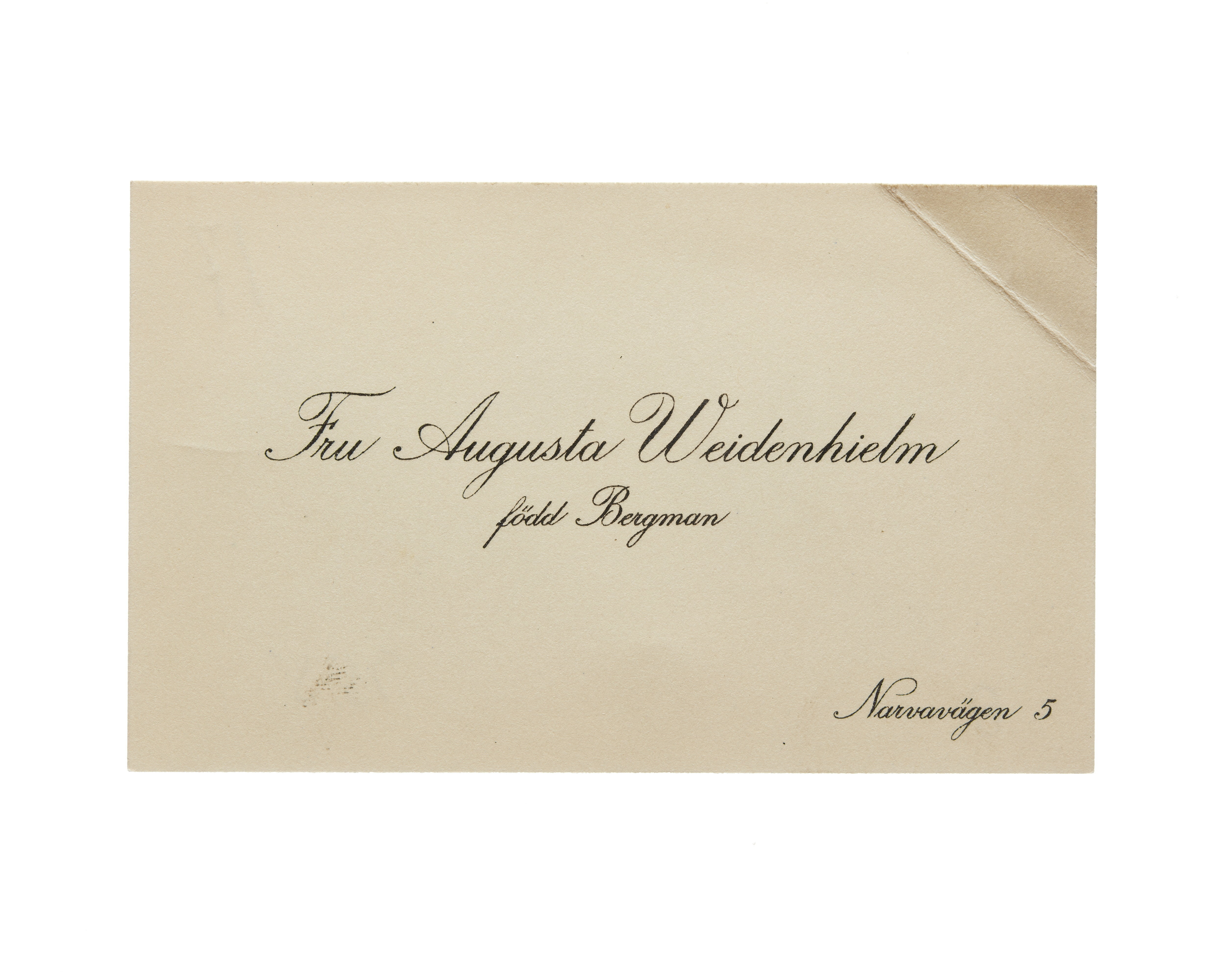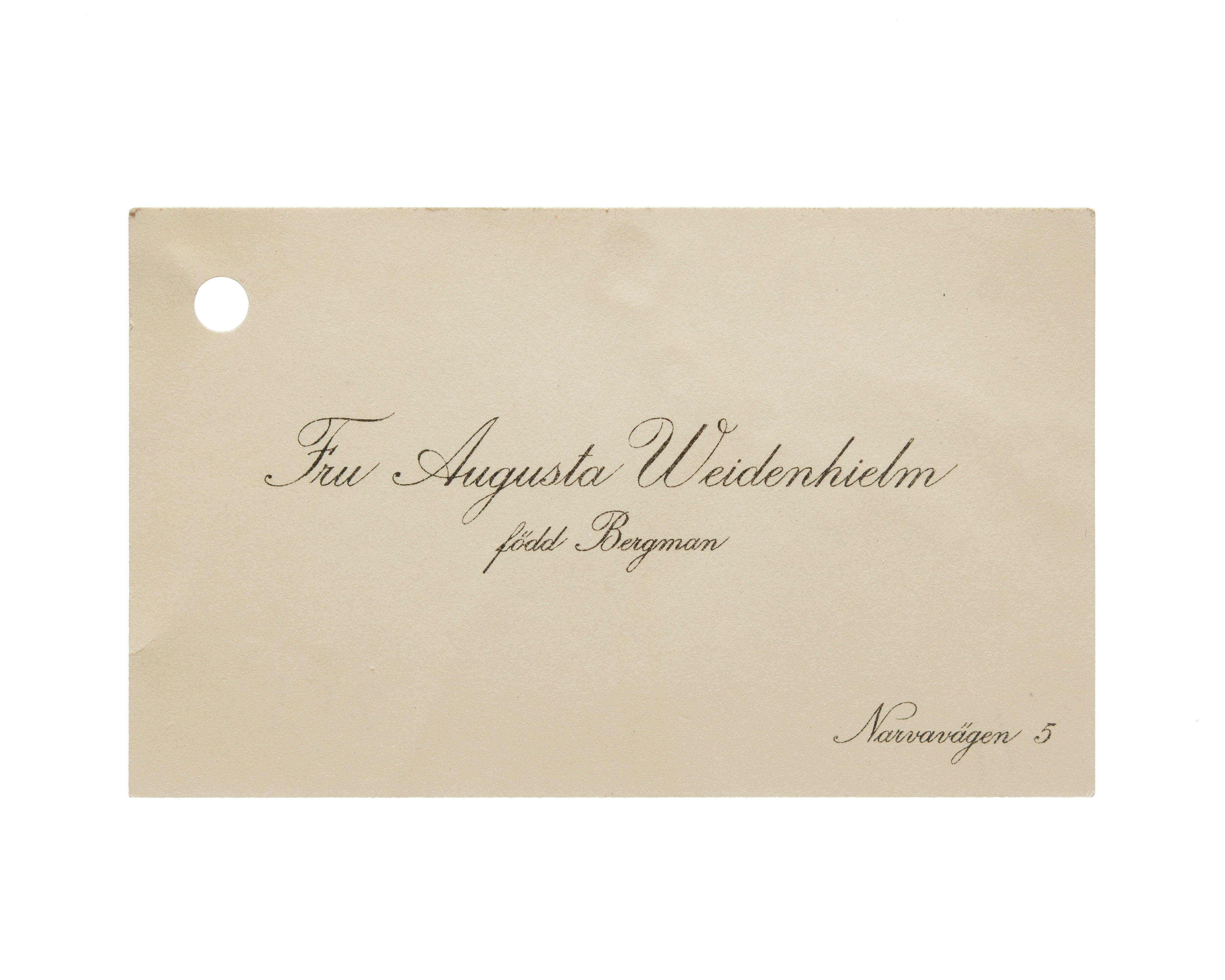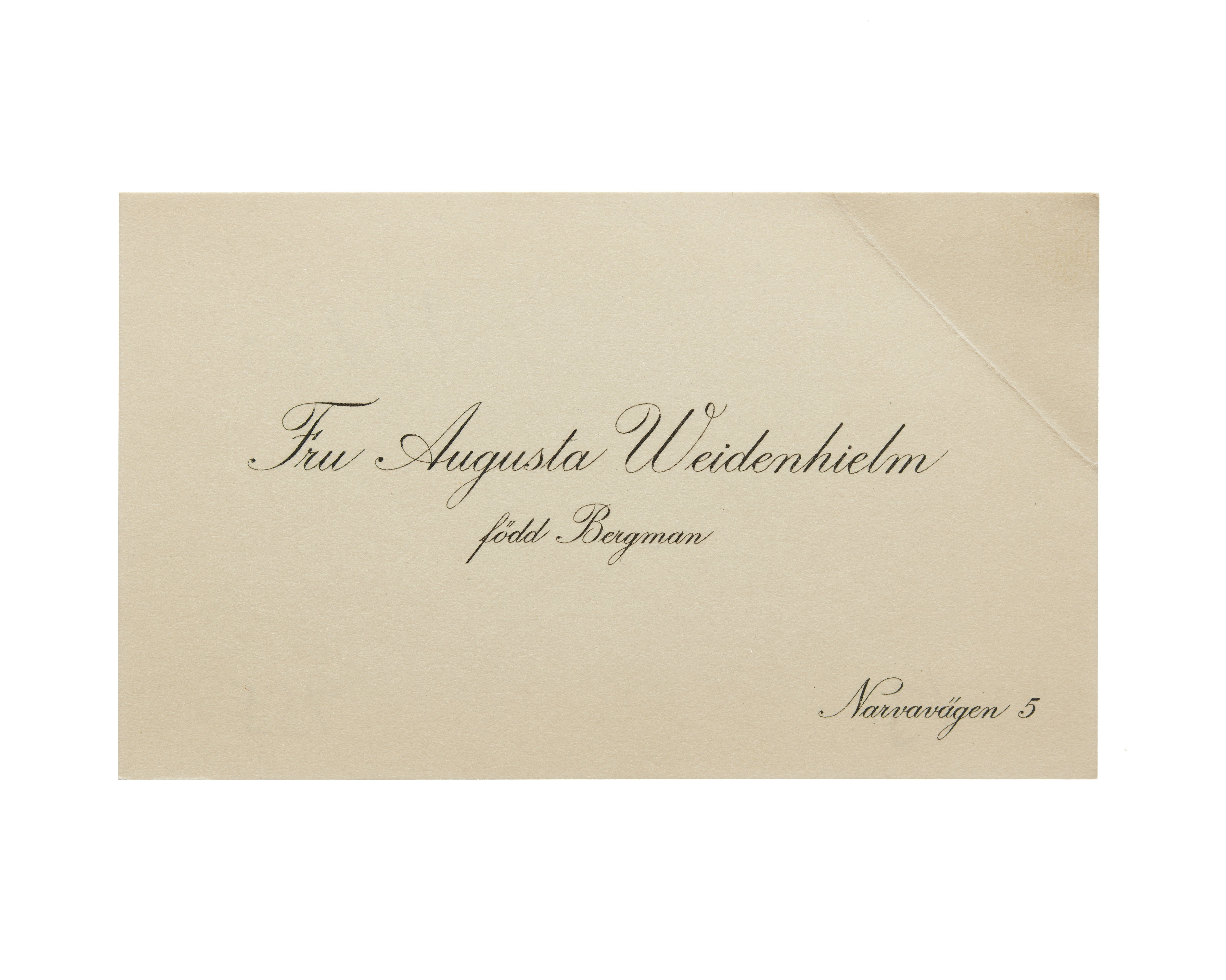 Visitkort från Fru Augusta Weidenhielm, f. Bergman.