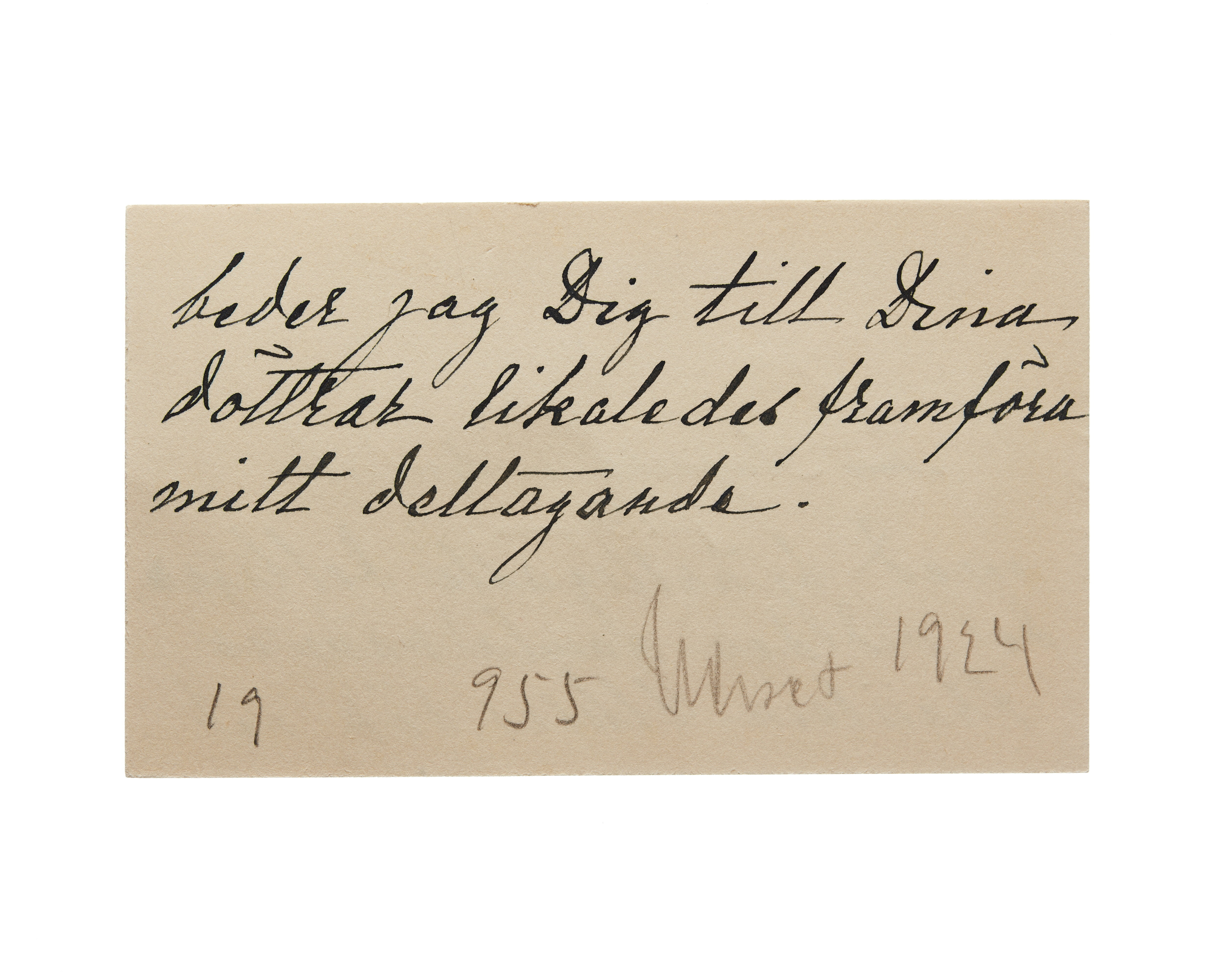 Tjugofyra visitkort från Fru Augusta Weidenhielm, f. Bergman. Första kortet daterat 1914, vikt i vänstra sidan. Adress (nedre högra hörnet) Narvavägen 5. Andra kortet daterat 10.06.1915. Handskrift "med varmaste lyckönskningar på Guldbröllopsdagen". Överlämnat i samband med Wilhelmina och Walter von Hallwyls guldbröllop år 1915. Tredje kortet daterat 1915, vikt i övre högra hörnet. Överlämnat i samband med Wilhelminas bilolycka år 1915. Fjärde kortet daterat 1915, vikt i övre högra hörnet. Överlämnat i samband med Wilhelminas bilolycka år 1915. Femte kortet daterat 1916. Sjätte kortet daterat 1916, vikt i övre högra hörnet. Sjunde kortet daterat 1916, vikt i övre vänstra hörnet. Åttonde kortet daterat 1917, vikt i övre högra hörnet. Nionde kortet daterat 1917, vikt i övre högra hörnet. Tionde kortet daterat 1918, vikt i övre högra hörnet. Elfte kortet daterat 26.01.1919. Tolfte kortet daterat 1919, vikt i övre högra hörnet. Trettonde kortet daterat 1920, vikt i övre högra hörnet. Fjortonde kortet daterat 1920, vikt i övre högra hörnet. Femtonde kortet daterat 1921, vikt i övre högra hörnet. Sextonde kortet daterat 1921, vikt i övre högra hörnet. Sjuttonde kortet daterat 1922, vikt i övre högra hörnet. Artonde kortet daterat 1924. Nittonde kortet daterat 1924. Handskrift "med hjärtligaste deltagande vid den gamla vännen Fraülein Uhses död och (forts. baksida) beder jag Dig till Dina döttrar likaledes framföra mitt deltagande". Tjugonde kortet daterat 1924. Tjugoförsta kortet daterat 1921. Tjugoandra kortet daterat 1925, vikt i övre högra hörnet. Tjugotredje kortet daterat 1926. Handskrift "med innerlig tack för hågkomsten af min 80årsdag". Tjugofjärde kortet daterat 1929.
