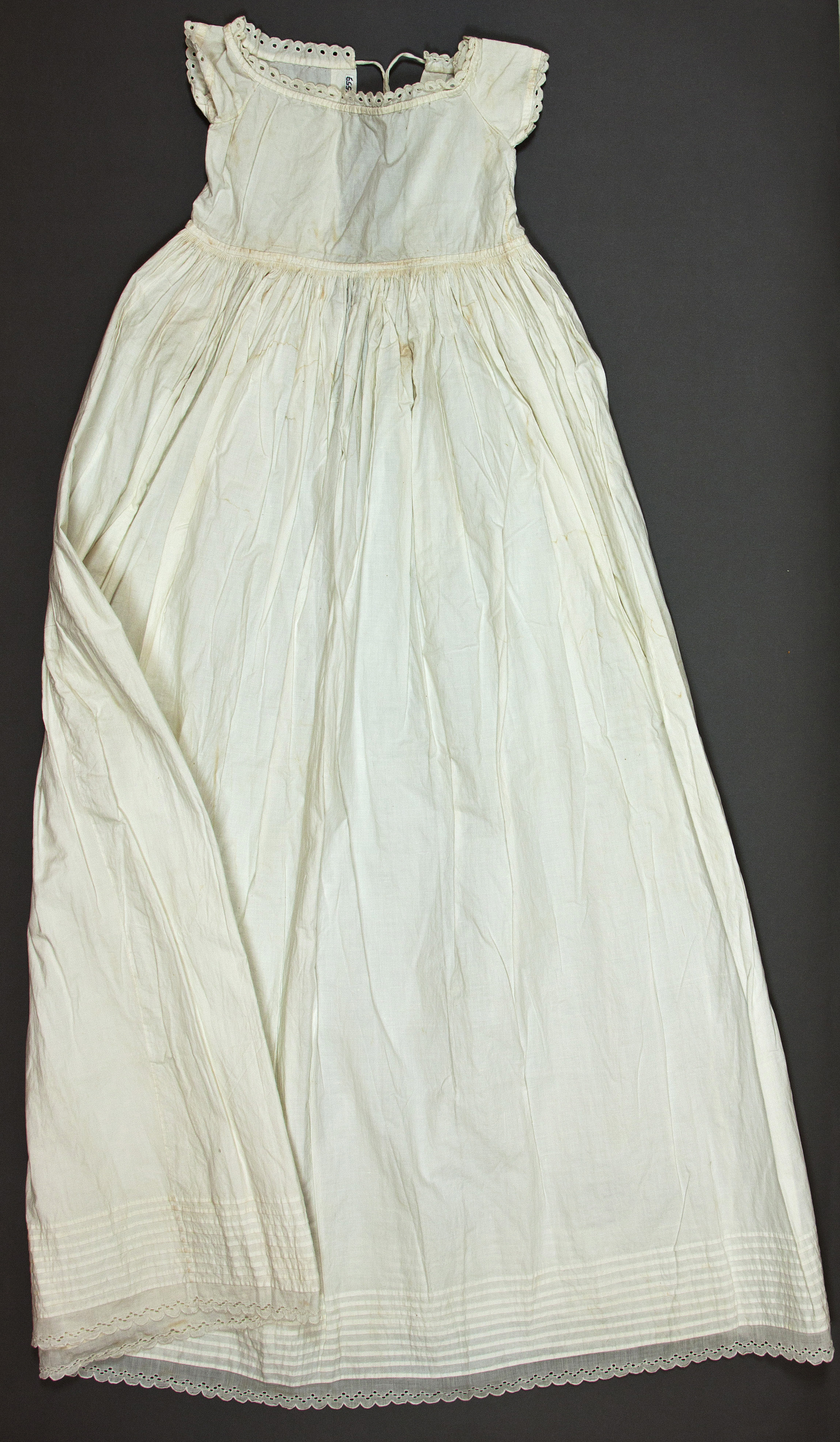 Barnunderklänning av vit bomull. En kort överdel med korta ärmar och en rundad urringning. Kjolen är lång och vid och något veckad i midjan. Ett smalt bomullsband skiljer mellan kjol och överdel. Spetsar föreställande blommor, i urringningen, på ärmarna samt på kjolens nedersta kant. Smala nedsydda veck på kjolen.
