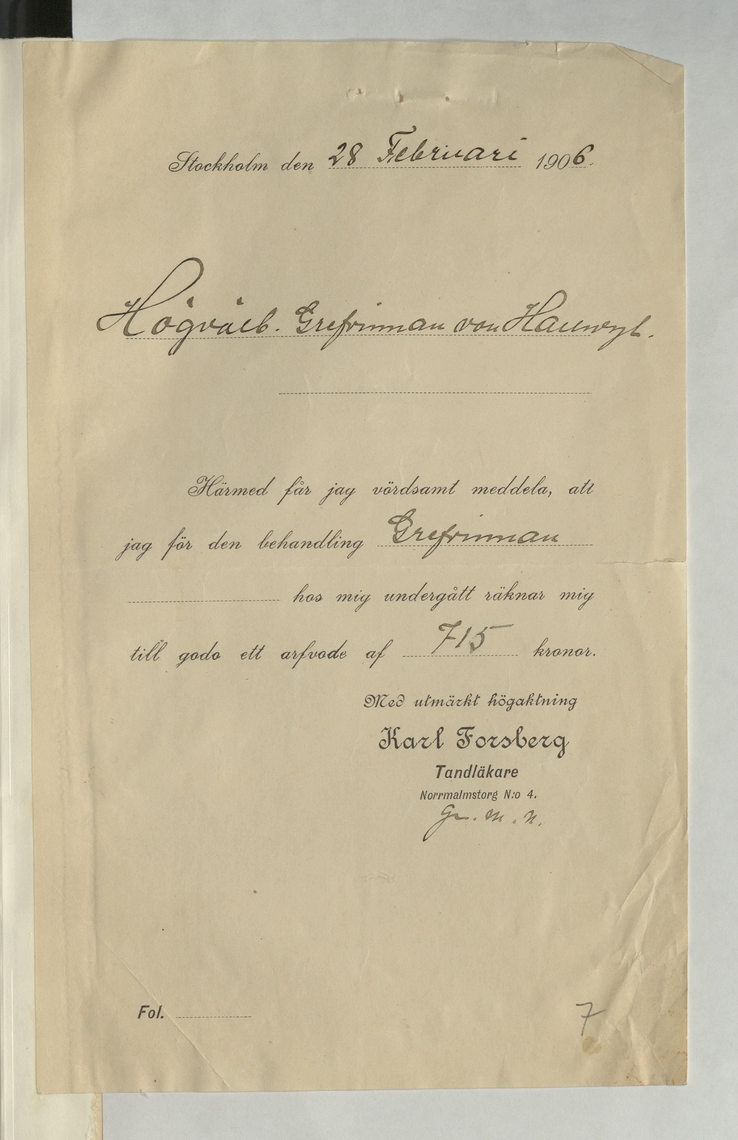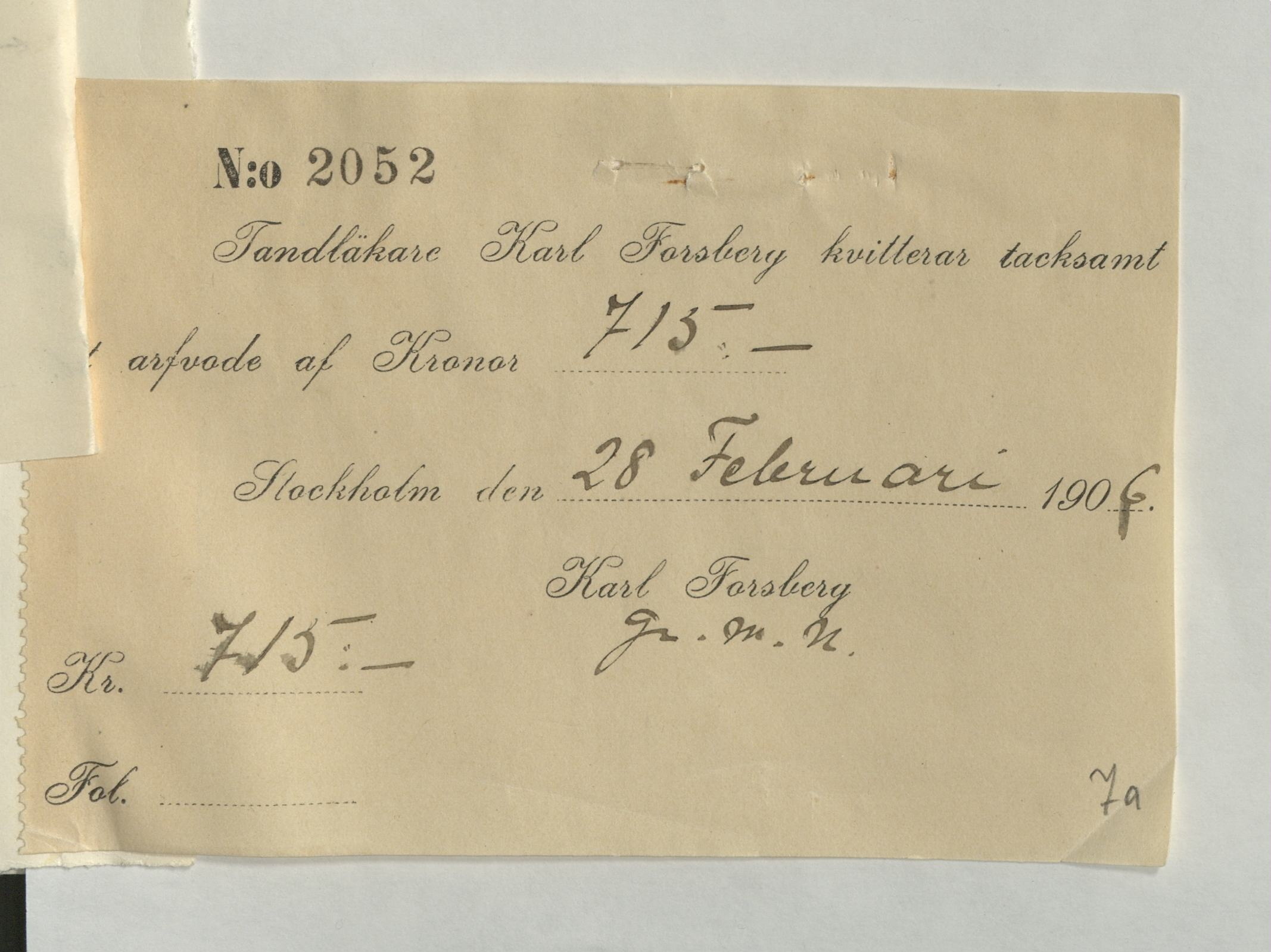 Räkning för tandläkarbesök. Utdrag ur katalogverket: "Karl Forsberg. 1900 — 1922."