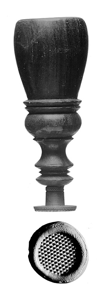 Rund tunn skiva med pyramidrefflad undersida (avtryck se Planschverket); på översidan en kort cylindrisk hals. Skaft av brunt trä, svarvat och polerat, nedre delen profilerad samt avsmalnande nedåt, övre delen päronformig med tvär överända. Tillhört inventarierna på Wilh. H. Kempes kontor, inrymt i Schinkelska huset, dåvarande adress Kornhamnstorg 2 (f. d. Lilla Nygatan 29, nuvarande Kornhamnstorg 4), Stockholm, 1843 -1883; därefter på firman Wilh. H. Kempes (innehavare Walther von Hallwyl och Johanna Kempe, f. Wallis) kontor, Blasieholmstorg II, 1884 - 30 September 1896, och Hamngatan 4, 1 Oktober 1896 - 1909.