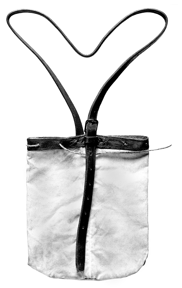 TORNISTER Av vattentätt vitt linnetyg samt läder. Avlång påse med svagt rundade bottenhörn, hopsytt längs ena sidan och botten. Kring övre kanten en på utsidan påsydd svart rem, i denna och tyget tolv små runda hål, i dessa trätt ut och in ett grovt snöre varmed tornistern hop- drages. Höjd: 38 cm Rem, längd: 175 cm Inköpt av Walther von Hallwyl hos Joh. Palmgren, Vagn- och Sadelmakeri, Stockholm.