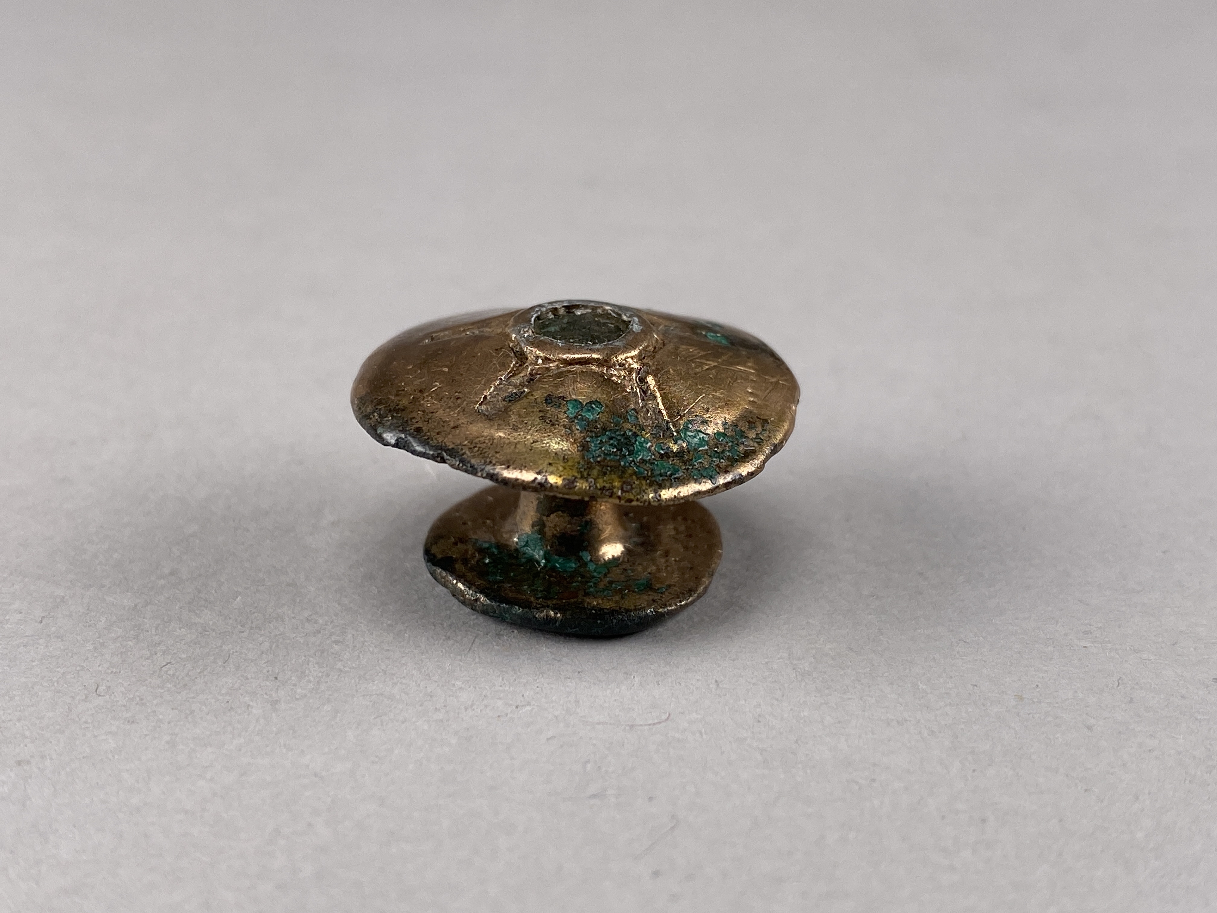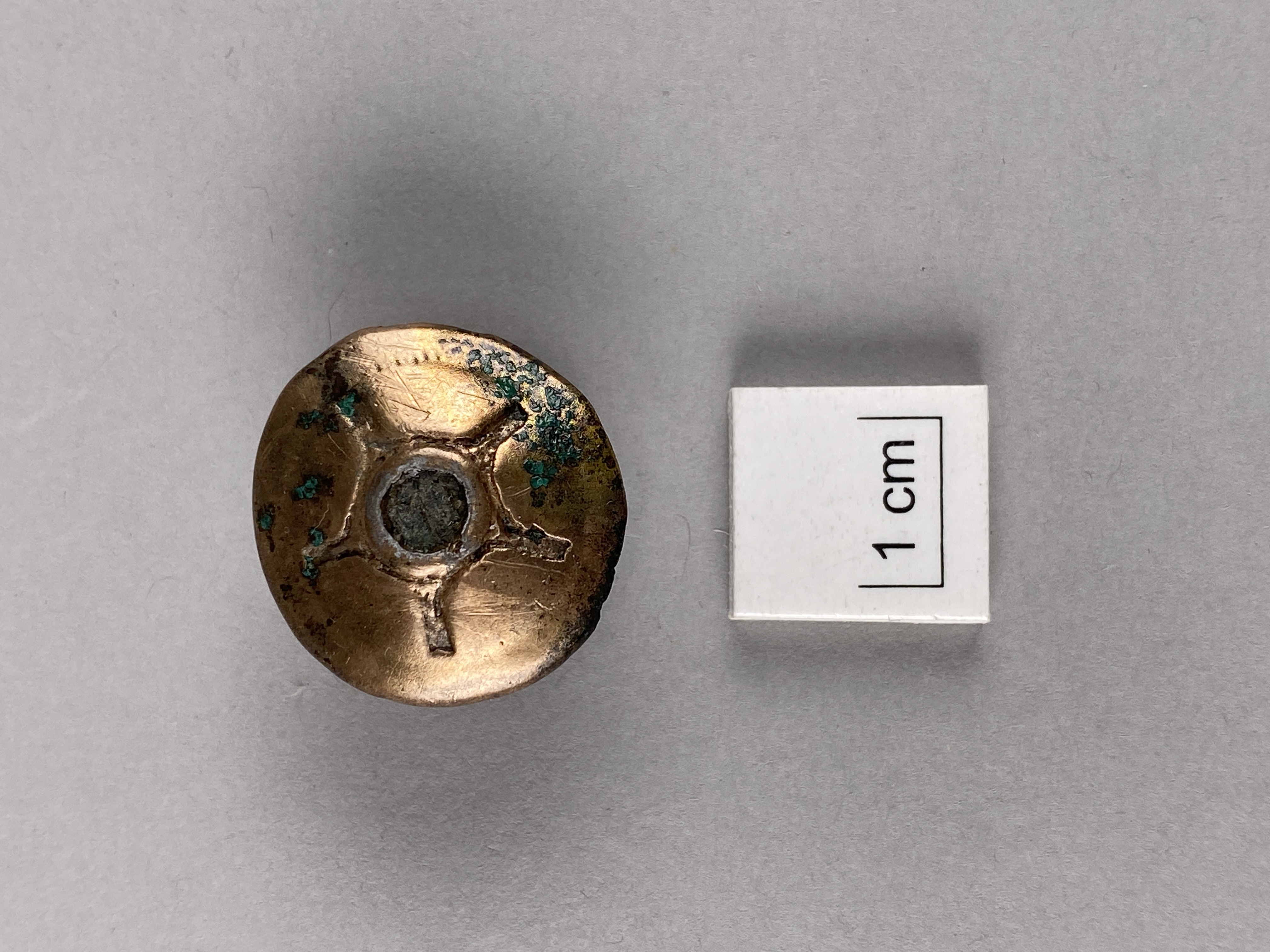 Dubbelknapp av brons. Överskivan ornerad med fördjupat stjärnmönster, i mitten en liten rund fördjupning.