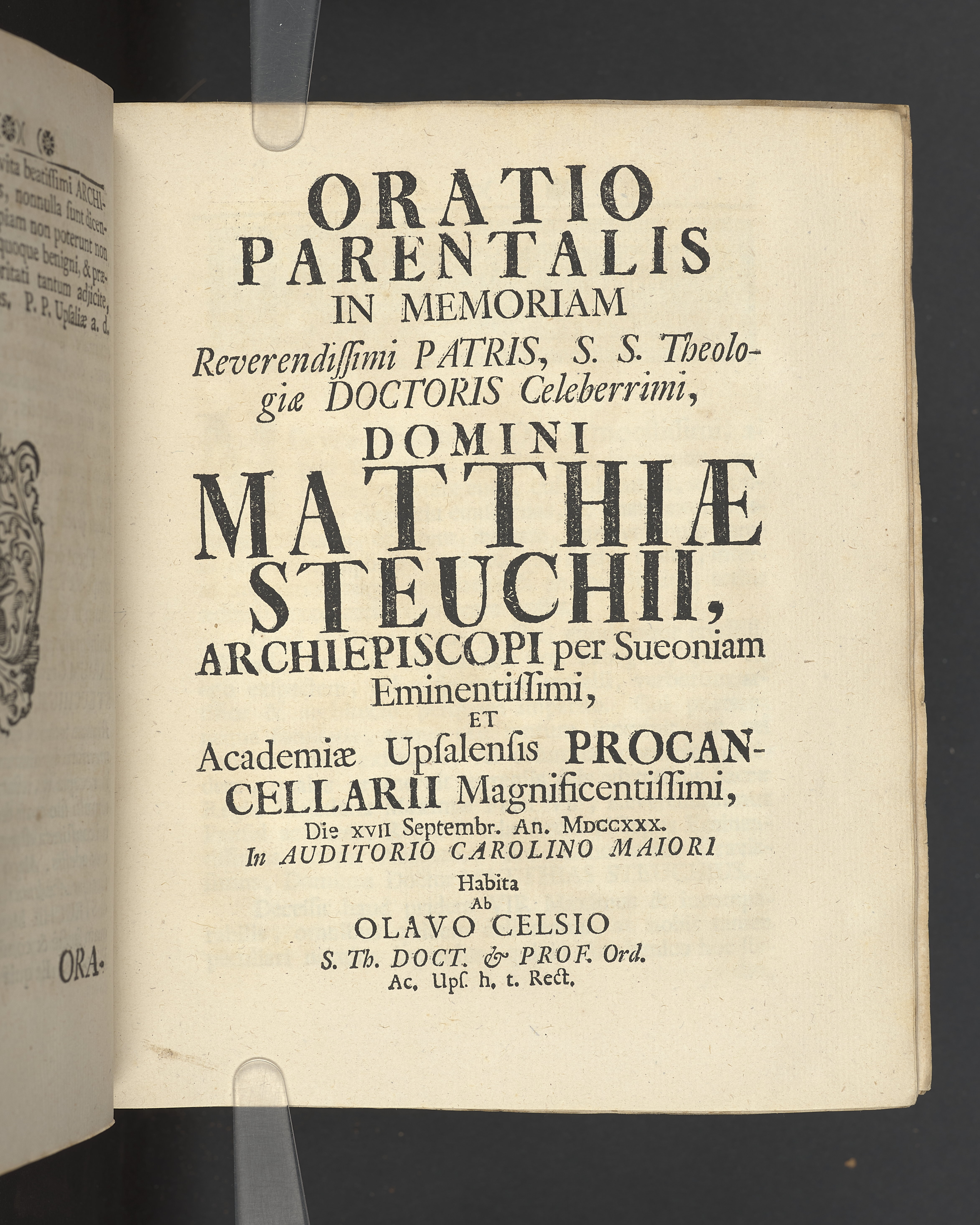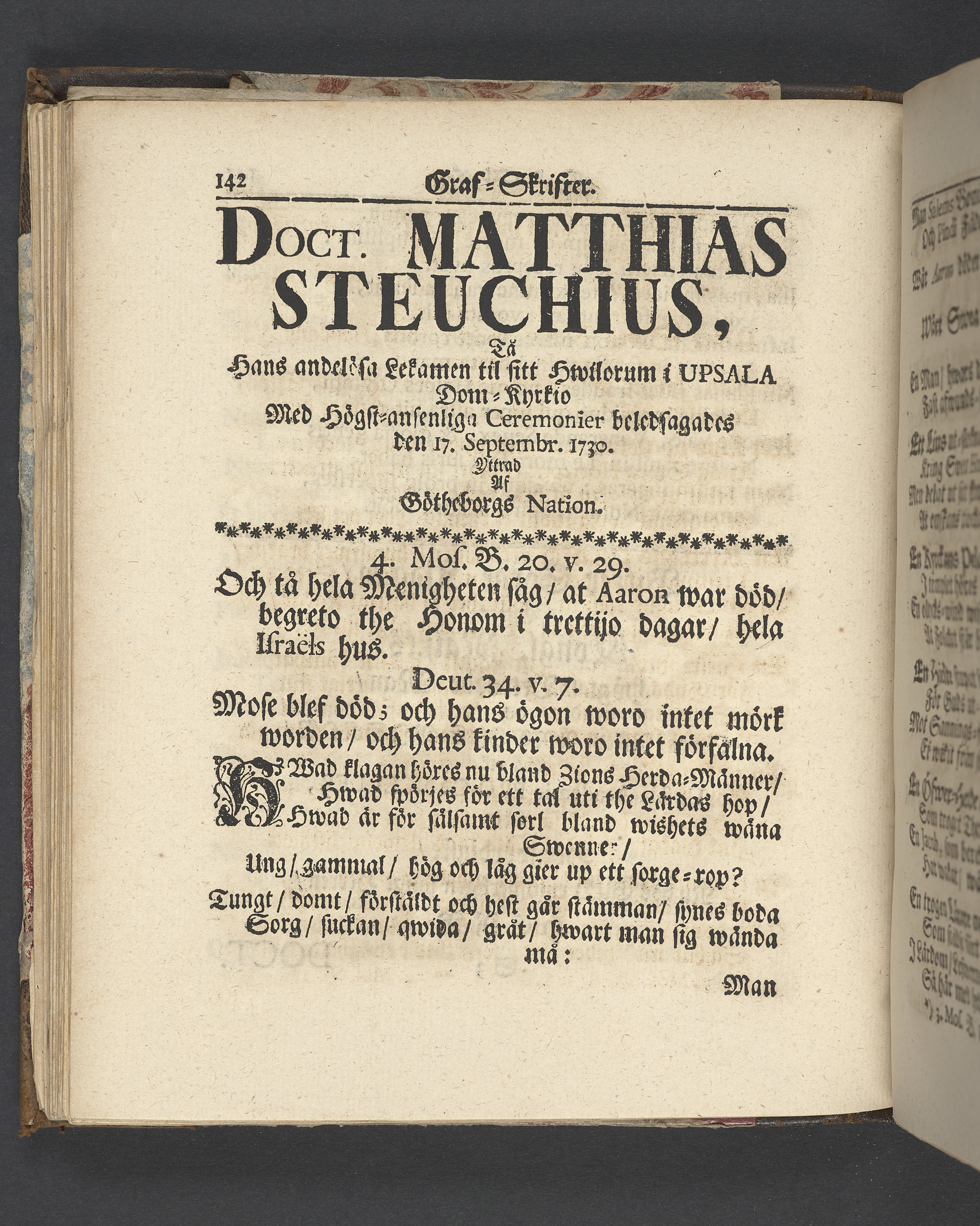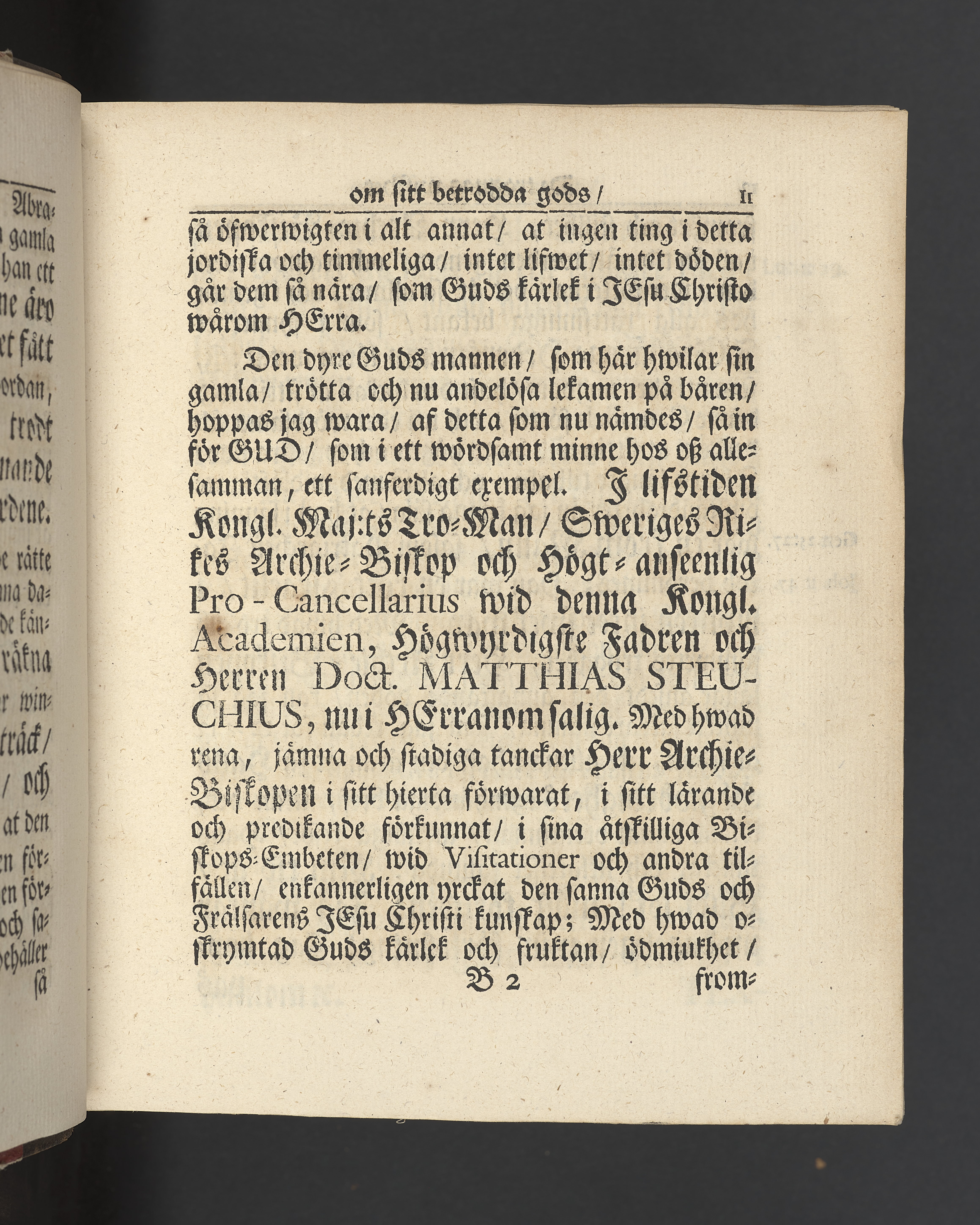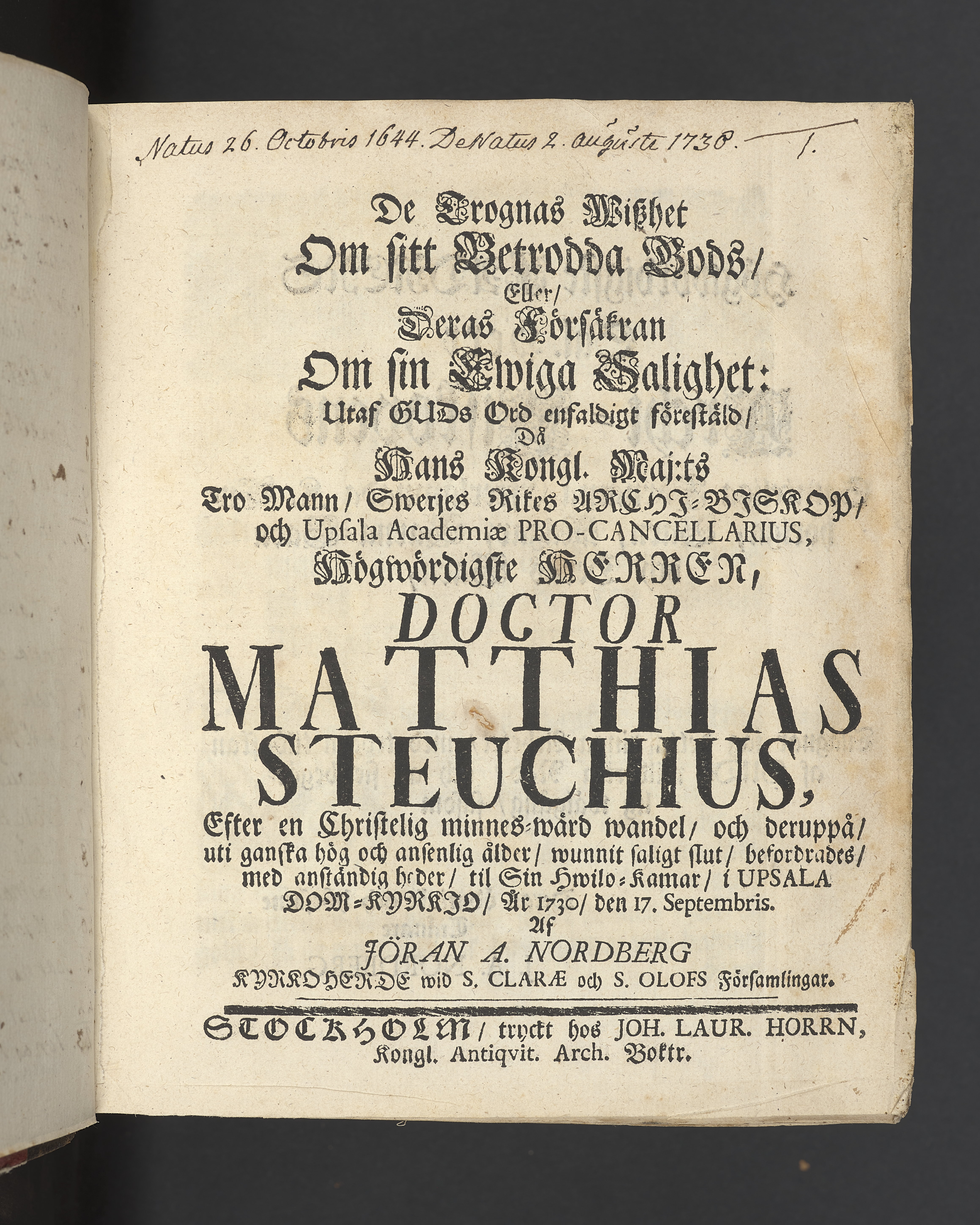 De trognas wiszhet om sitt betrodda gods, eller, deras försäkran om sin ewiga salighet: utaf Guds ord enfaldigt förestäld, då hans kongl. maj:ts tro mann, Swerjes rikes archi-biskop ... Matthias Steuchius, efter en christelig minnes wärd wandel, och deruppå, uti ganska hög och ansenlig ålder, wunnit saligt slut, befordrades, med anständig heder, til sin hwilo-kamar, i Upsala dom-kyrkio, år 1730, den 17. septembris. Af Jöran A. Nordberg ... Stockholm, tryckt hos Joh. Laur. Horrn, kongl. antiqvit. arch. boktr.