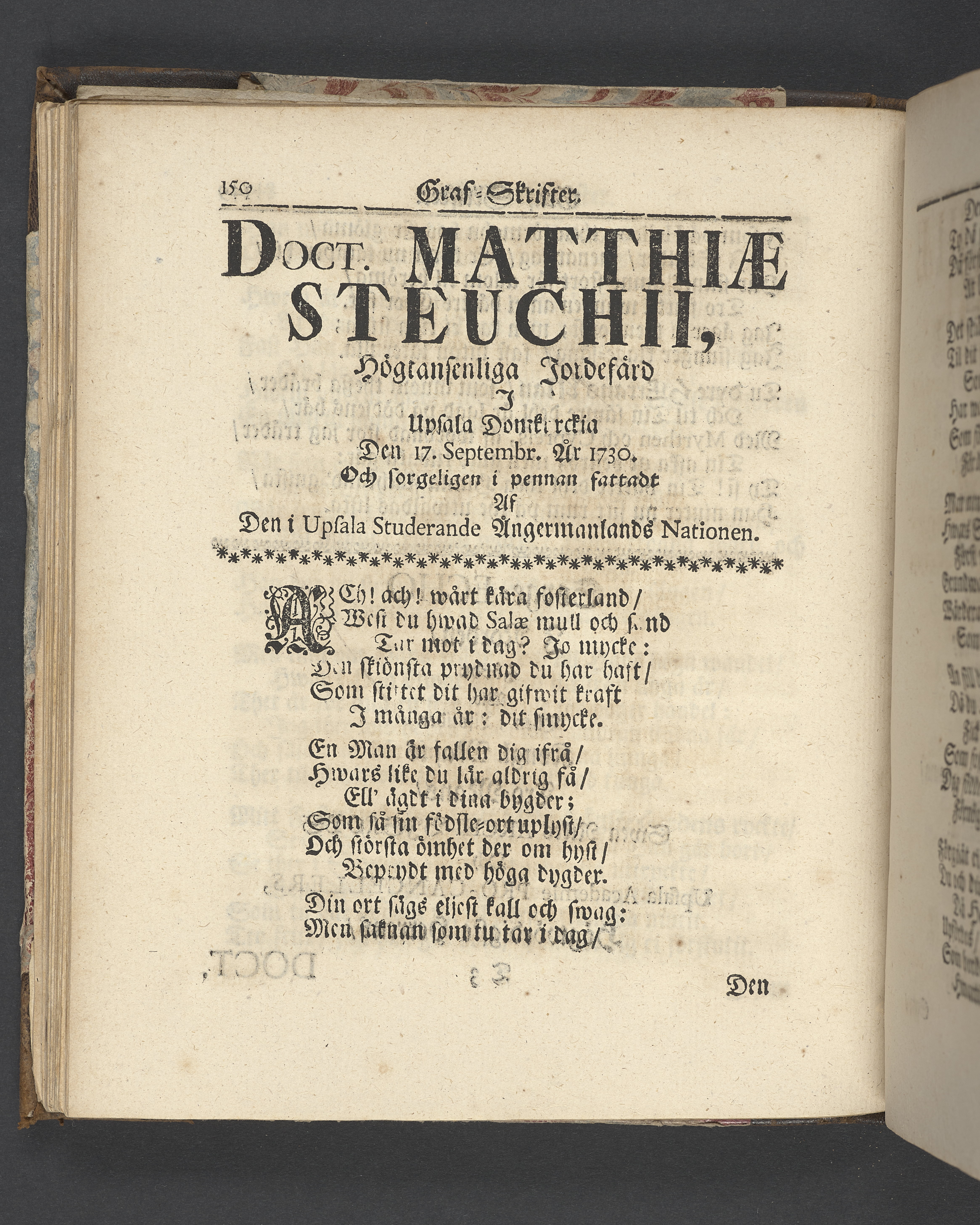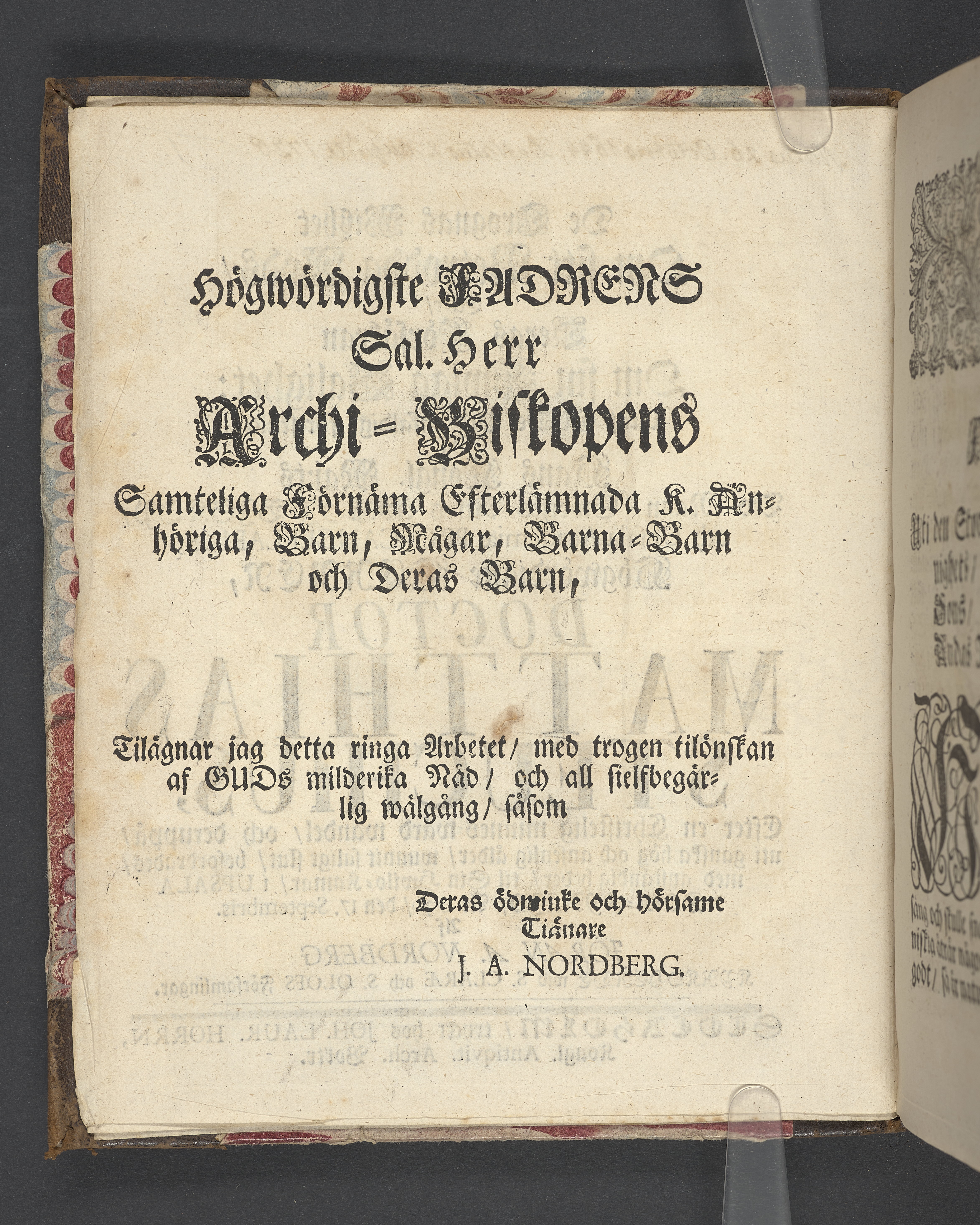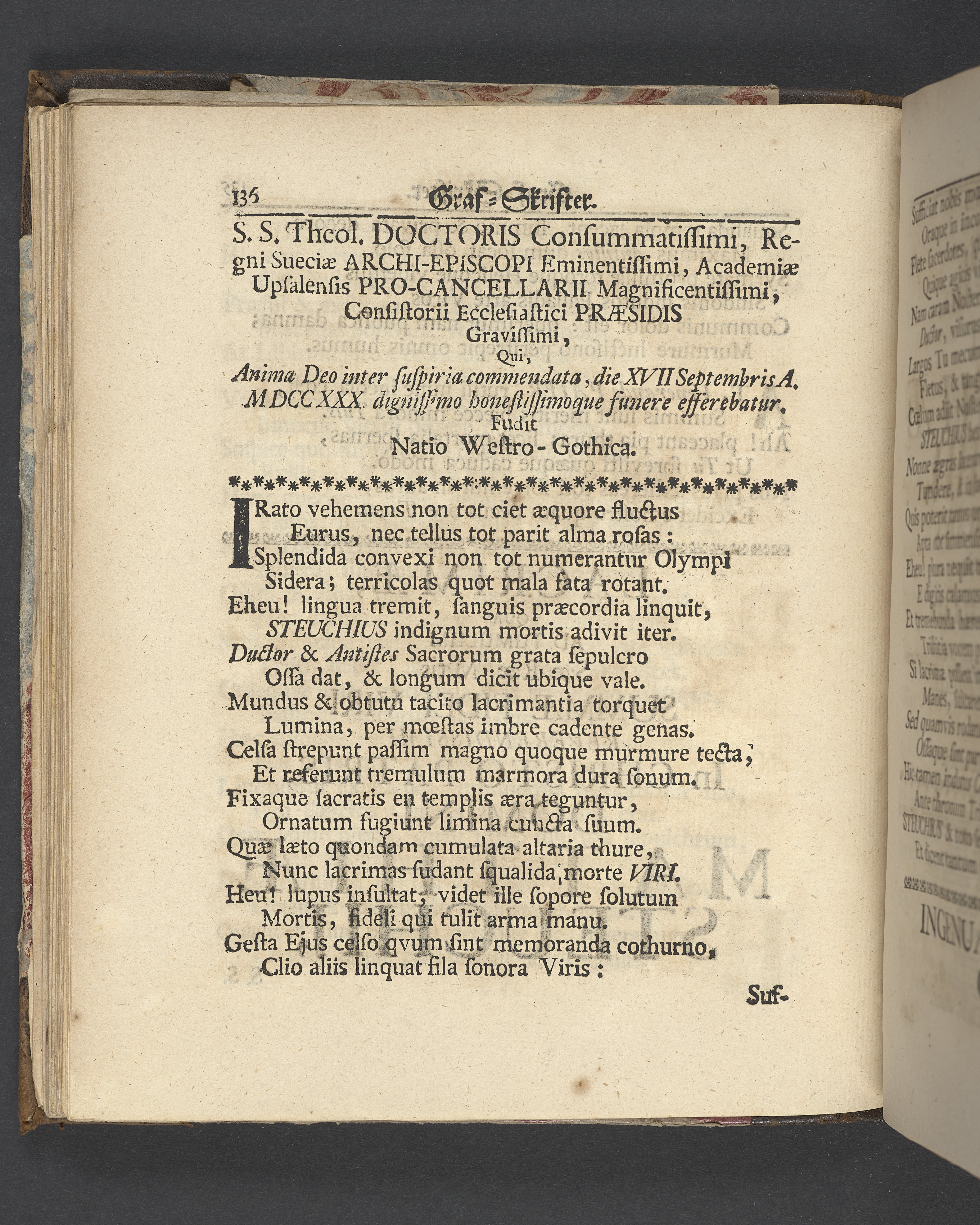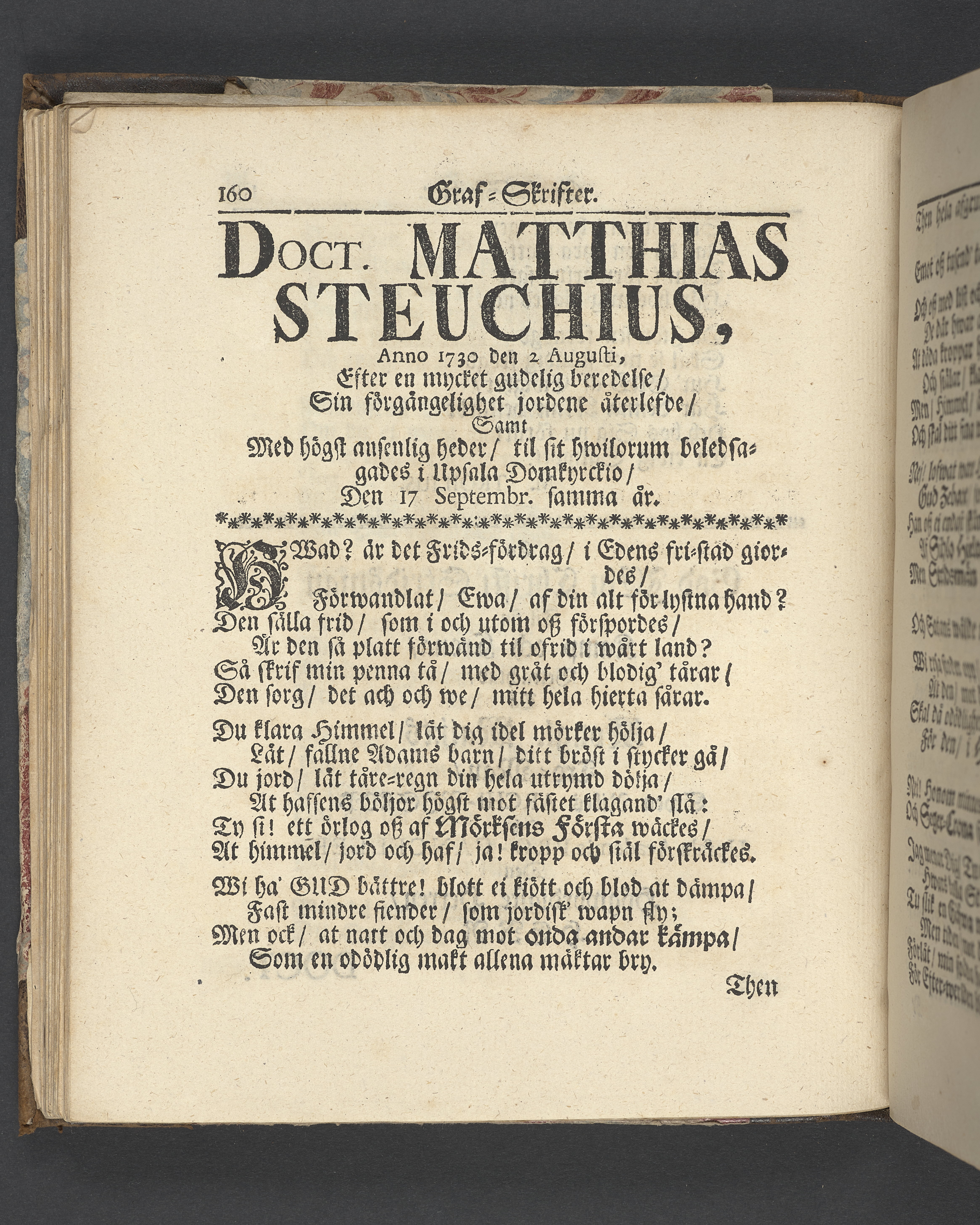 De trognas wiszhet om sitt betrodda gods, eller, deras försäkran om sin ewiga salighet: utaf Guds ord enfaldigt förestäld, då hans kongl. maj:ts tro mann, Swerjes rikes archi-biskop ... Matthias Steuchius, efter en christelig minnes wärd wandel, och deruppå, uti ganska hög och ansenlig ålder, wunnit saligt slut, befordrades, med anständig heder, til sin hwilo-kamar, i Upsala dom-kyrkio, år 1730, den 17. septembris. Af Jöran A. Nordberg ... Stockholm, tryckt hos Joh. Laur. Horrn, kongl. antiqvit. arch. boktr.
