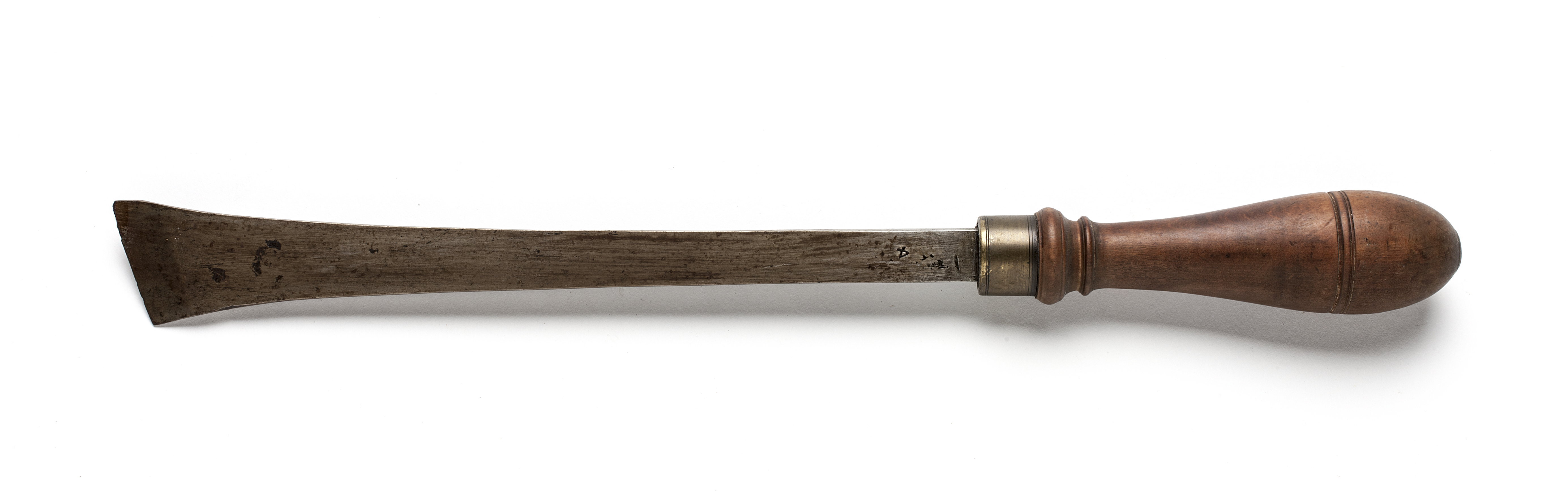 Klinga med rektangulär genomskärning. Stämplat på klingan: "4" med stans nr 5375. Sned egg. Svarvat skaft av päronträ, med två vulster nedtill ("skoklostertyp"). Mässingsring.