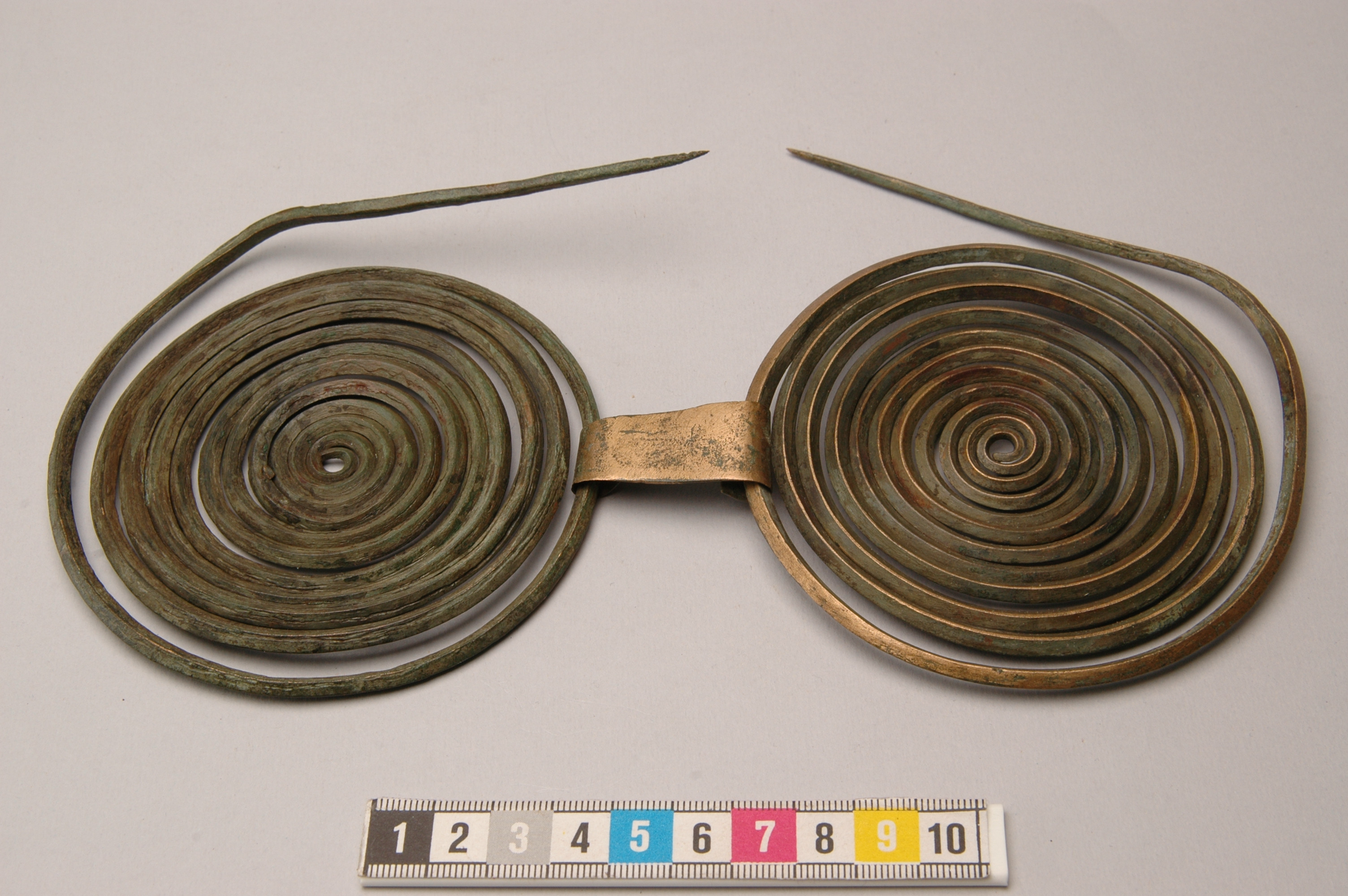 Två nålar av brons med stora spiralformiga huvuden. Nålen är mot spetsen trind men i hela det spiralformiga partiet fyrkantig. Skivorna består av 11-12 varv. De båda nålarna är sammanhäktade med varandra med ett stycke enkelt oornerat bronsbleck.