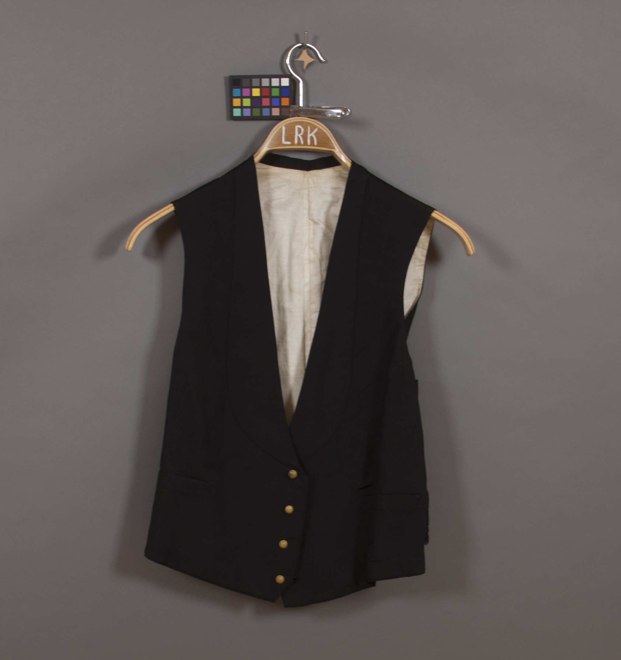 Svart väst av siden (?) med fastsydda uppslag, 3 fickor, 4 knapphål och 4 runda, välvda, förgyllda knappar (diam. 12 mm) med kunglig krona. Ryggstycke av svart bomull med 60 mm långt sprund i mitten bak samt slejf med svart metallspänne. Vitt bomullsfoder.