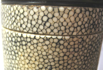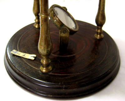 Plan, svarvad fot av valnöt(?). Stativ av mässing. Tub i två delar. Nederdelen med svarvad ring av ebenholts, tub av papp, utvändigt klädd med hajskinn. Överdelen upptill med svarvad ring av ebenholts med ett objektiv, upptill gängning för okular (inget befintligt passar). Därnedanför tub av papp, upptill med ett band av hajskinn, därnedanför grön papp med guldpressad dekor, smalt band med otydlig, tryckt dekor i rött och grönt. Bottenplatta av ebenholts, svarvad med gängat hål, märkning med tre punkter.