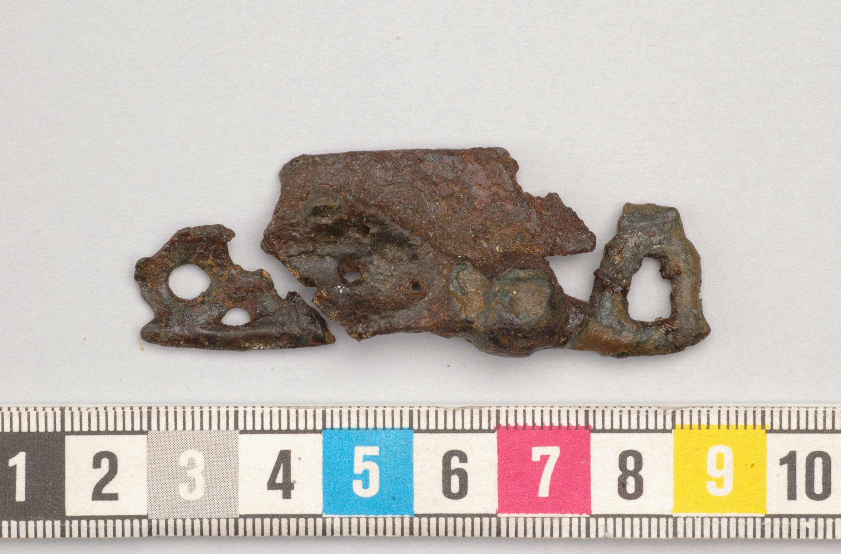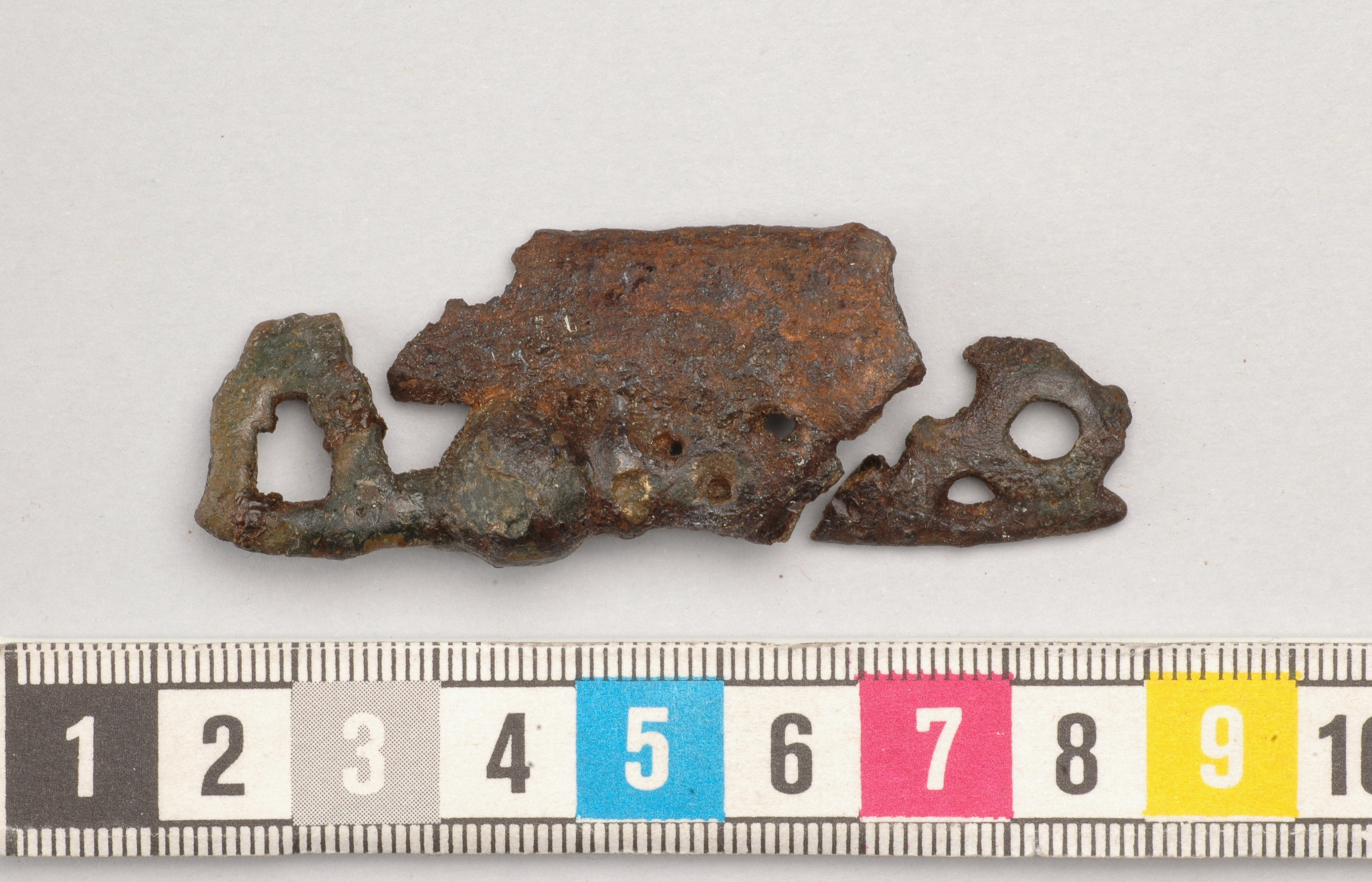 Vridlåsnyckel till sammankorroderad med bandformigt järnbeslag från skrin.