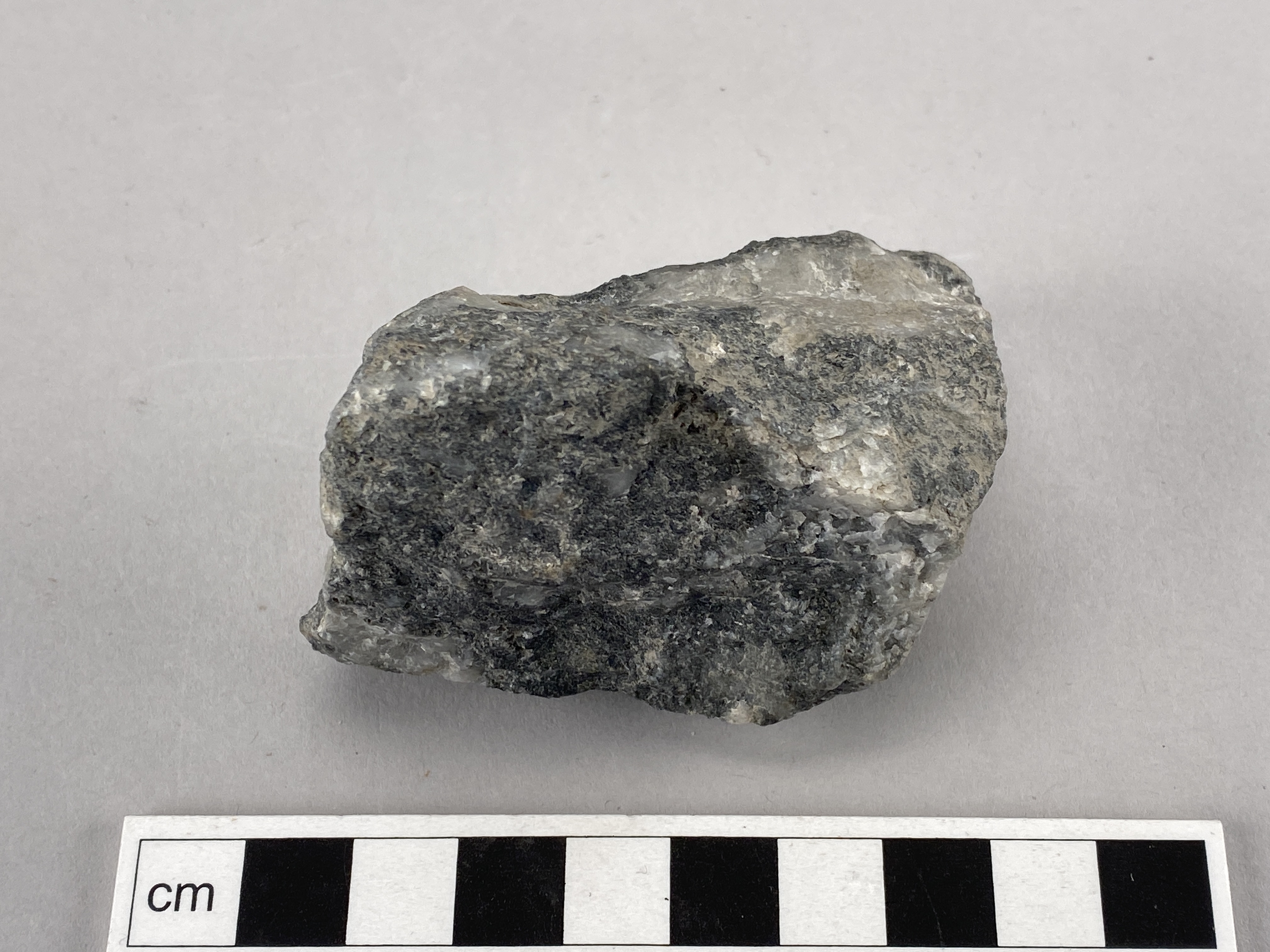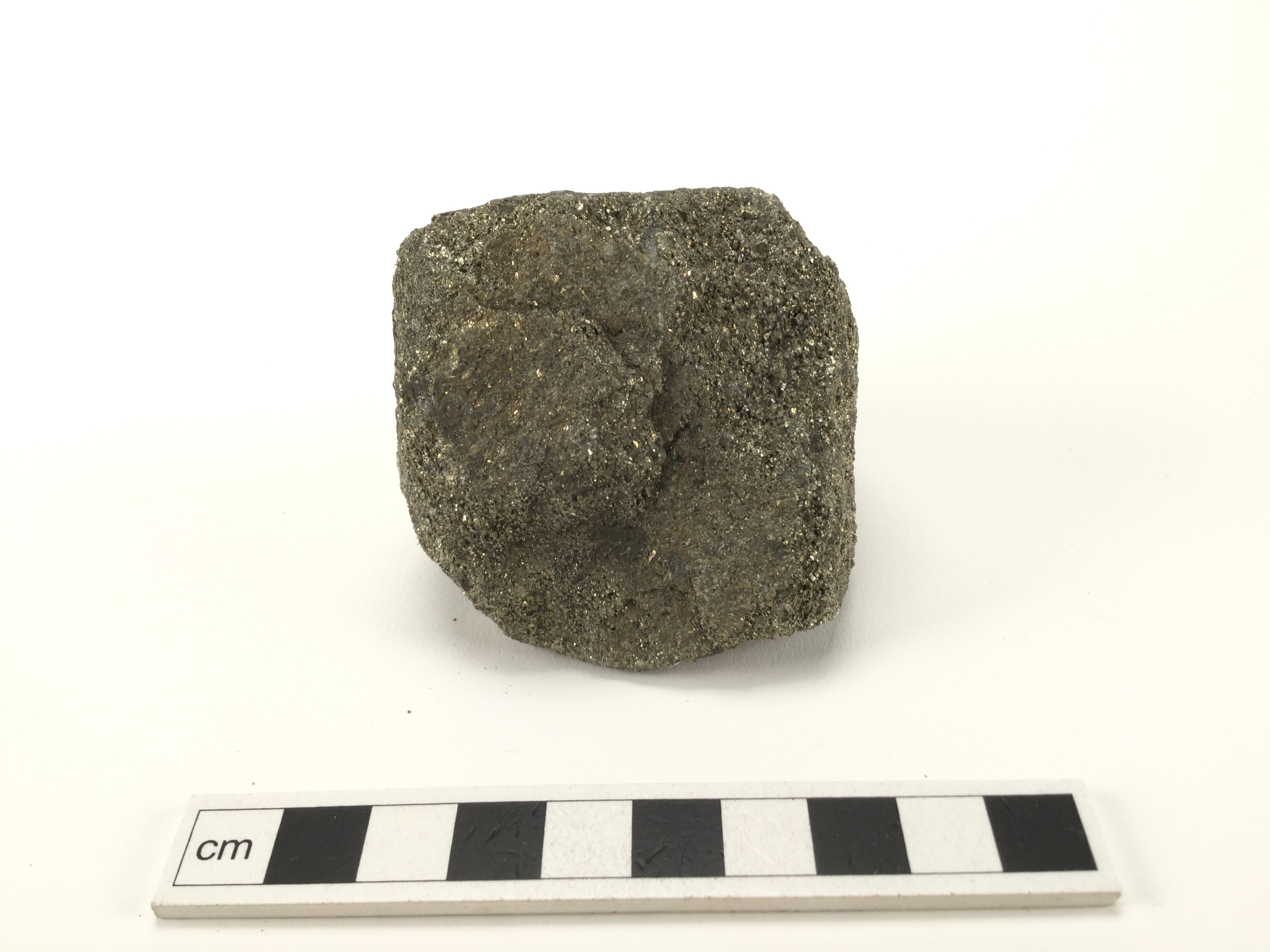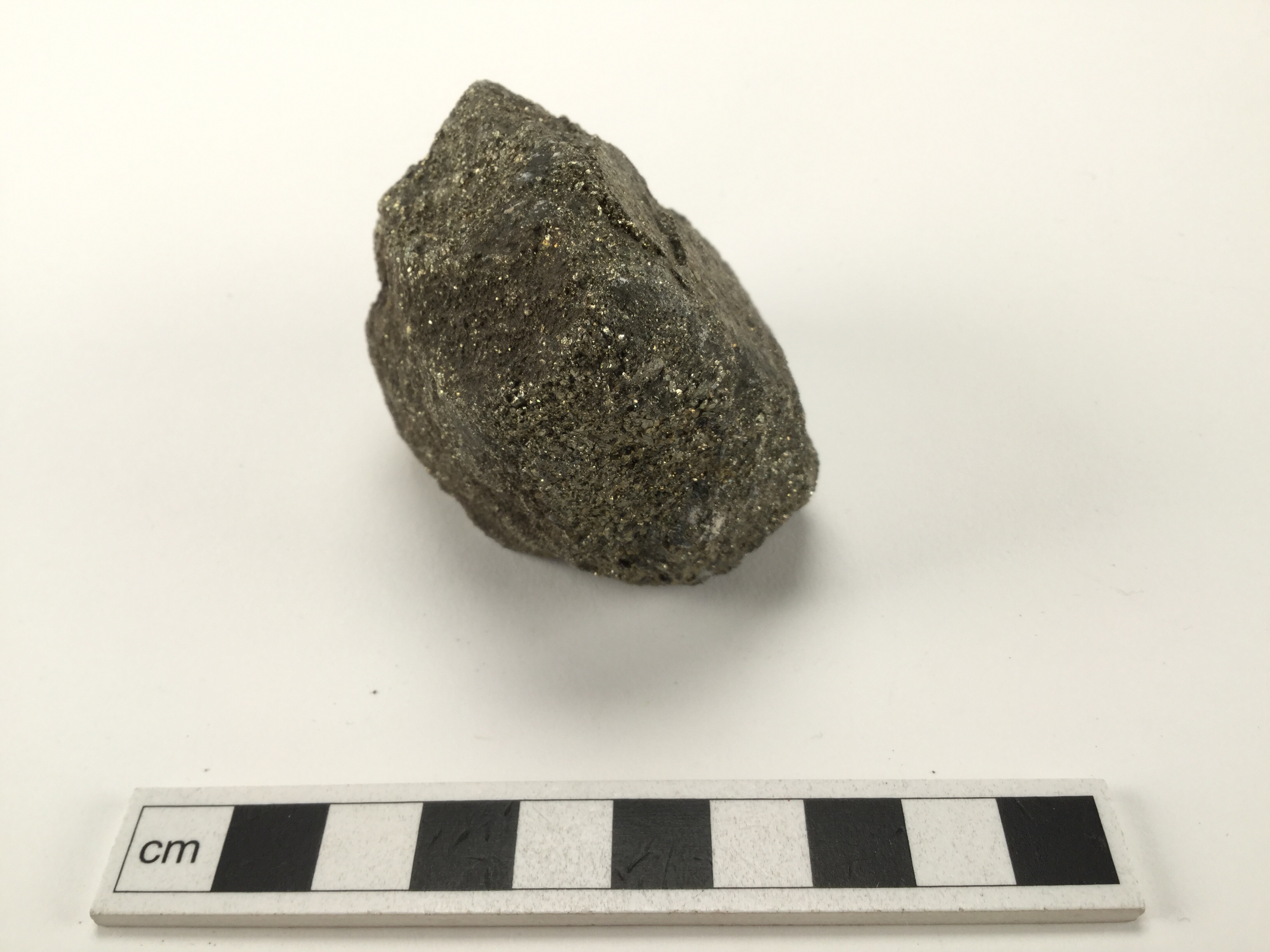 Eldslagningssten av pyrit eller svavelkis. Oregelbundet formad och med kanter som är tämligen avrundade.