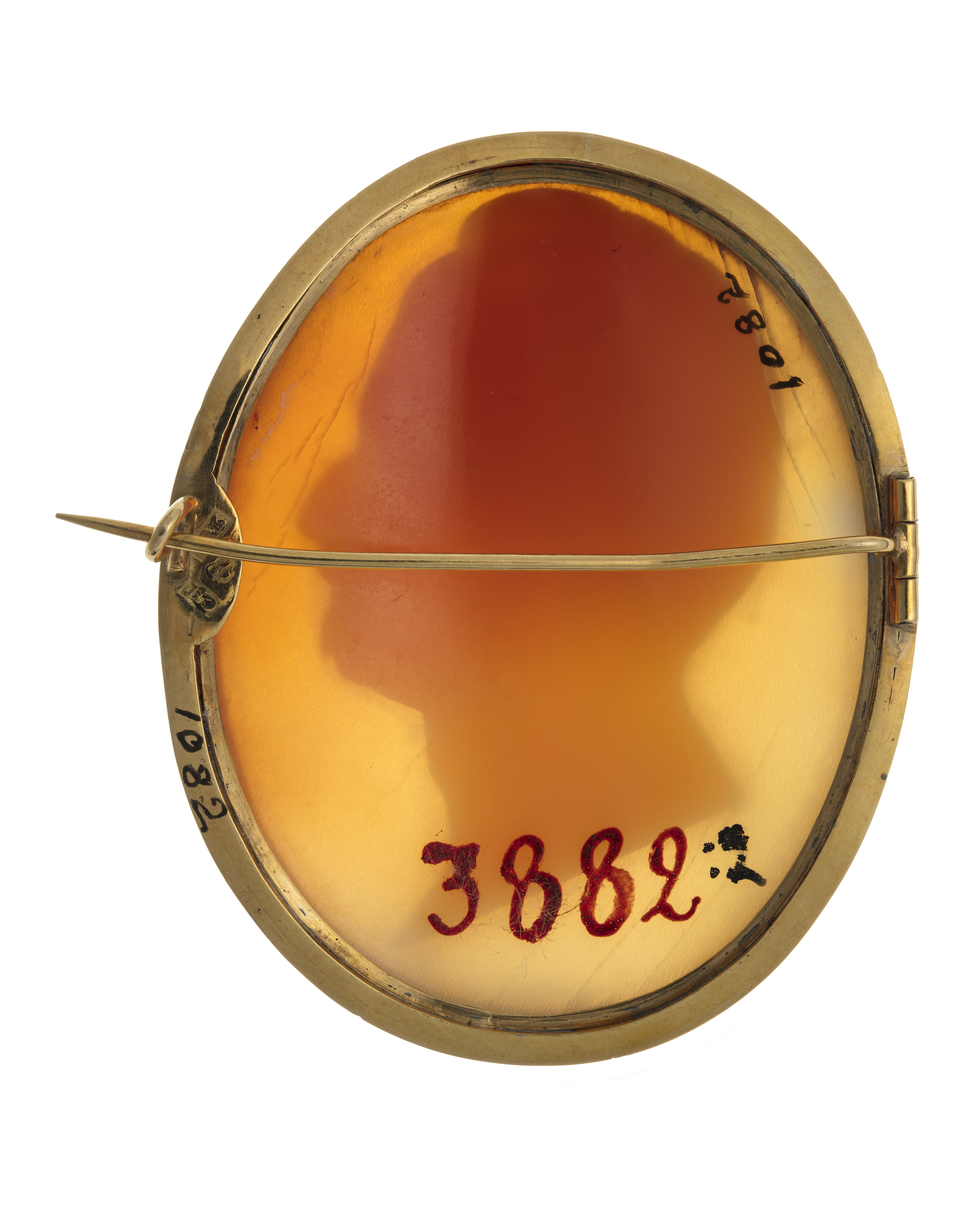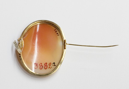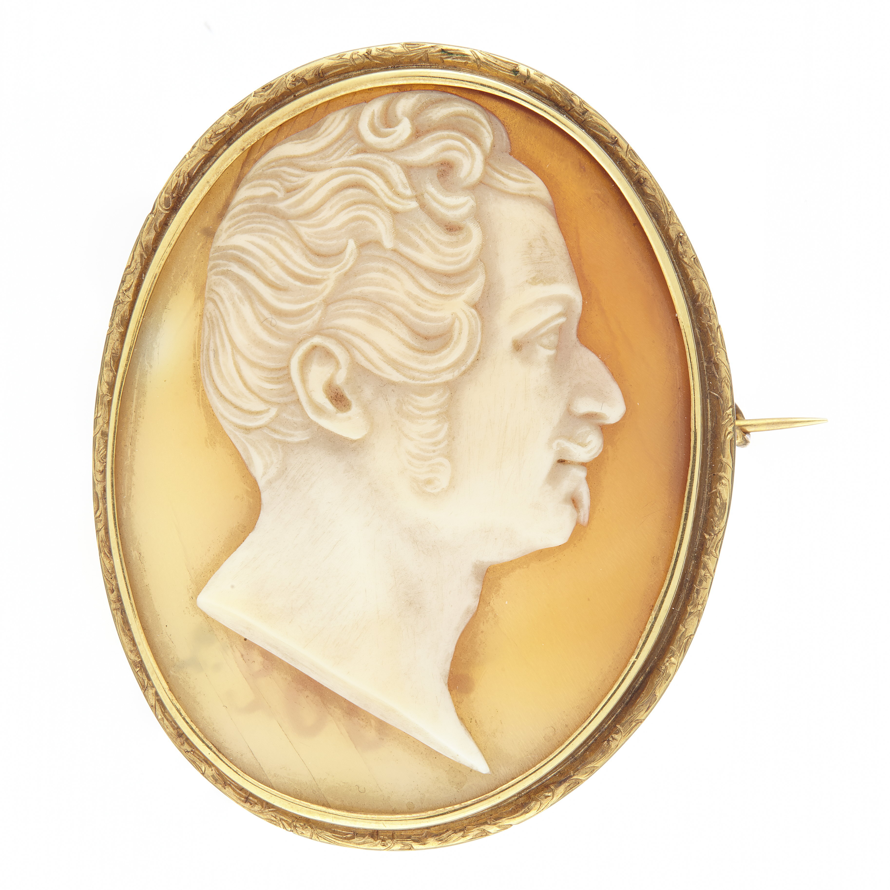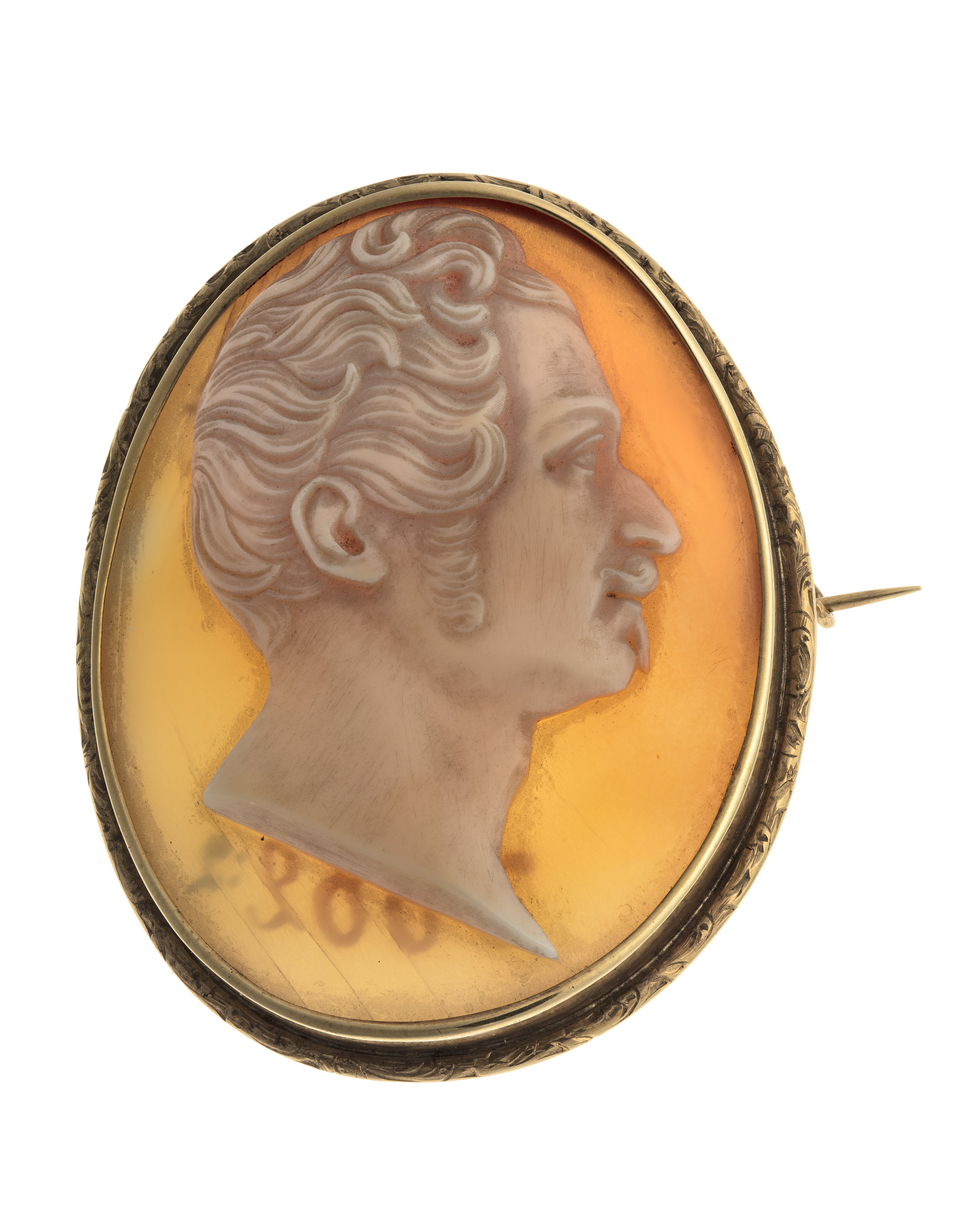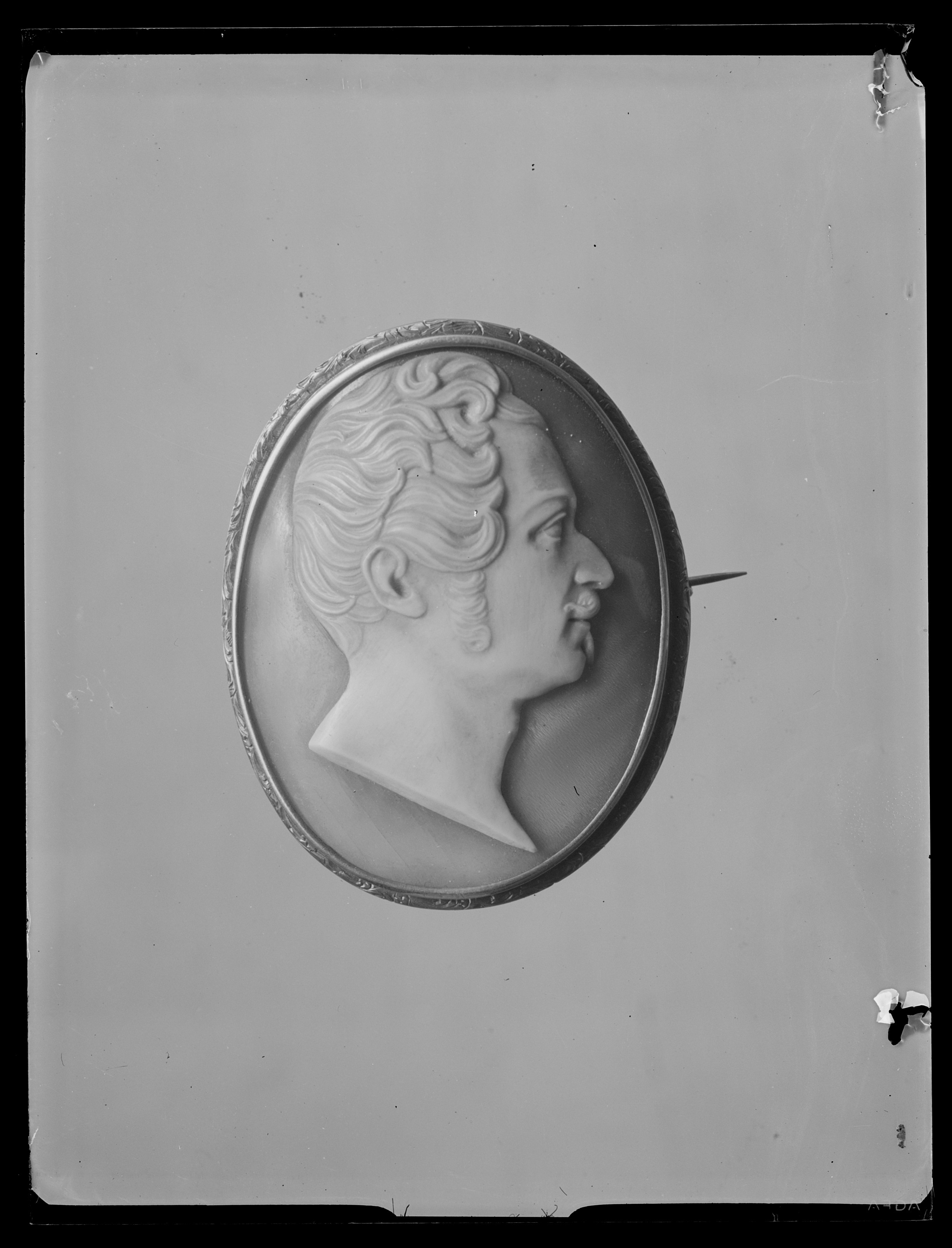 Ovalt, böjt miniatyrporträtt i form av snäckkamé av röd-orange snäcka med skuret vitt reliefporträtt av Oskar I, halsbild, profil höger. Fattning av guld med smalt brätte med graverat dekor nertill. Säkerhetsnål, på nålfästet stämplar: C H, tre kronor, 18 K, (Christian Hammer, Stockholm). Se bild i Herman Lindqvists bok "Historien om all Sveriges Drottningar" Norstedts Förlag, Stockholm 2006, sid 419 där prinsessan Eugenia bär detta miniatyrpoträtt. lefi 2015-08-11