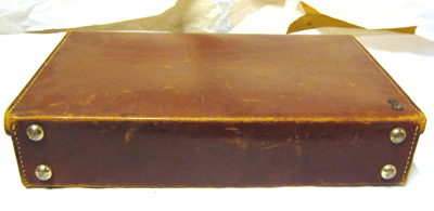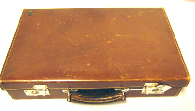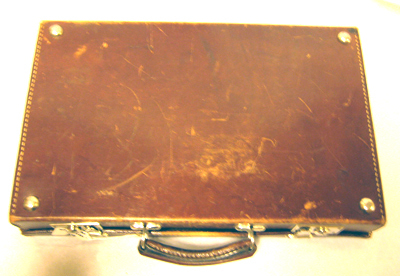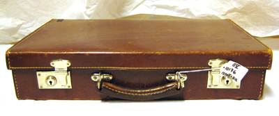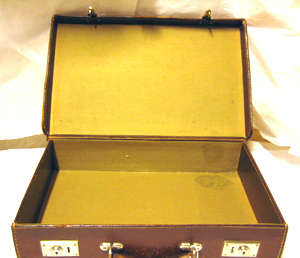 Liten resväska av brunt, slätt kalvskinn med ljus kantstickning. På lockets övre, vänstra hörn Gustav V:s spegelmonogram av silver. Två lås av vitmetall med rektangulära låsbrickor och gångjärnsförsedda knäppen. Rundsytt handtag fäst med två byglar. På väskans undersida fyra stycken och på bakre kanten fyra stycken halvsfäriska stöd av vitmetall. Väskan fodrad med tuskaftat ljusbrunt tyg.