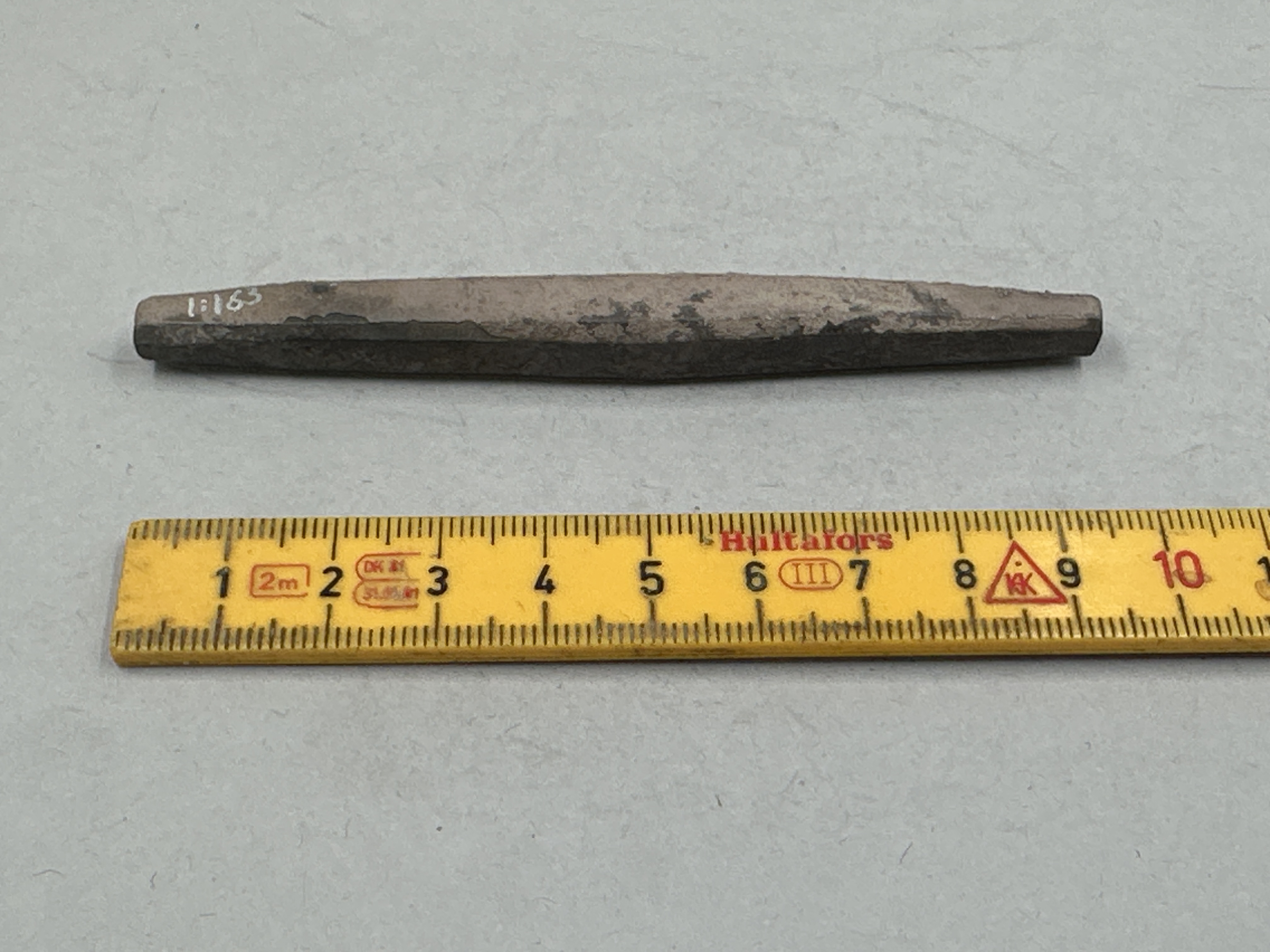 Avlång med avfasade kanter. Närmast kvadratiskt tvärsnitt. Ändarna avsmalnande.
