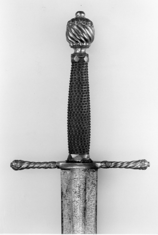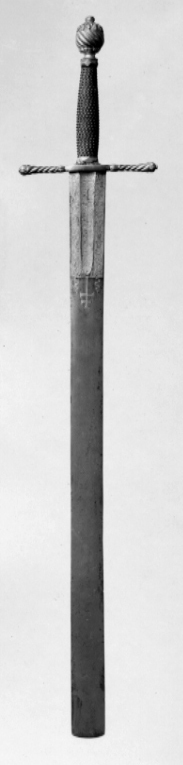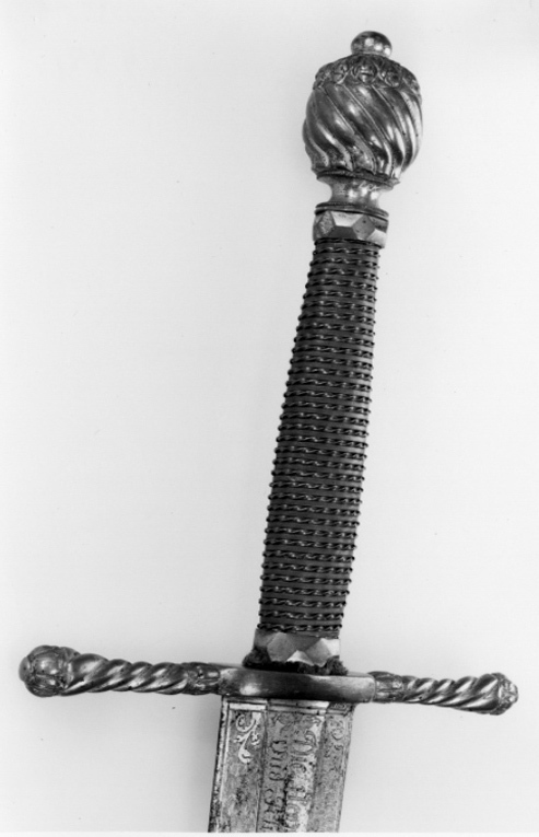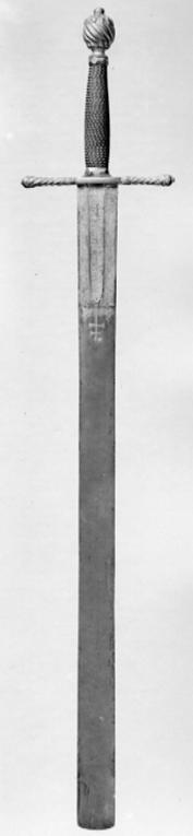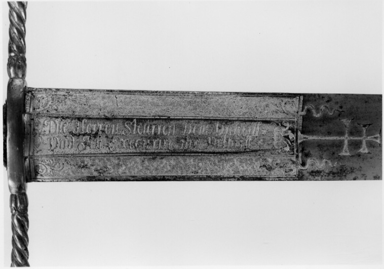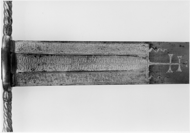 Korsformigt fäste av förgylld, reliefornerad mässing, Knapp kraftig, plommonformig, överdelen med en krans av radiellt ordnade blad, i övrigt spiralräfflad på slät hals, nitknapp rundad, tämligen stor, slät. Parerstänger raka, spiralträfflade med ytterändar i form av bladknoppar, mittpartiet (krysset) med slät yta. Kavel lindad med kopparlan, omväxlande tvinnad och slät, upptill och nedtill en tämligen kraftig, förgylld mässingsring, slipad i fasetterade fält. Klinga bred, rak, flackslipad och med tvärt avskuren, svagt konvex ytterände. Baspartiet till en längd av ca 164 mm ett fält med etsad och förgylld ornering. Längs mitten en ca 21 mm bred, grund hålkäl, vari inskription i skrivstil i två rader. På den ena sidan: " Wan Dem Sünder Wirt abgesprochen Das leven So wirt Er mir vnter meine hand Gegeben ". På den andra: " Die Herren Steurren Dem Unheill Vnd Ich Executire ihr Vrtheill ". På båda sidorna av hålkälen ett tätt ytmönster liknande damaskering, vid ändarna en bladranka. Ovanför det förgyllda fältet ett etsat och förgyllt kors med två tvärbjälkar ( s k patriarkkors), vid sidorna av korset ett vindlande band.