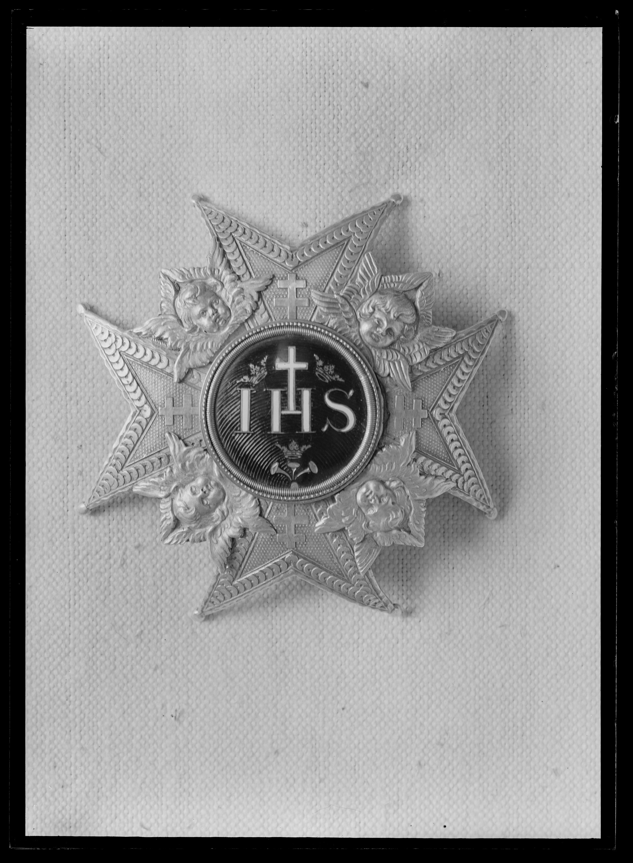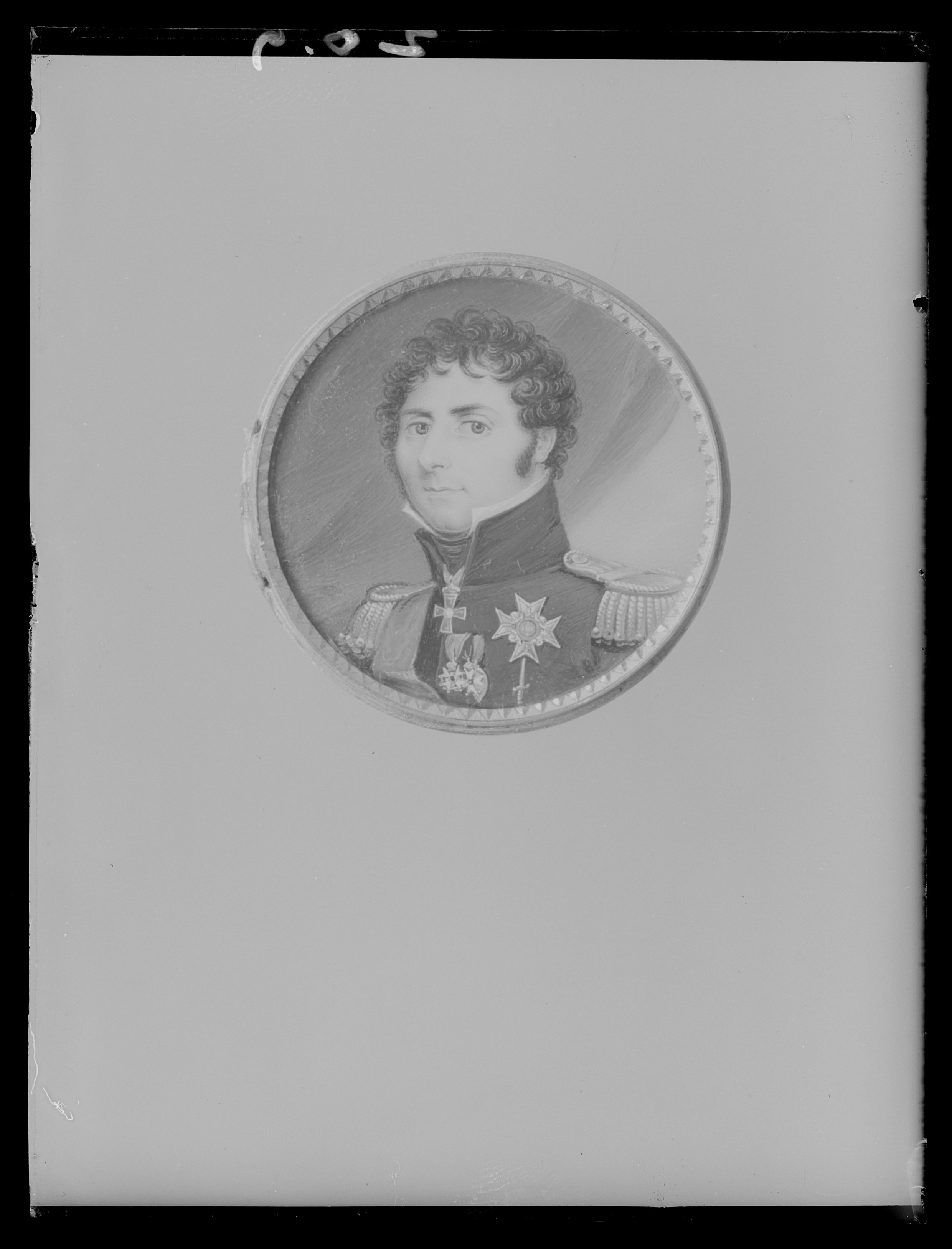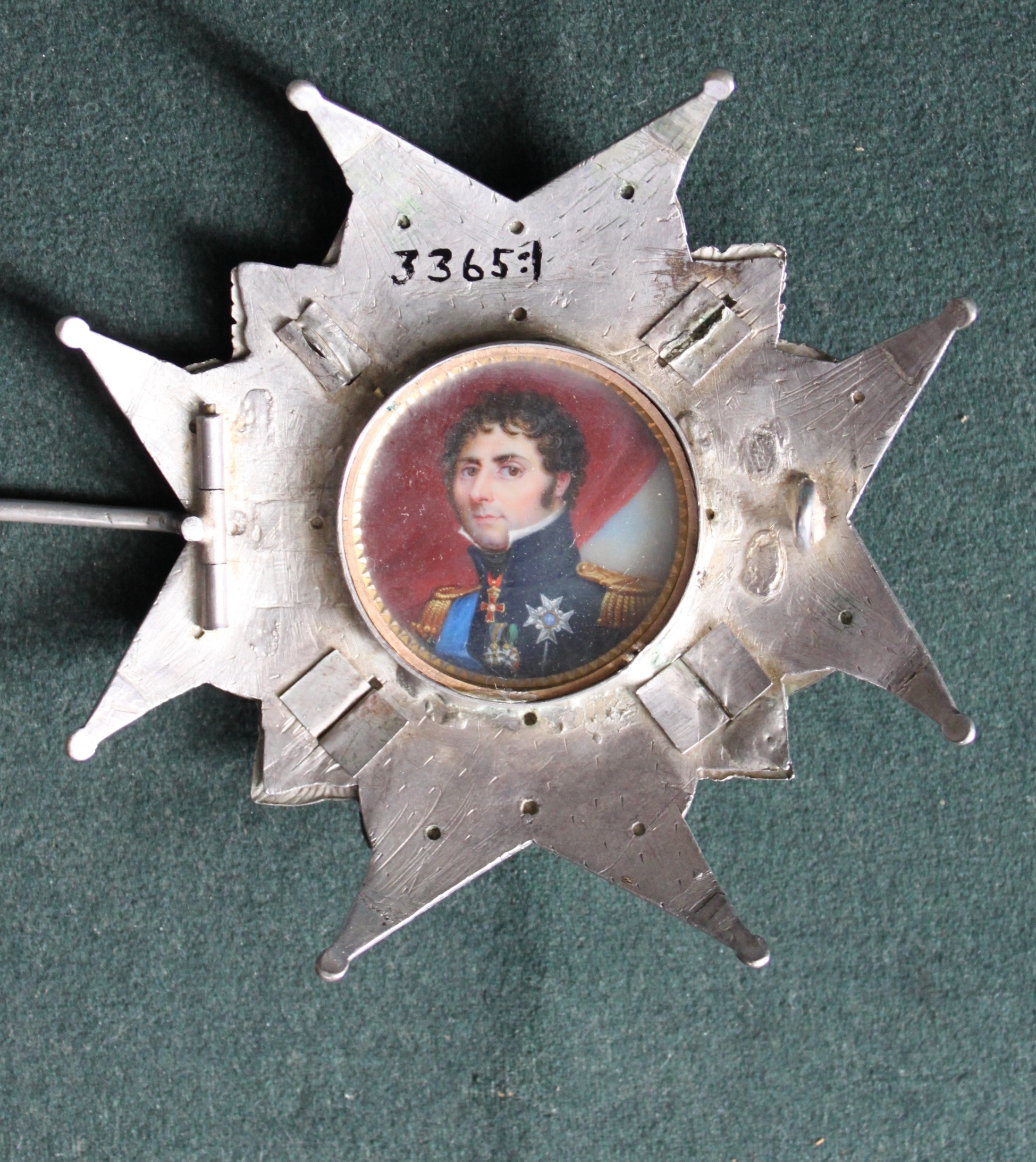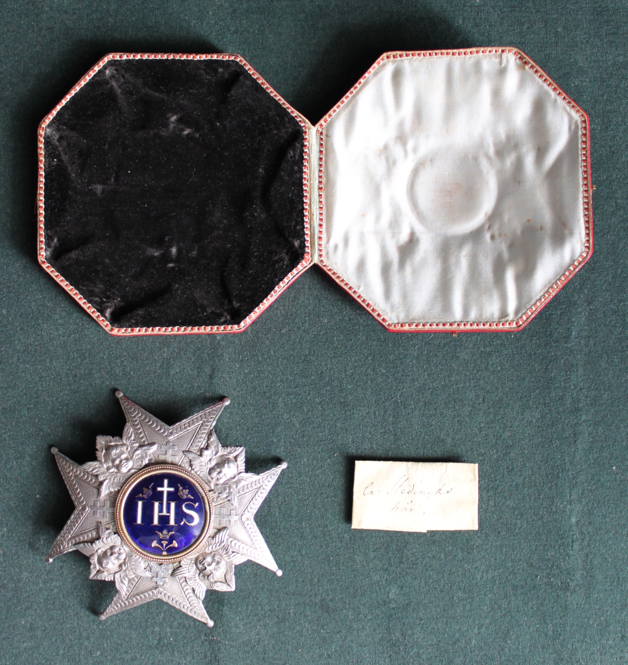 På baksidan dosa med miniatyrporträtt i olja av Karl XIV Johan under glas. Enligt katalogkort stämplad: tre kronor, st. Erik, O.W. 18 k - Olof Wihlborg, 1816-24 , Stockholm 1818. Stämpel ej synlig. Åttkantigt etui klätt med rött skinn med guldtryck, invändigt klätt med i locket vitt siden, i botten svart sammet. På undersidan klistrat grönt papper med skrift: "Buren af H. Ex. grefve Curt v. Stedingk , Gåfva af grefve Ludvig v. Stedingk till Skoklosters samlingar". I etuiet i ett papper förvaras en lock av Curt v. Stedingks hår. På papperet med bläck: "EX : Stedingks hår". TIllhörande lapp: Denna Seraphimer Craschan är buren af framlidne Fältmarskalken C. Bogislaus von Stedingk, och efter dess död gifven af Kammarherren Barn L. von Stedingk till Hans Excellence Riksmarskalken m.m. Grefve Magnus Brahe, och efter dess död lemnad till samlingarne på Sko Kloster af Hofstallmästaren m.m. Högvälborne herr Grefve Nils Brahe 1845.