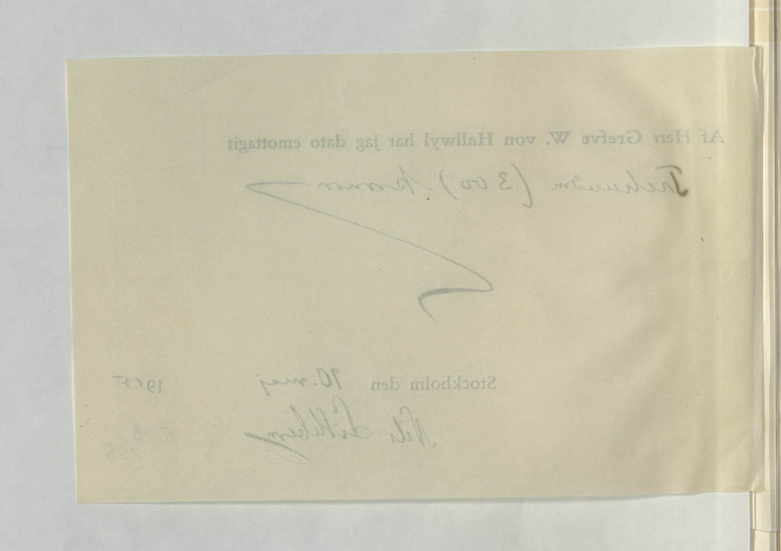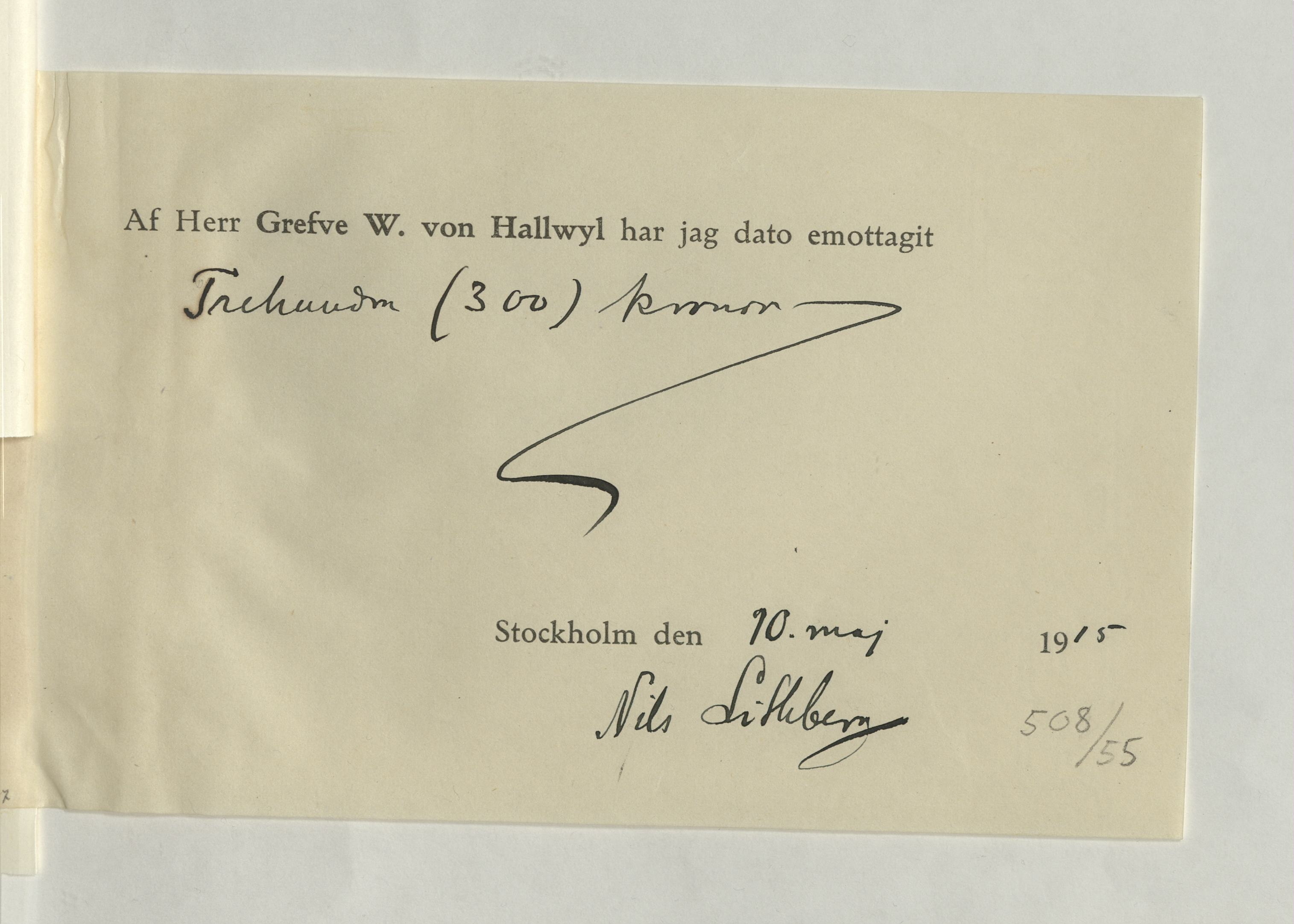 Emottagande av arvode från greven Walther von Hallwyl till Nils Lithberg, 10 maj 1915.