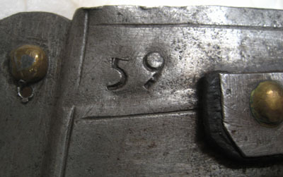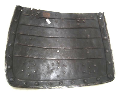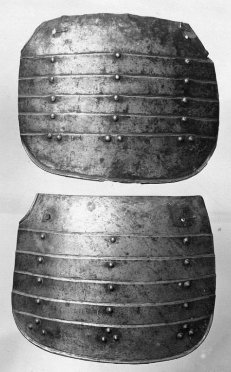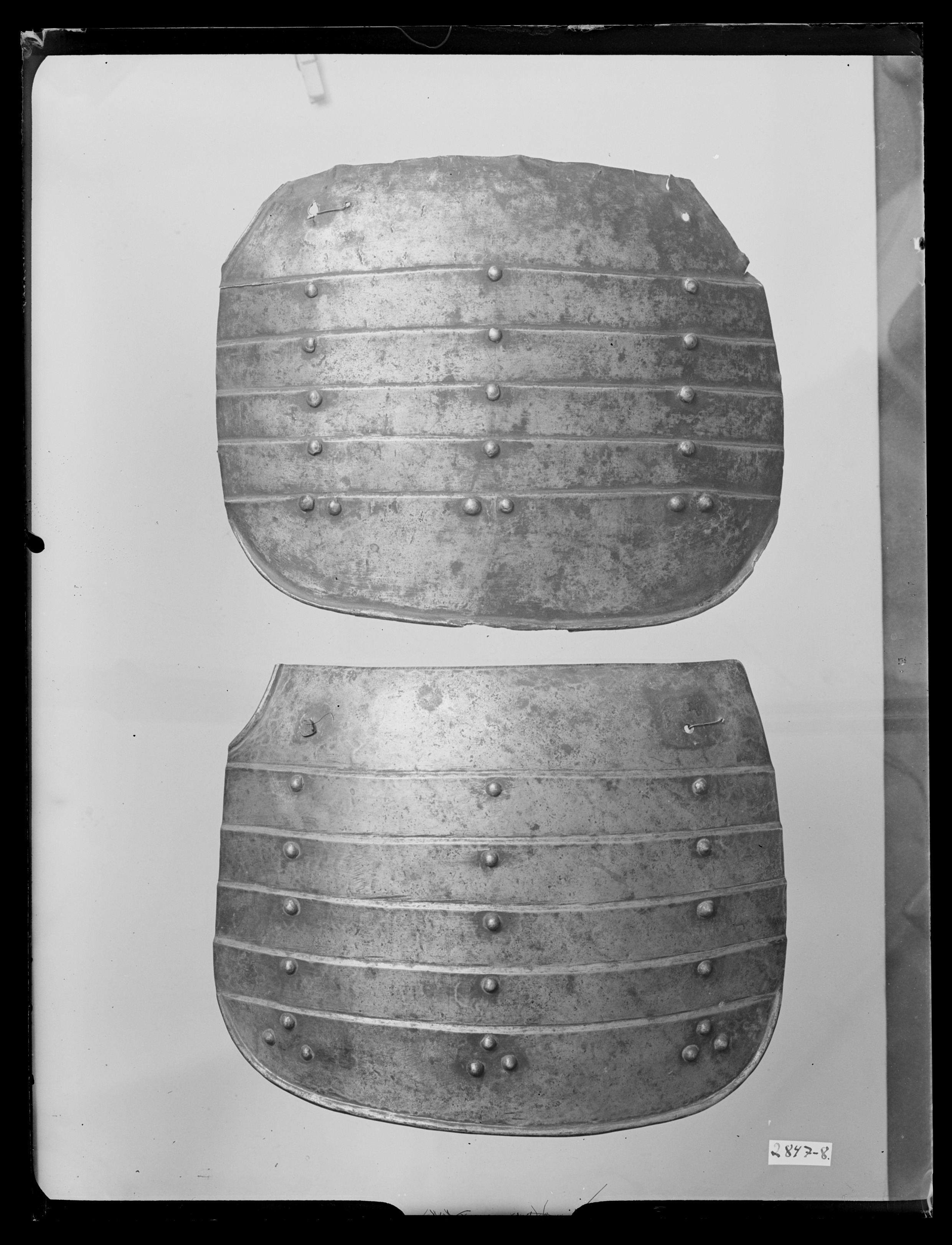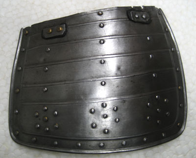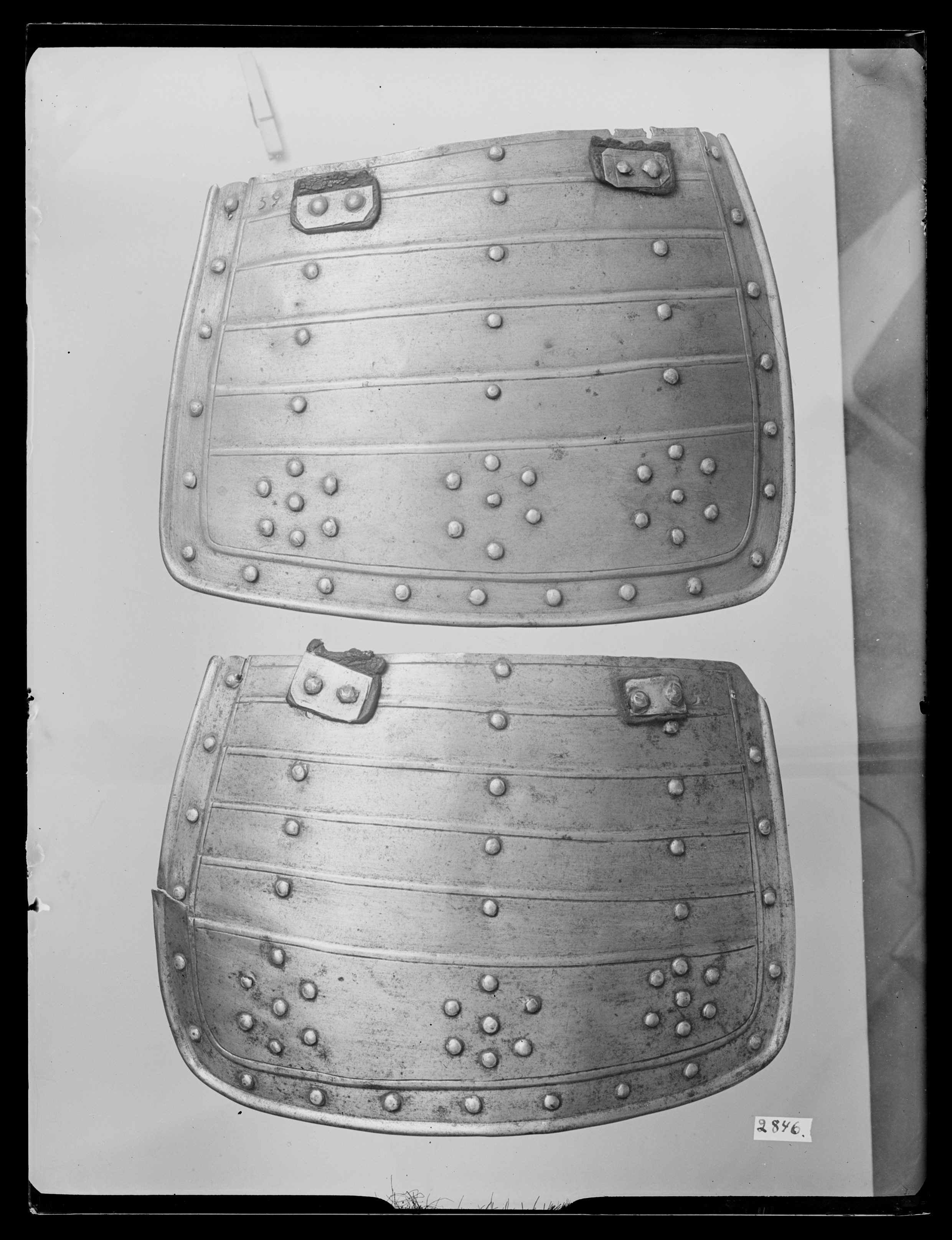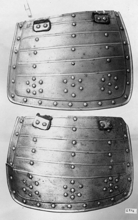 Driven stålplåt i ett stycke, slipad och blankpolerad med mässingsklädda nitar. Tjocklek i kanten ca 1 mm. Rektangulär, svagt välvd med omvikta rundsmidda kanter. Runtom löpande 25 mm bred bård, slät och något försänkt. Fem horisontellt drivna åsar, liknande kanter på skenor. Nitar i tre vertikala rader nertill avslutade med sex nitar runt en sjunde. Nitar i bården runtom. Upptill två nitade små plåtar B 38 mm med tillklippta hörn, under dessa rester av bruna läderband. Upptill i inre kanten inslaget 59. Insidan brunsvart med rester av kantband i läder under nitarna.