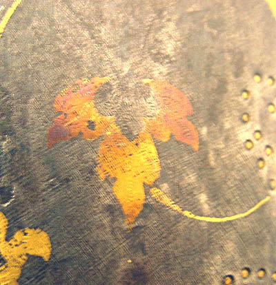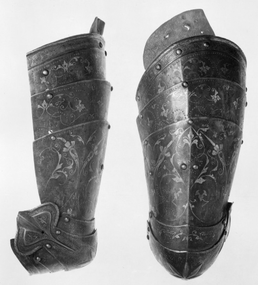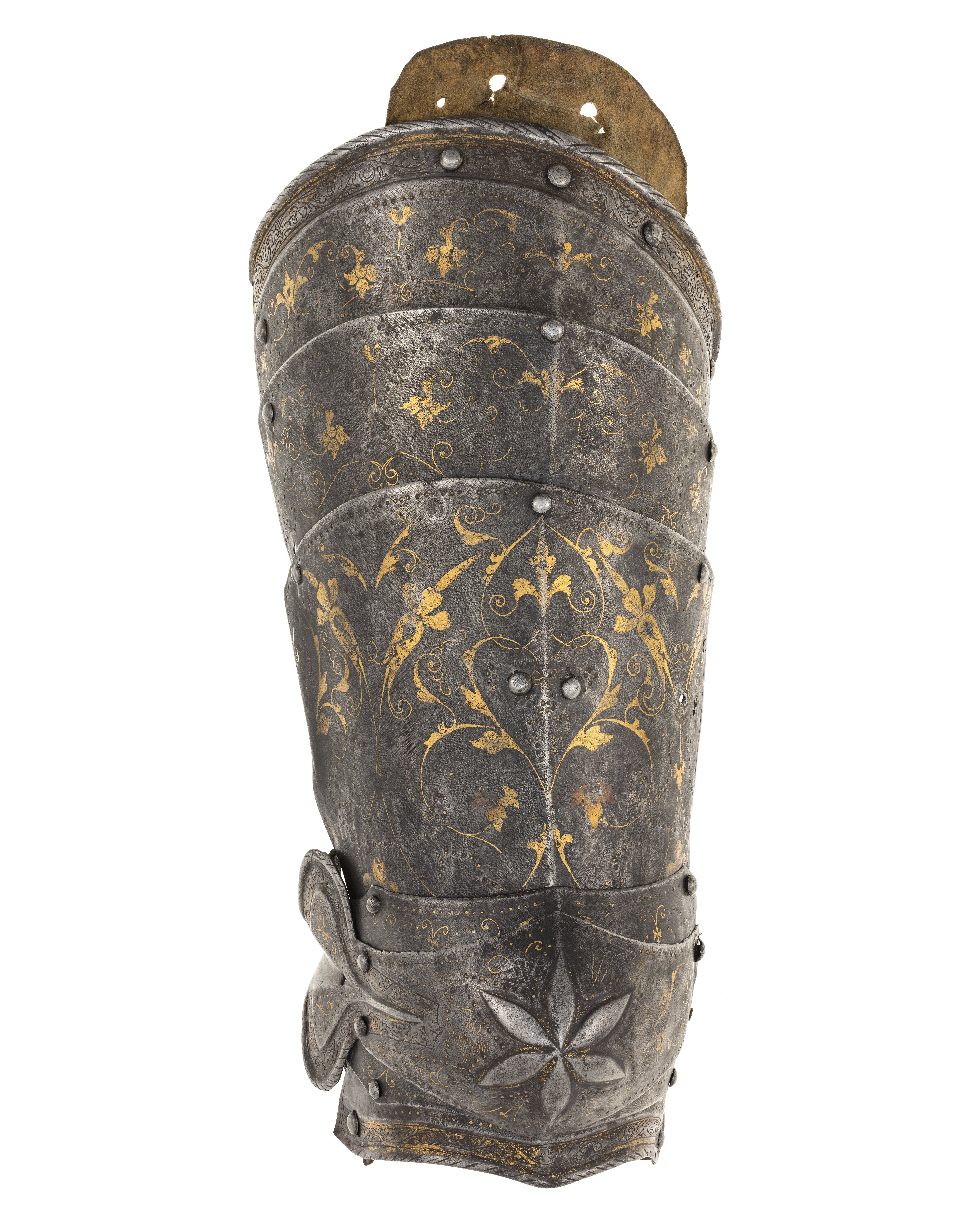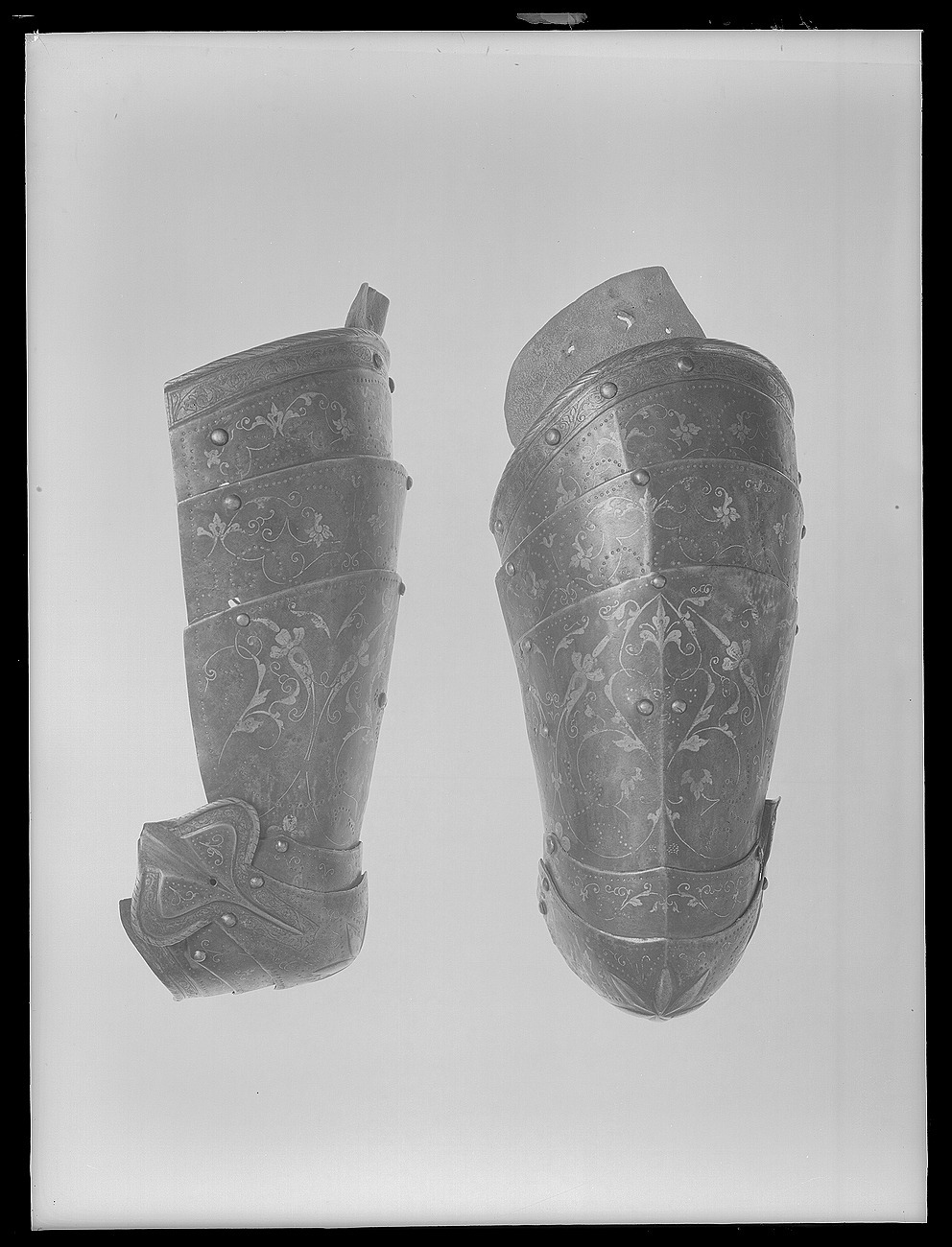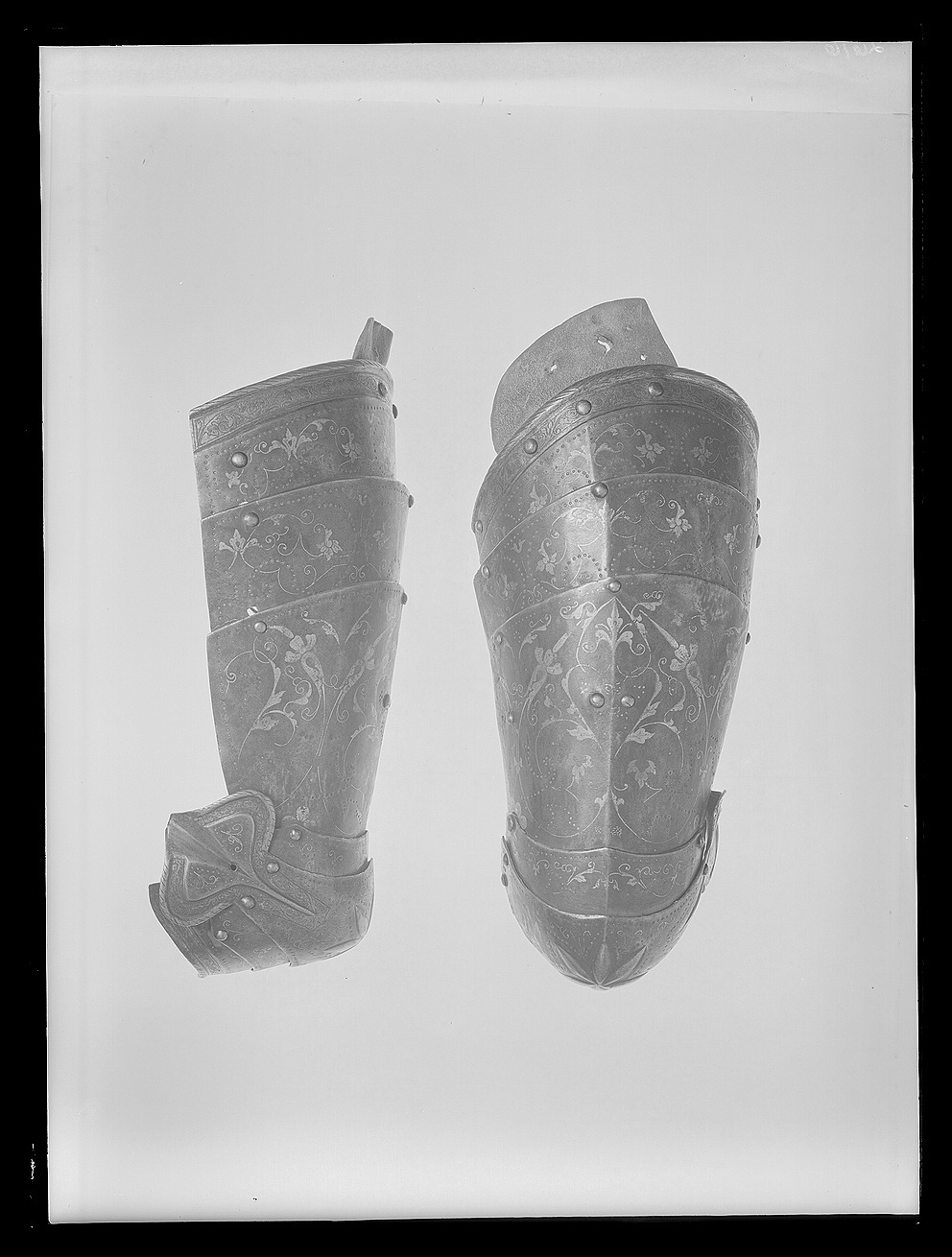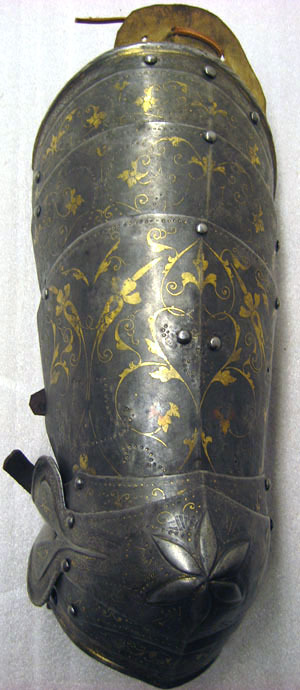 Driven stålplåt med på utsidan rankdekor av påslaget guld och silver mot mörk botten. Insidan brunaktig med tydliga hammarslag. Sammanlagt sju delar. Övre del av tre välvda skenor, nedåt svagt avsmalnande. Övre kanten rundad och sluttande åt sidorna, något mer åt insidan. Driven mittås. Raka och släta kanter. Översta skenans kant omvikt, rundsmidd med filade snedställda linjer. Synliga nitar i kanter och över mitten. I yttre kant är nitarna delvis rörliga i sina hål. Två brunaktiga sämskade läderband på insidan, l 55 resp 120 mm. Upptill i översta skenan en sämskad läderbit med hål för rem, mot utsidan en rem med sölja mot insidan en rem. Knäbuckla, välvd och utåt formad som rundad spets med dekor av driven sexbladig blomma. Insidan tvärt avslutad, mot utidan övergående i oval mussla, h 92 mm, med yttre kant utdragen till spets med V-formigt mittparti. Omvikt, rundsmidd och linjefilad kant. Etsad och försänkt bård löpande runt musslan och in 60 mm på bucklan i ett rektangulärt fält, ej försänkt. Musslans mittparti spetsovalt med en långsmal driven spets löpnande in över bucklan. Över bucklan en välvd skena och under tre med övre kanten utdragen till tre spetsar. I nedersta skenans sidor två läderremmar, den yttre kortare och med sölja i änden. Dekor: Blånerad yta med skrafferade partier med påslaget guld och silver i form av slingrande rankor och blommor. Över och genom detta mönster löper slingor av punsade och guldfyllda prickar. Längs övre och nedre skenans kanter och på musslan löper en försänkt bård med etsad och förgylld dekor av bladverk.