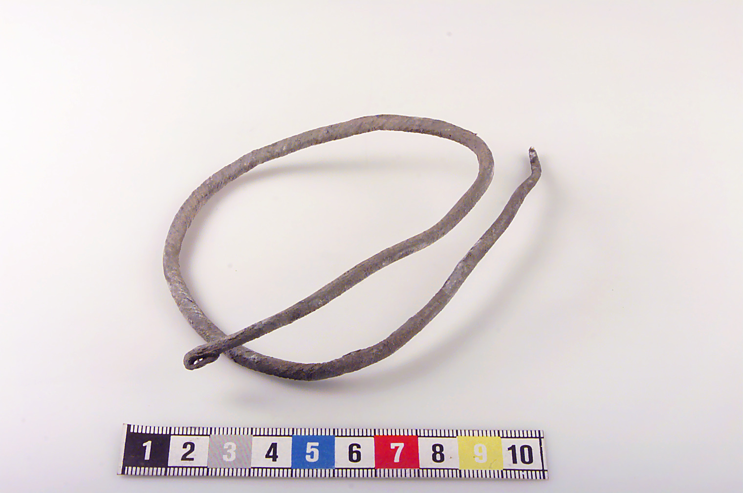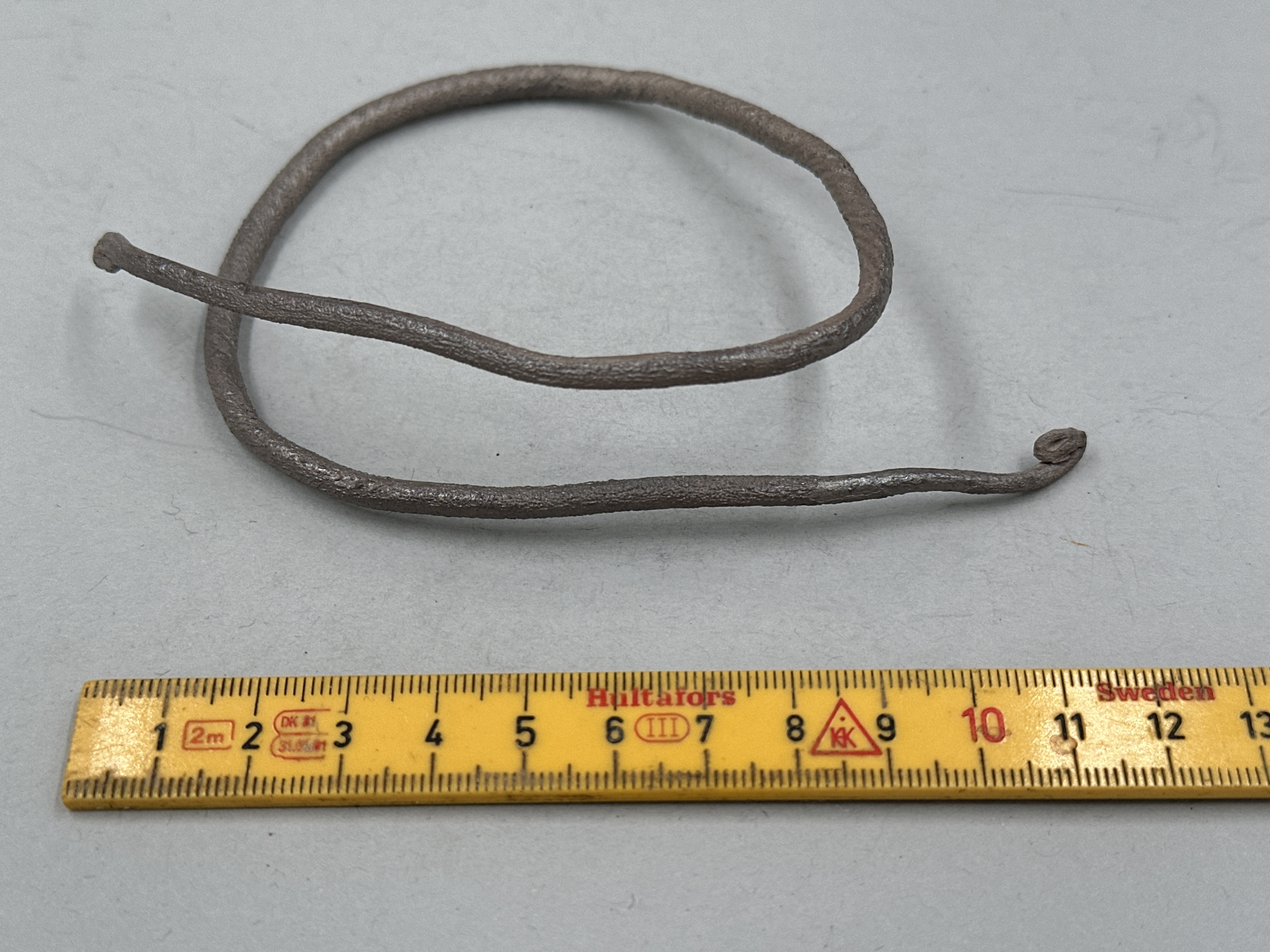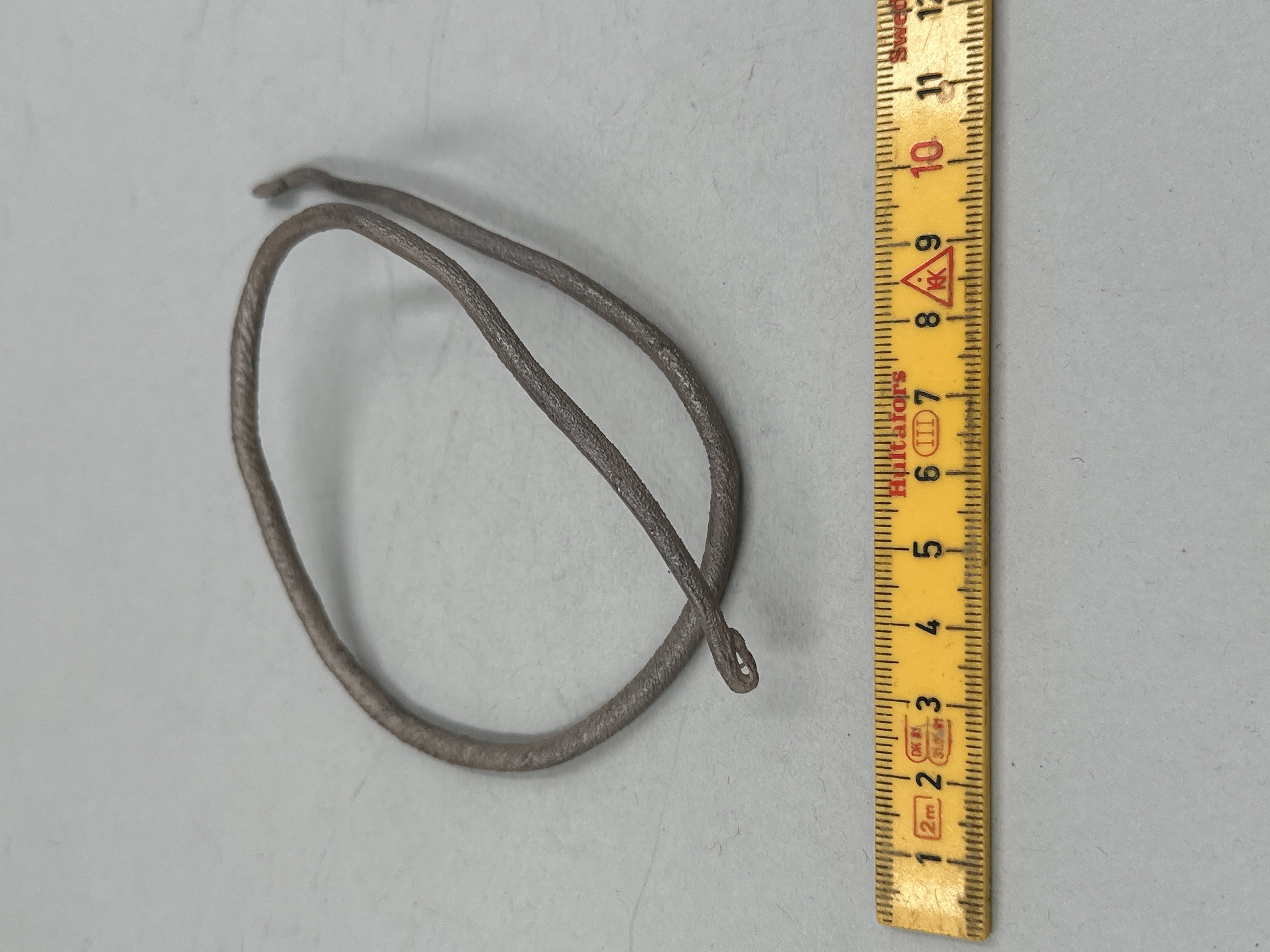 Rundad ten med spiralvriden ornamentik. Ena änden tillbakaböjd, andra avbruten. Ihopsnurrad.