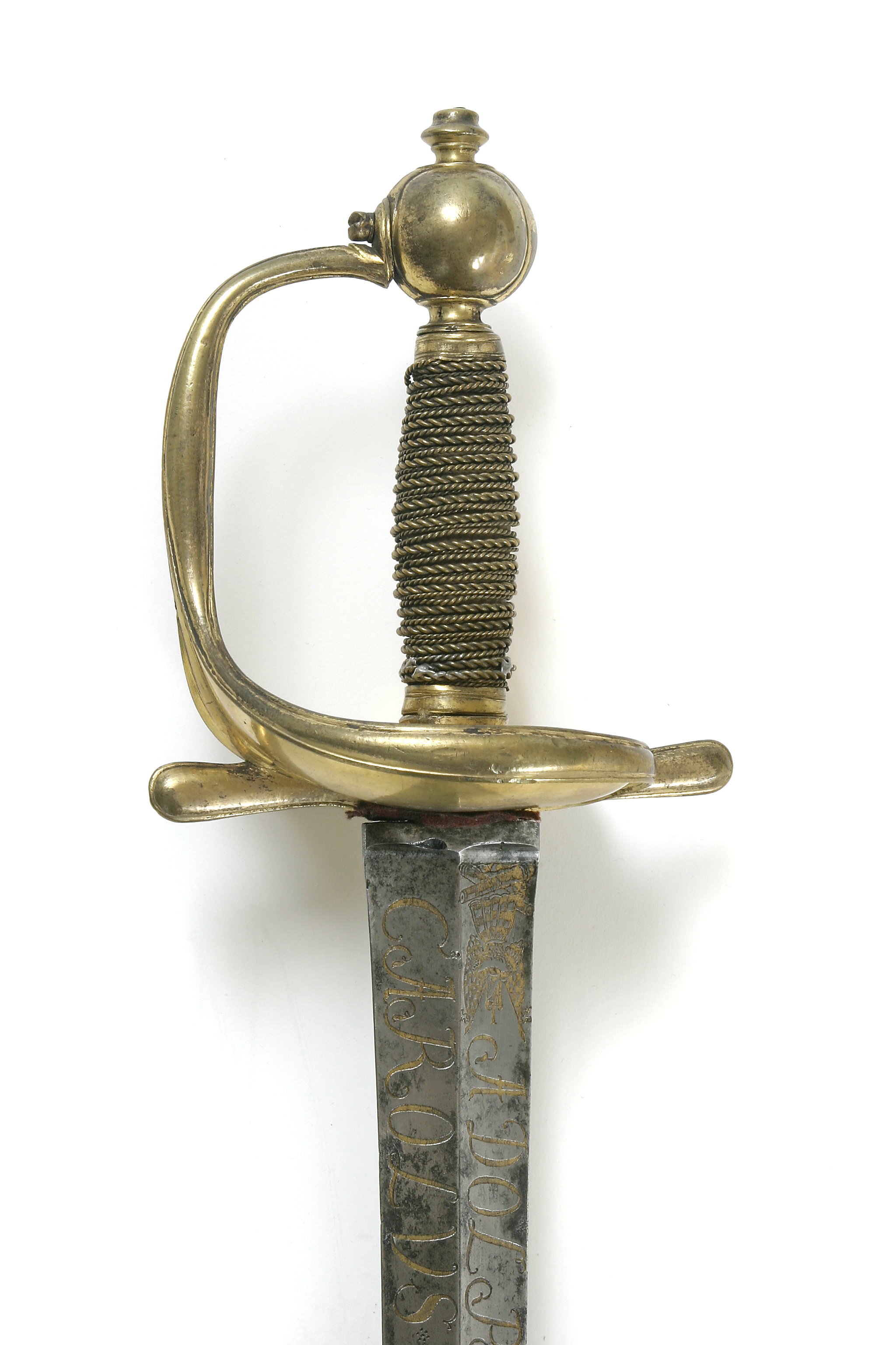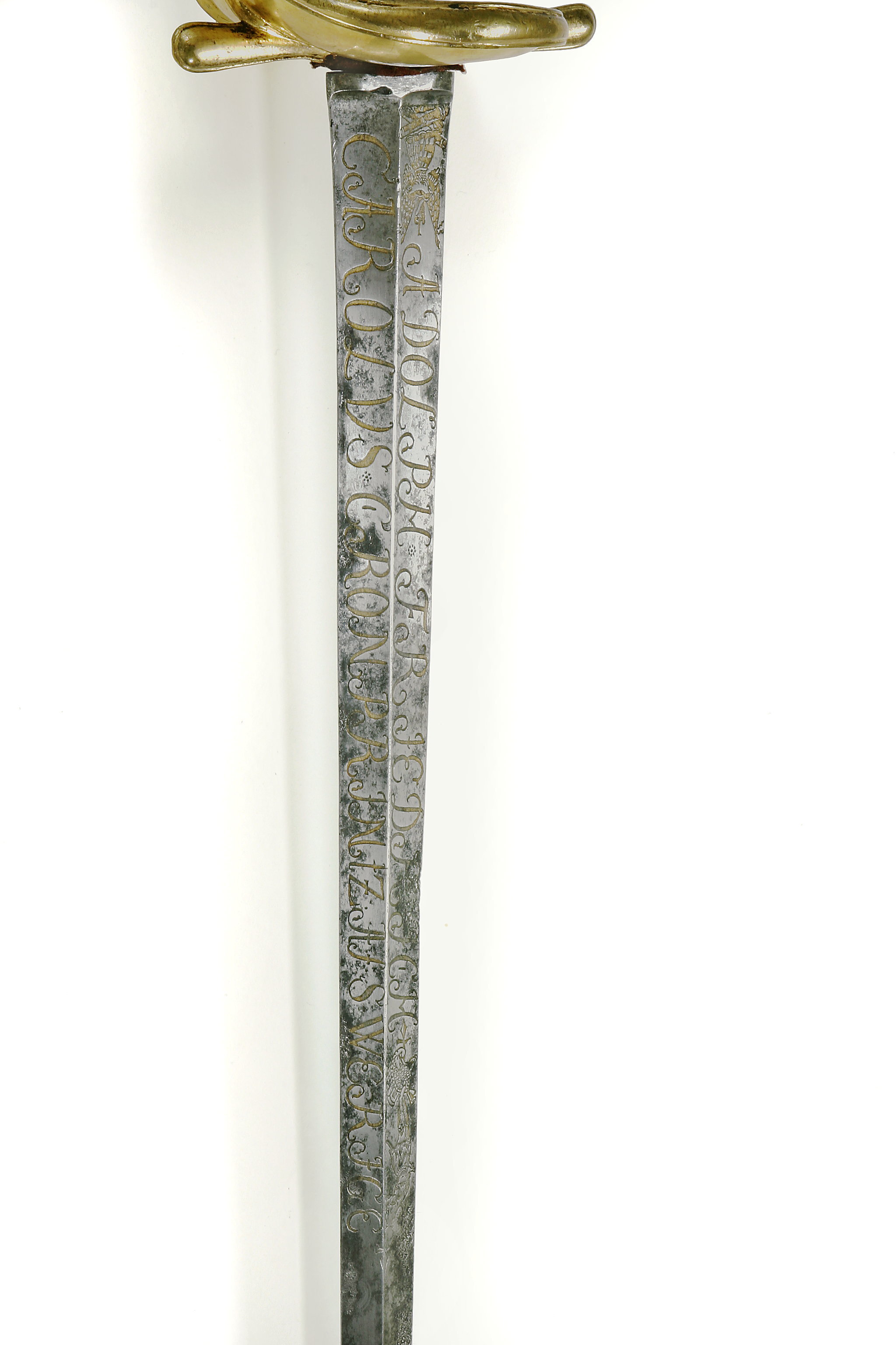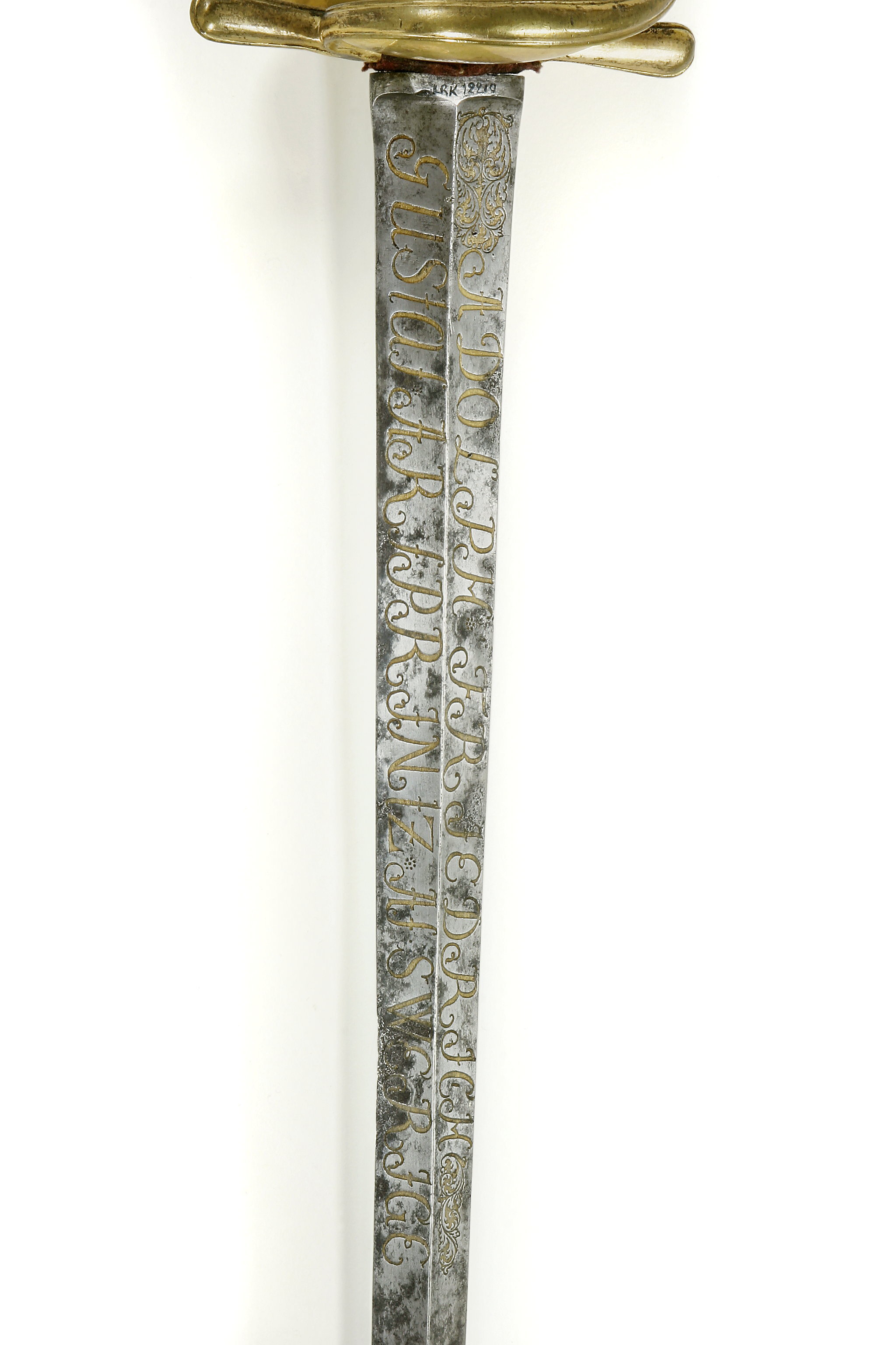 Fästet av förgylld mässing, modellenlig av efterkarolinsk typ. Med släta vertikaler, vid mitten något vidgade bårder utmed den nästan runda knappens fram- och baksida, nitknapp hög, profilerad. Utmed kanterna av handbygel, parerplåtar och parerstänger en smal, slät list. Klinga rak, tvåeggad och tämligen bred med jämnbreda, mötande skär tillslipad). På starka delen etsad och förgylld, kraftig inskription, huvudsakligen i versaler skrivstil). Inskriptionen i två rader, en rad på vardera skäret. På utsidan: "ADOLPH FRIEDRICH // CAROLUS CRONPRINTZ Af SWERIGE". På insidan: "ADOLPH FRIEDRICH // GUSTAf ARf PRINTZ Af SWERIGE". Före"Adolph" och efter "Friedrich " ett liggande ornament, likaså etsat och förgyllt. Den etsade dekoren möjligen av Johan Wilhelm Kindt.