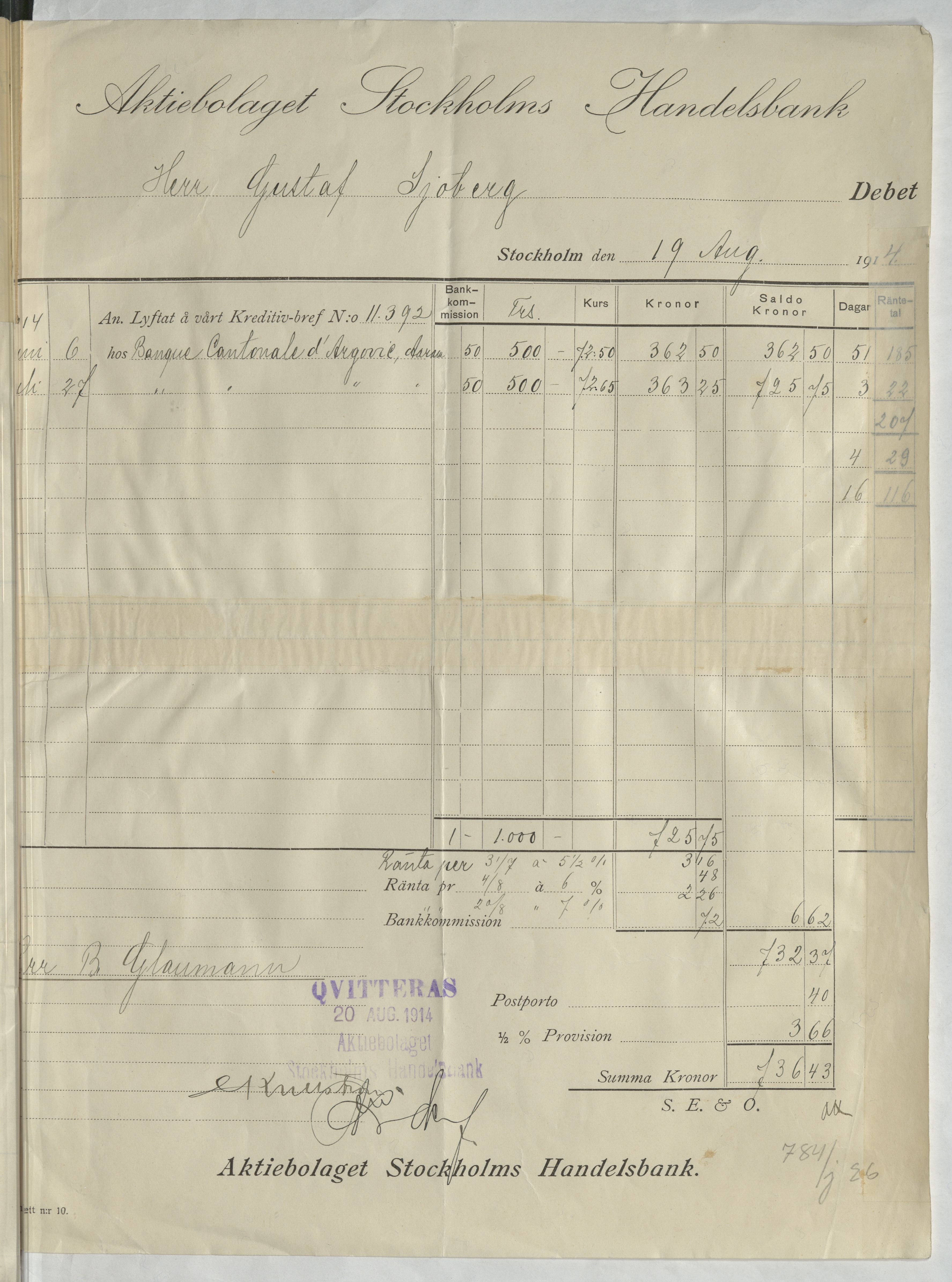 Kvitto från Aktiebolaget Stockholms Handelsbank rörande Sjöberg, Gustaf