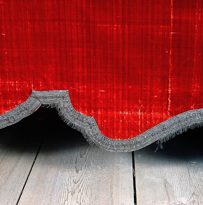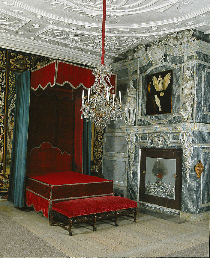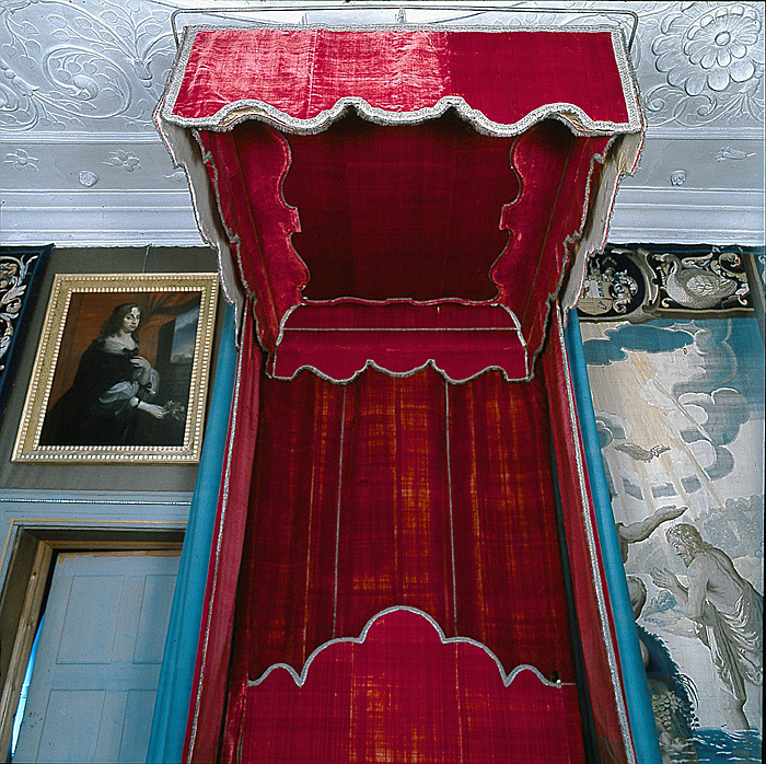 Säng med två sängstolpar och konturerat gavelstycke med röd sammet. Baldakin klädd med röd sammet besatt med silvergaloner och med nedhängande kappor med vågformig avslutning .