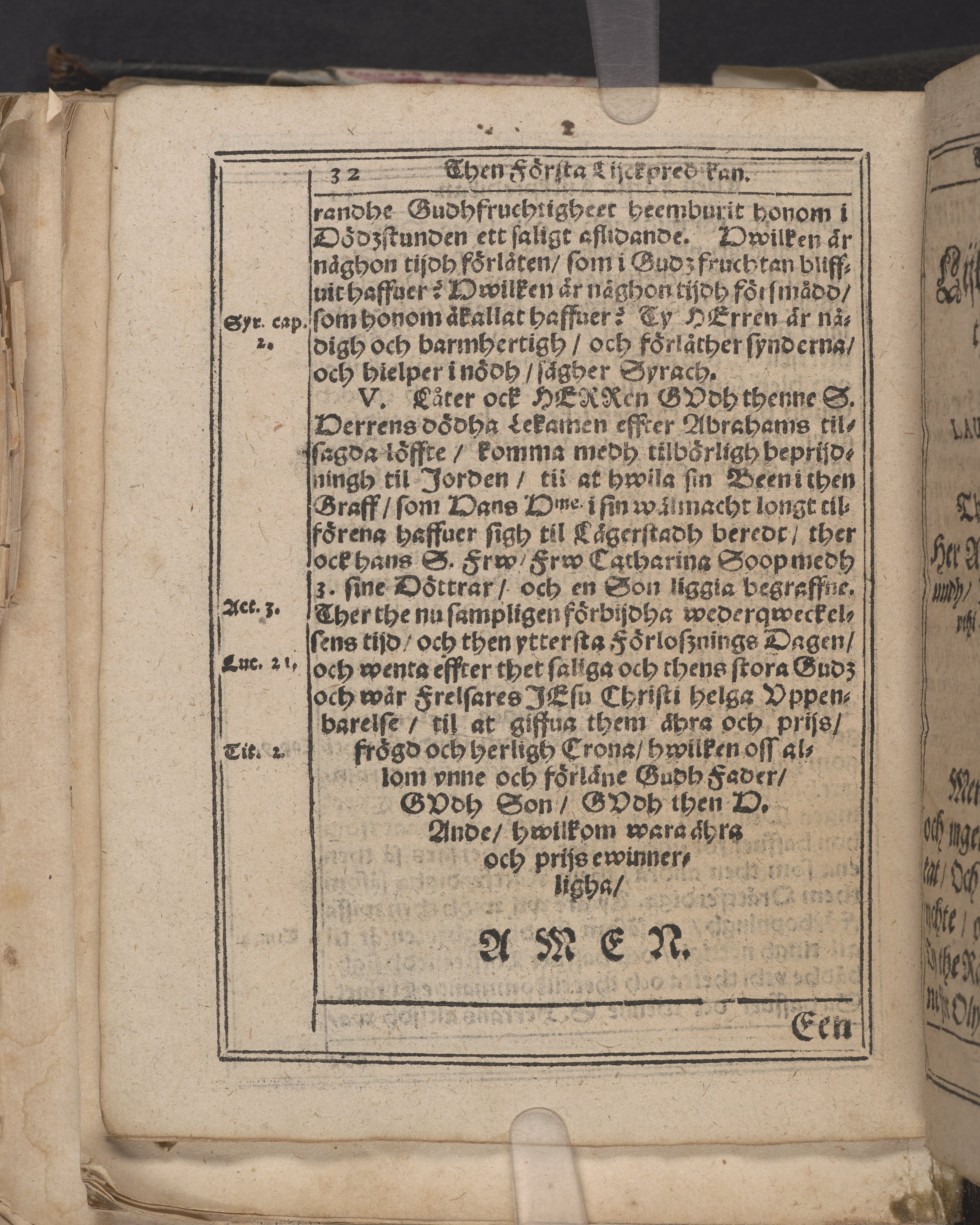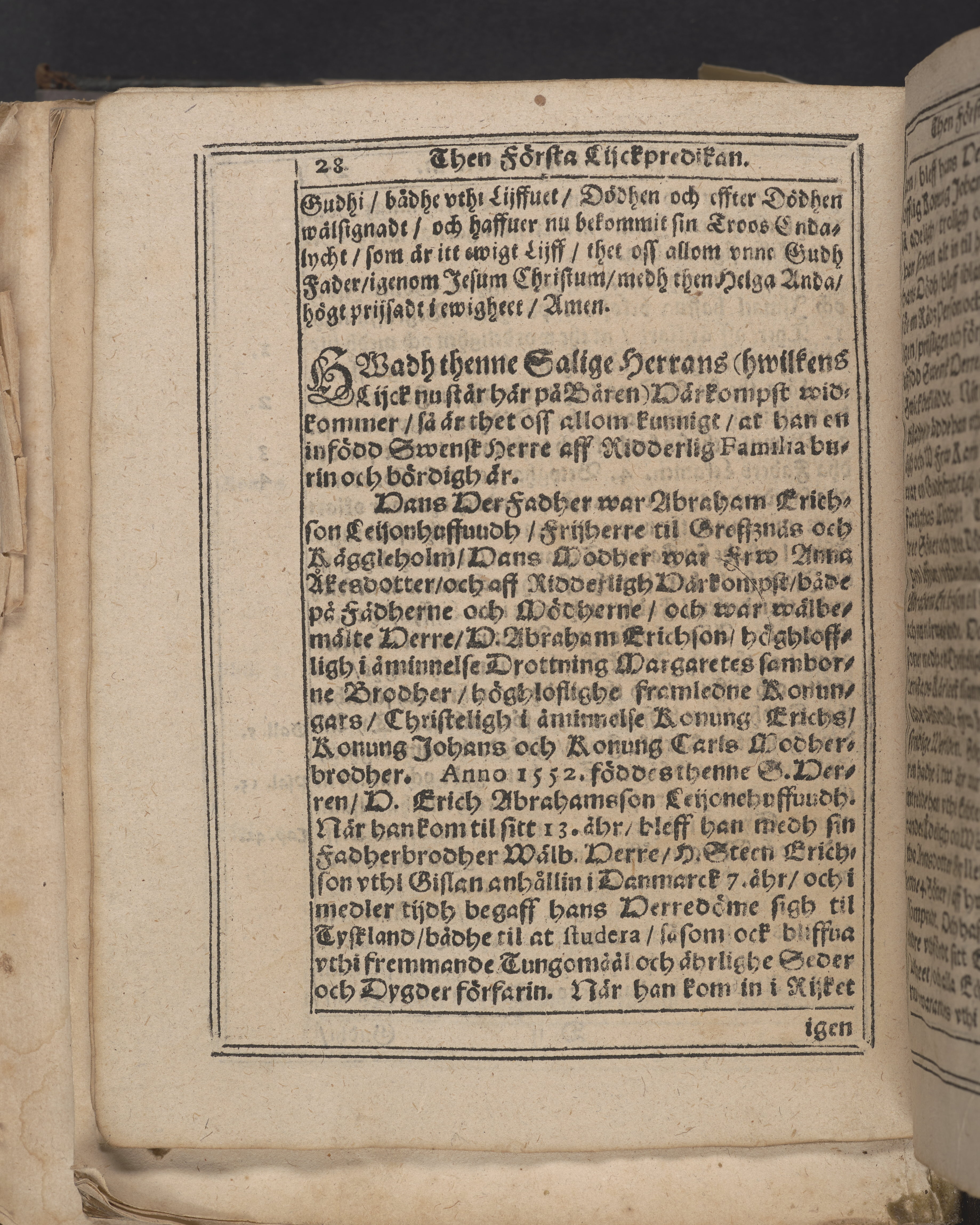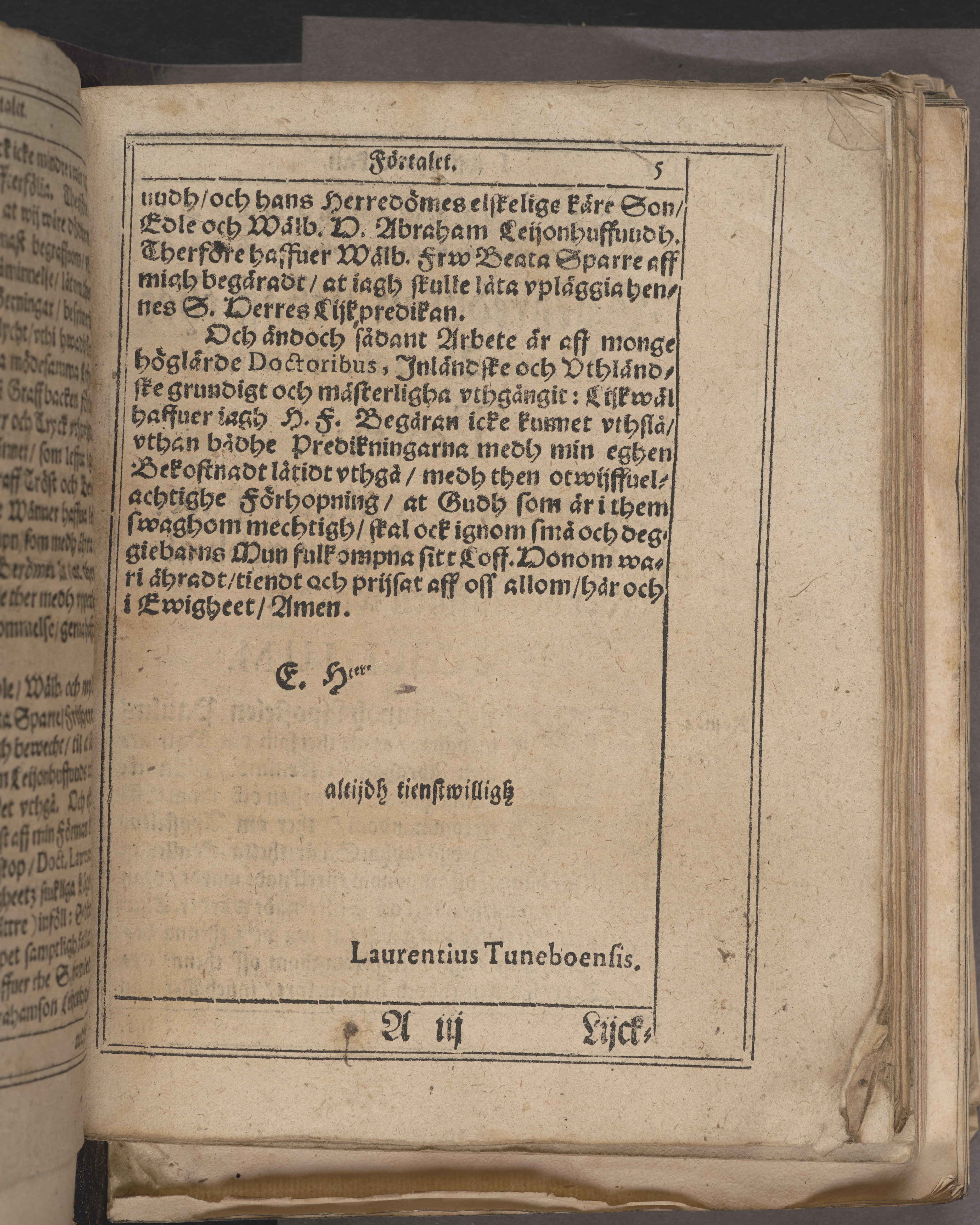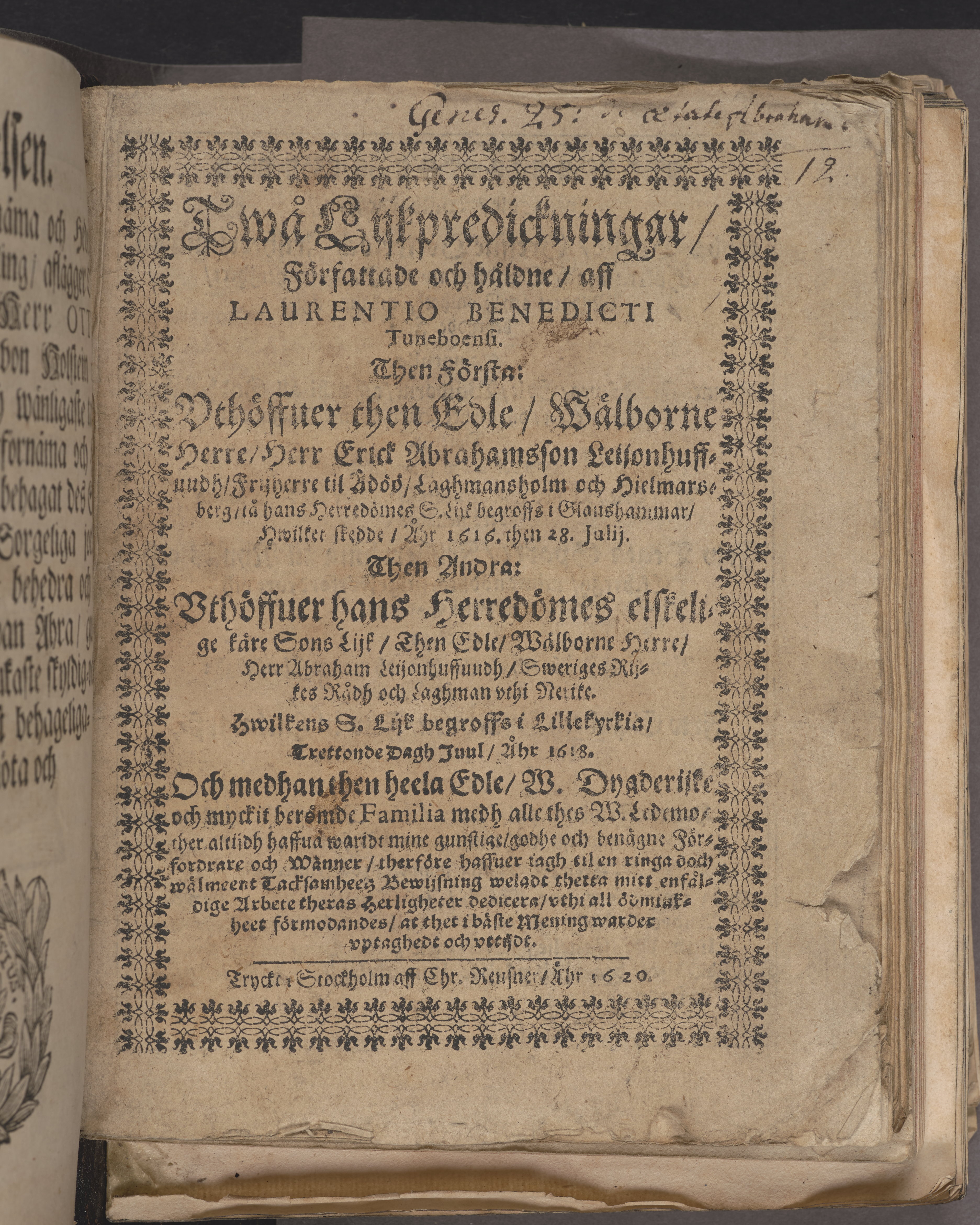 Twå lijkpredickningar, författade och håldne, aff Laurentio Benedicti Tuneboensi. Then första: Vthöffuer then edle, wälborne herre, Herr Erick Abrahamsson Leijonhuffuudh, frijherre til Ådöö ... tå hans herredömes s. lijk begroffs i Glaushammar, hwilket skedde, åhr 1616. then 28. julij. Then andra: Vthöffuer hans herredömes elskelige käre sons lijk, then edle, wälborne herre, Herr Abraham Leijonhuffuudh, Sweriges rijkes rådh och laghman vthi Nerike. Hwilkens s. lijk begroffs i Lillekyrkia, trettondedagh juul, åhr 1618 ... Tryckt i Stockholm aff Chr. Reusner, åhr 1620.