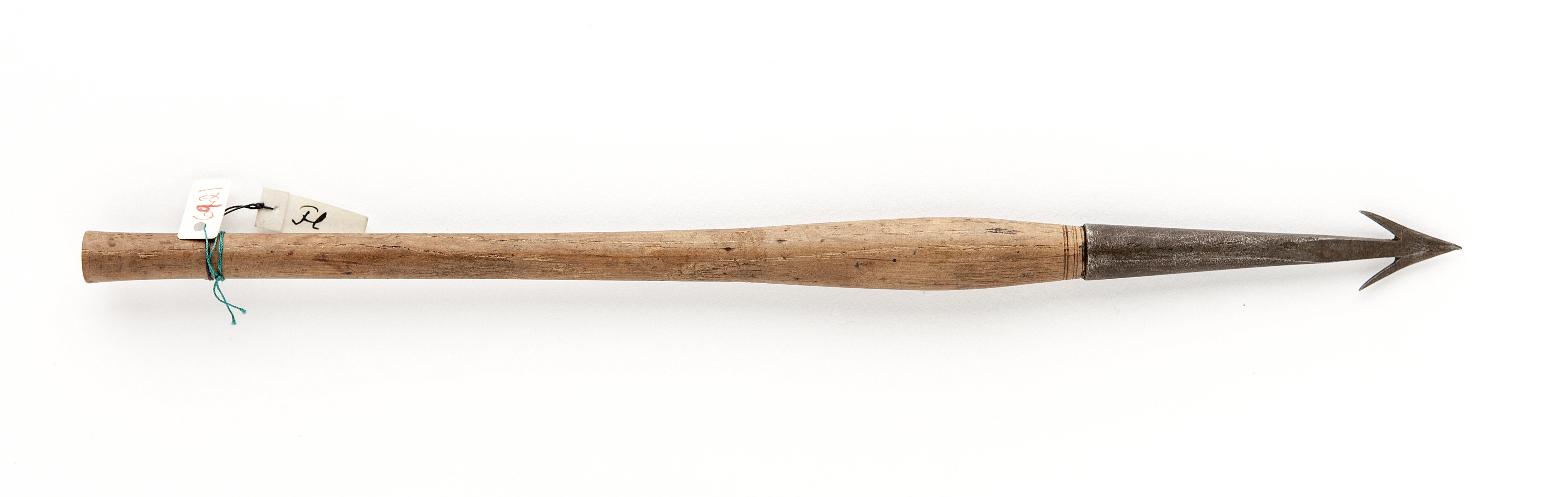 Spets av stål med hullingar på fyrkantig nedtill rund holk. Skaft av ljust trä med runt tvärsnitt, vidgande sig intill holken och där prytt med fina linjer runtom, smalnande bakåt och åter vidgar vid pilstjärten.