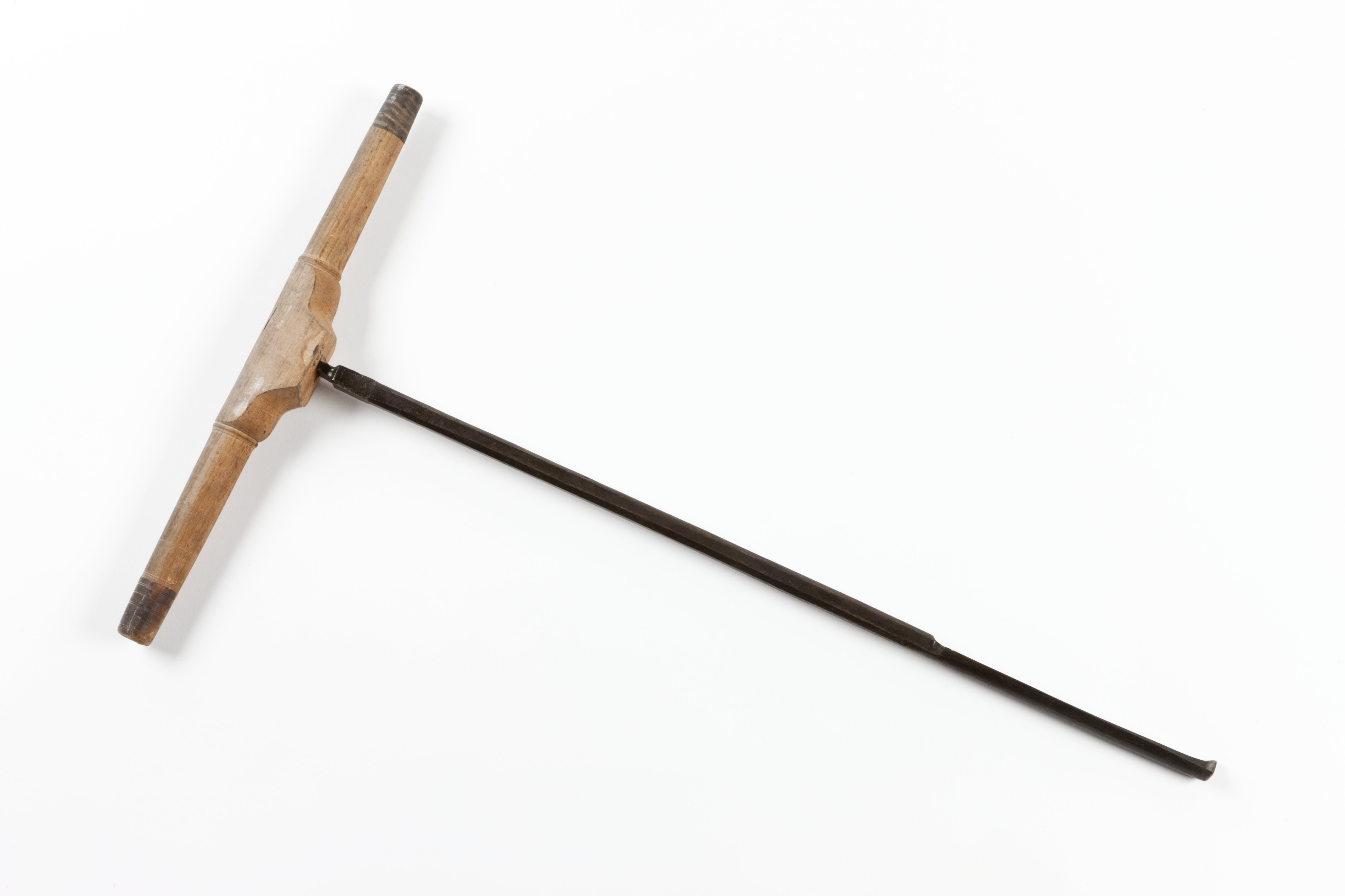 Fyrsidigt stål med avfasade kanter och skålad borr. Svartsmide. Stämpel: "I" på två ställen. Svarvat, profilerat handtag av ask? med hornringar i ändarna.