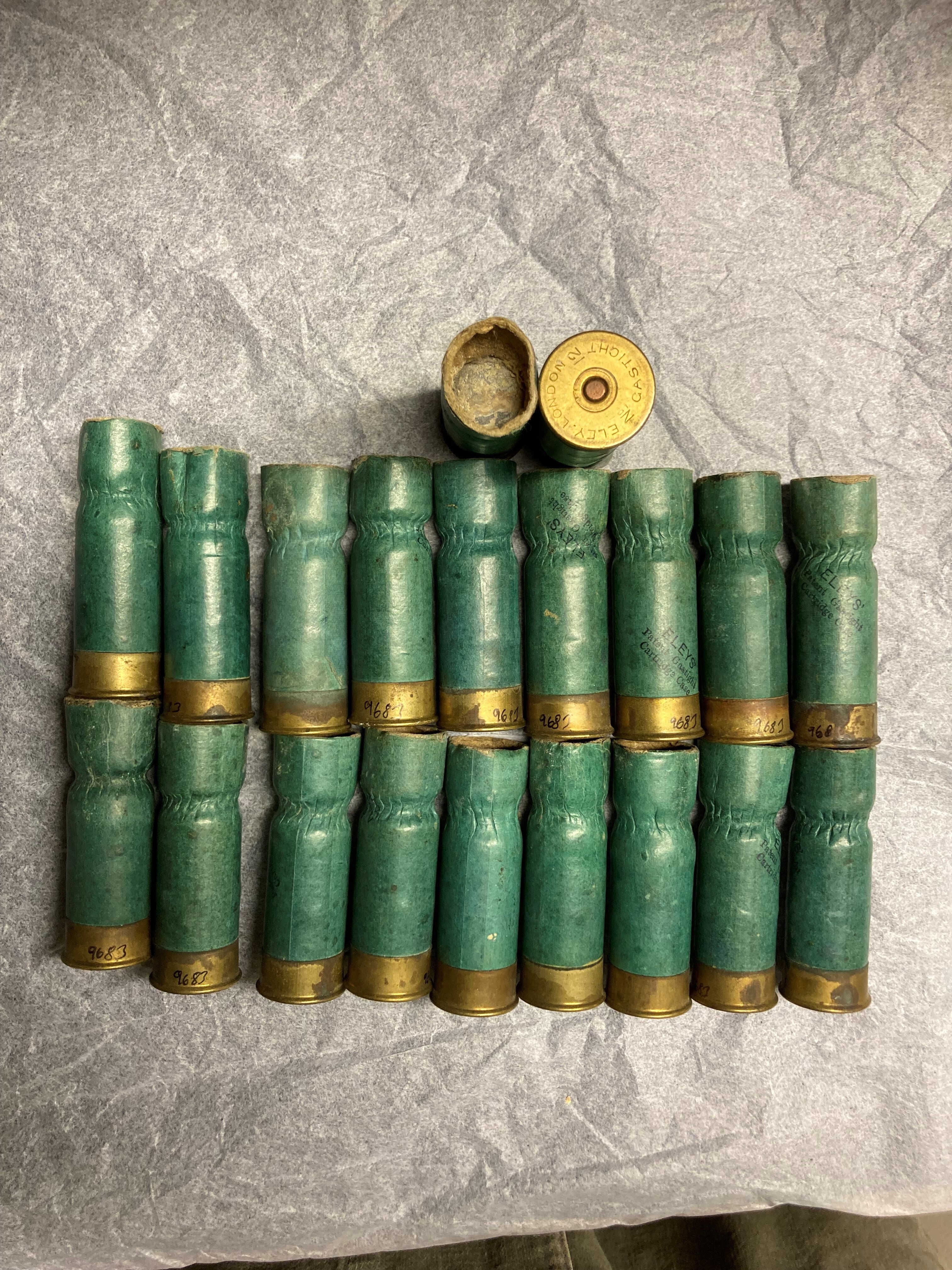 Patronbotten av mässing med fläns, koppartändhatt, runt tändhatten text: "ELEY LONDON GASTIGHT" i cirkel samt tvärgående:" No 12". Hylsa av grön papp, på de flesta med svart tryckt text:" ELEYS' // Patent Gastight // Cartridge Case". Hylsan stukad ovanför kulan. Förvaras i ammunitionslåda nr 9679.