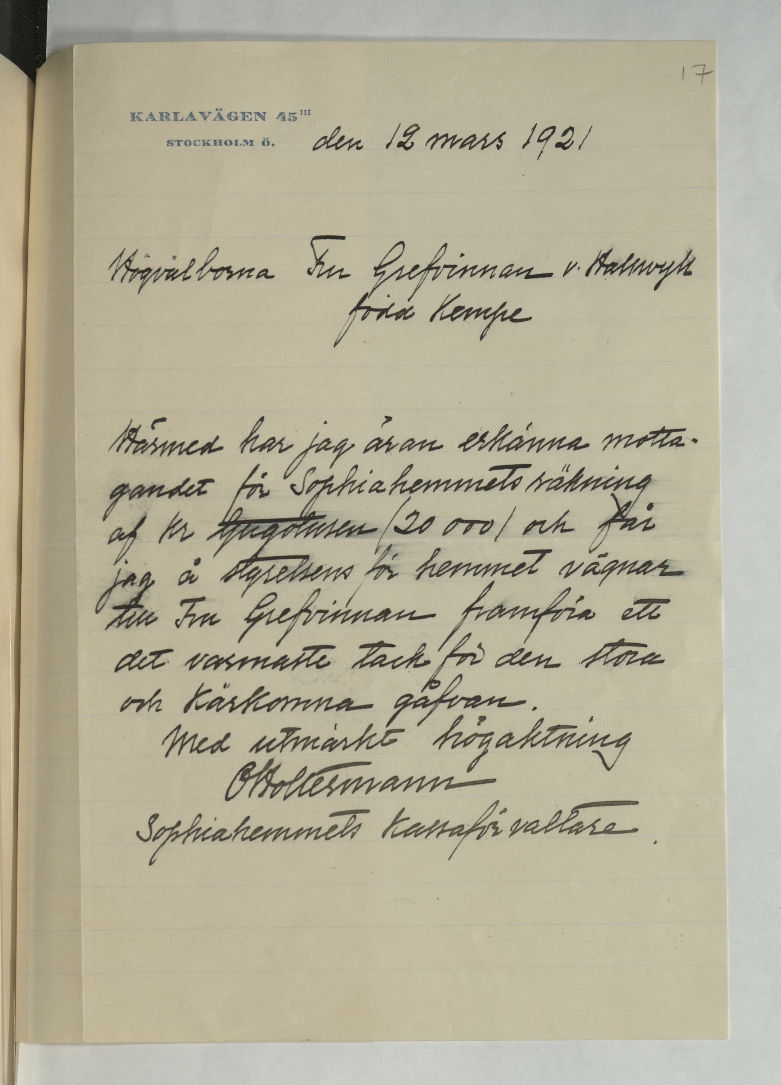 Tackbrev från Sophiahemmet för penningbidrag, 1921