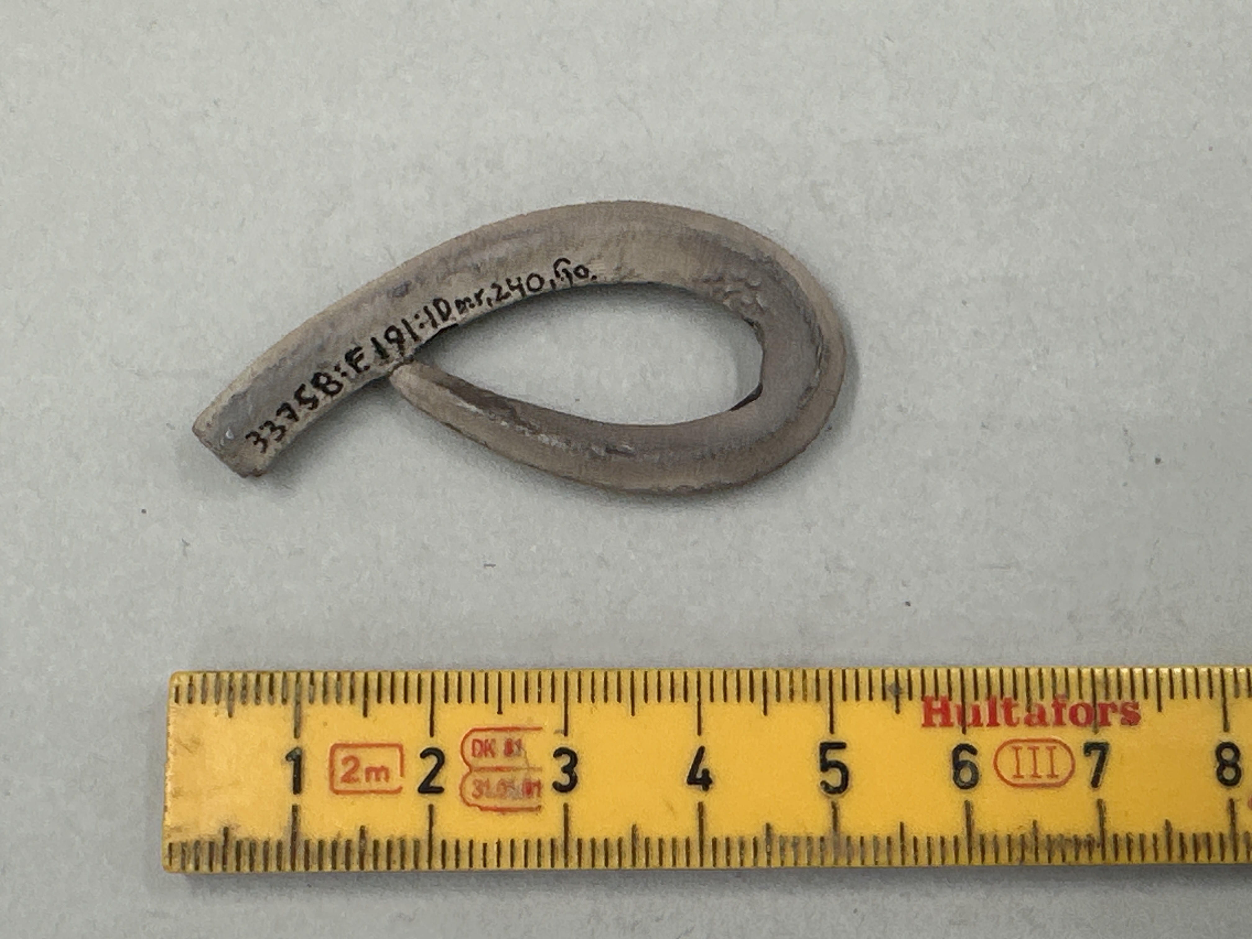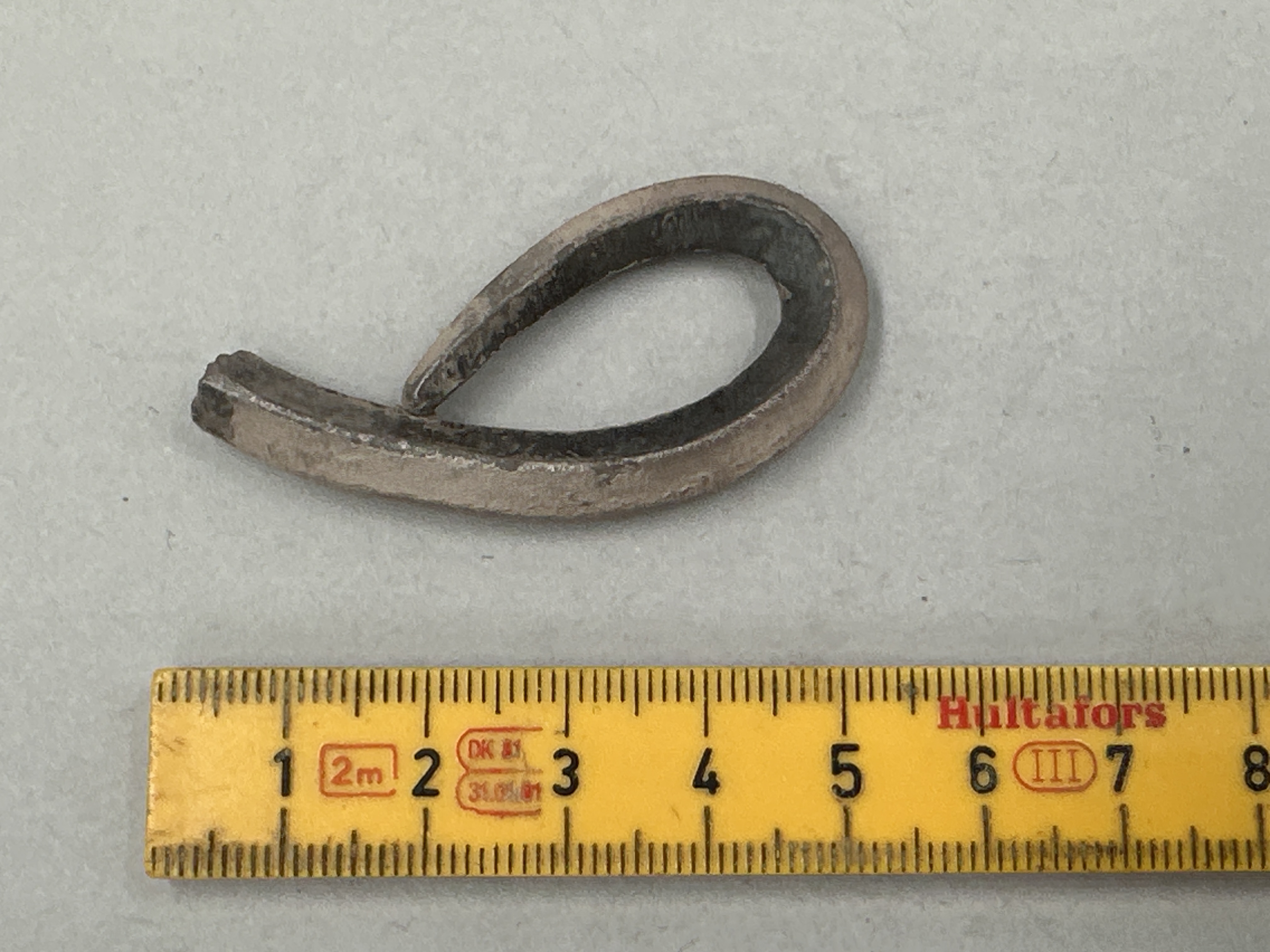 Fyrsidig ten med avsmalnande ände. Avbruten i den ena änden. Böjd till ögleform.