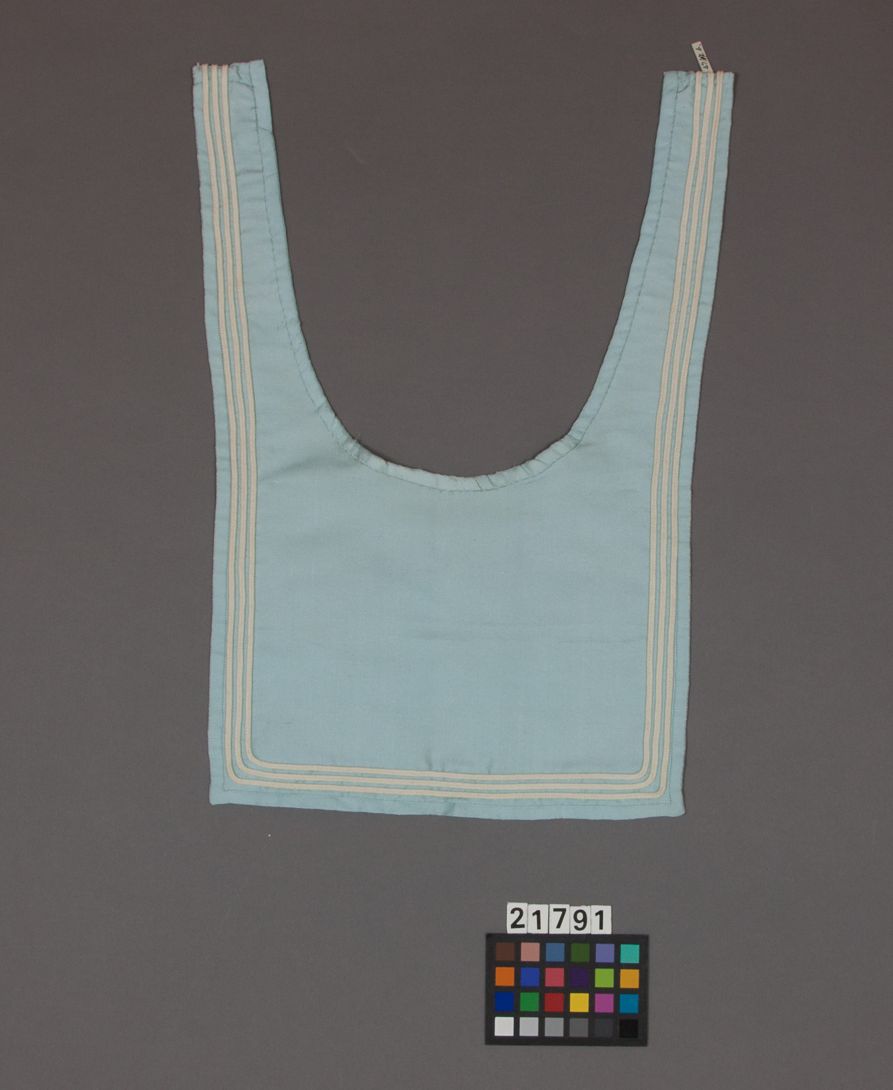Sjömanskrage i ljusblått kypertvävt siden. Längs med hela kragens kant sitter tre stycken vita bomullsband. Fodrade med ljusblå sidentaft.
