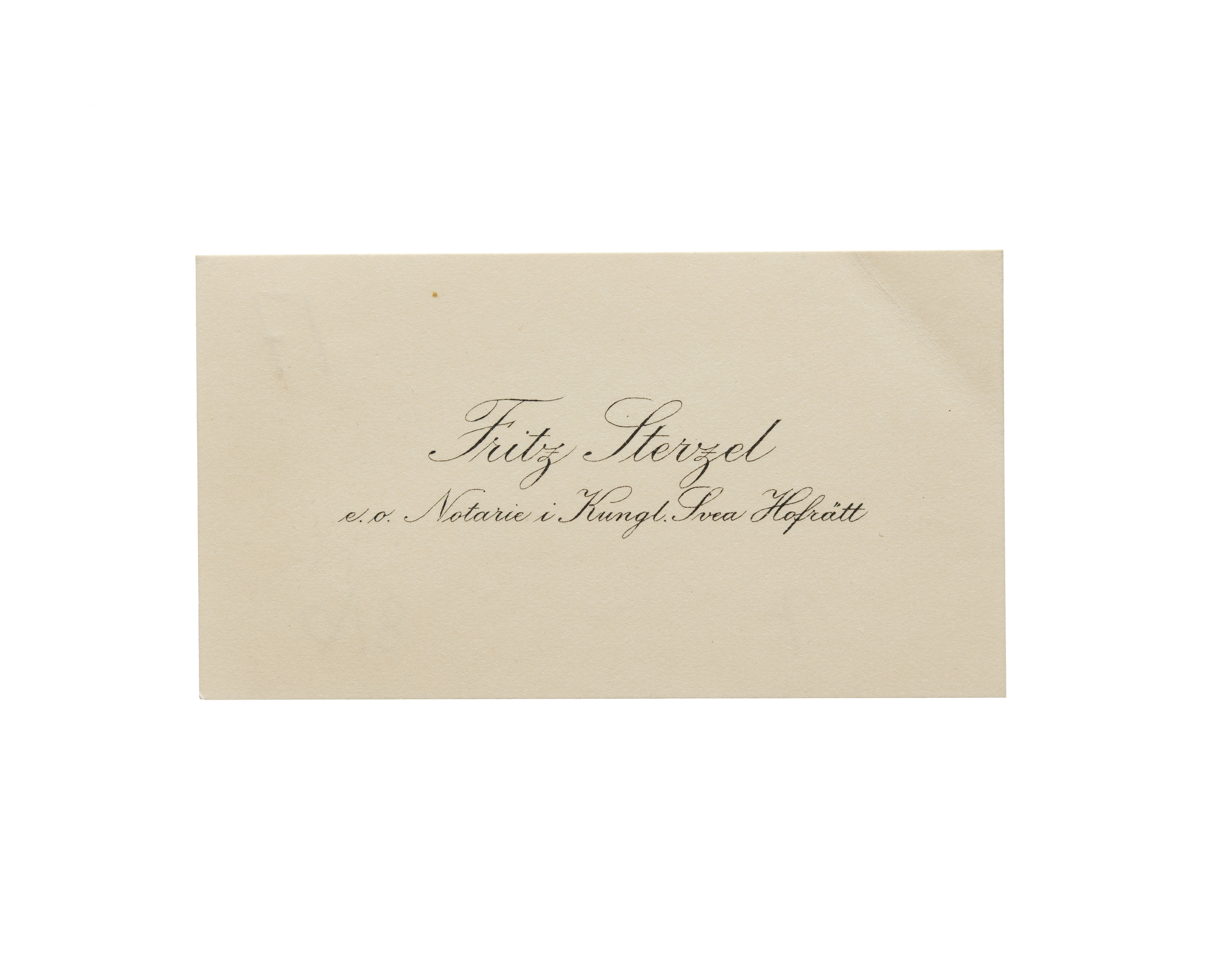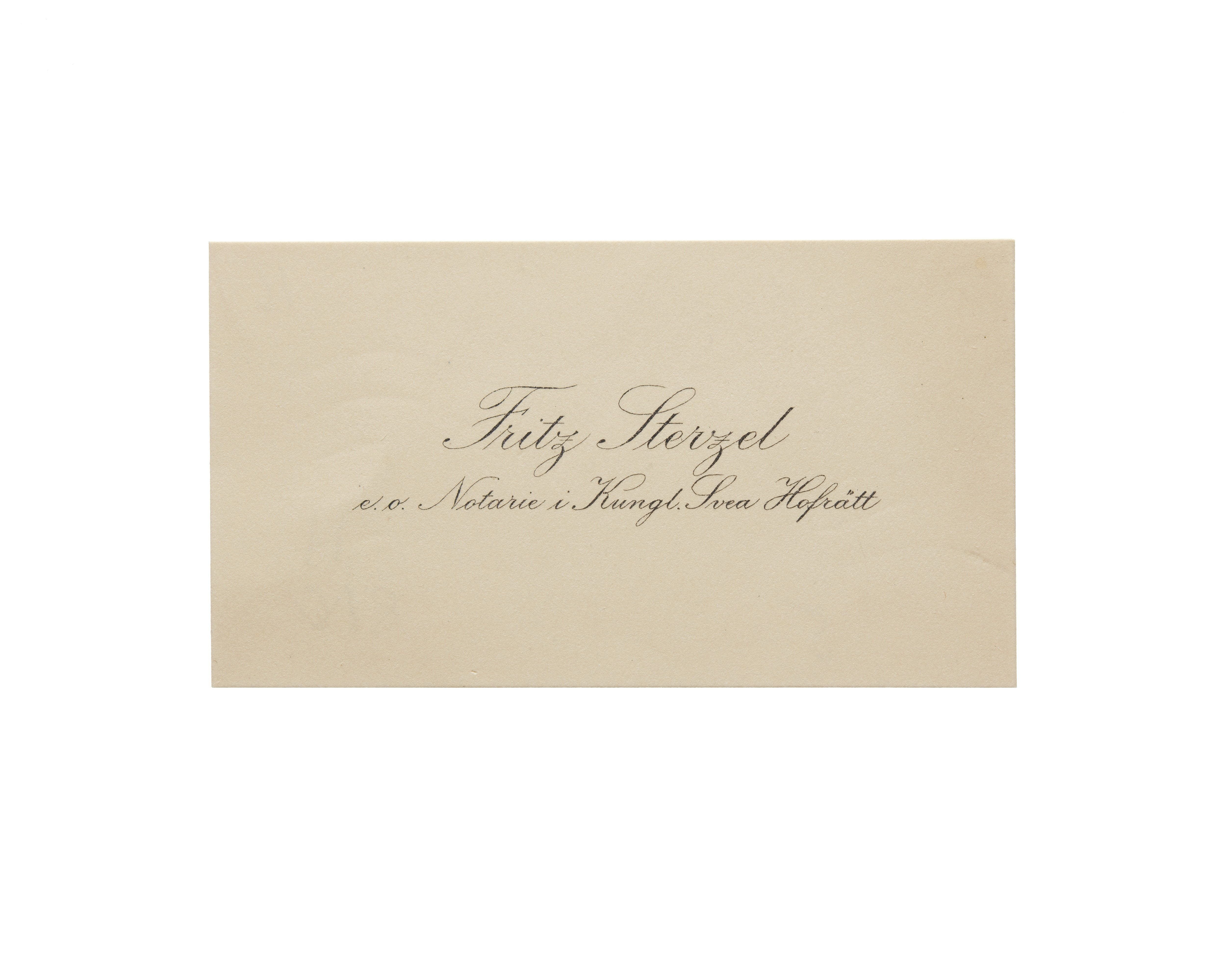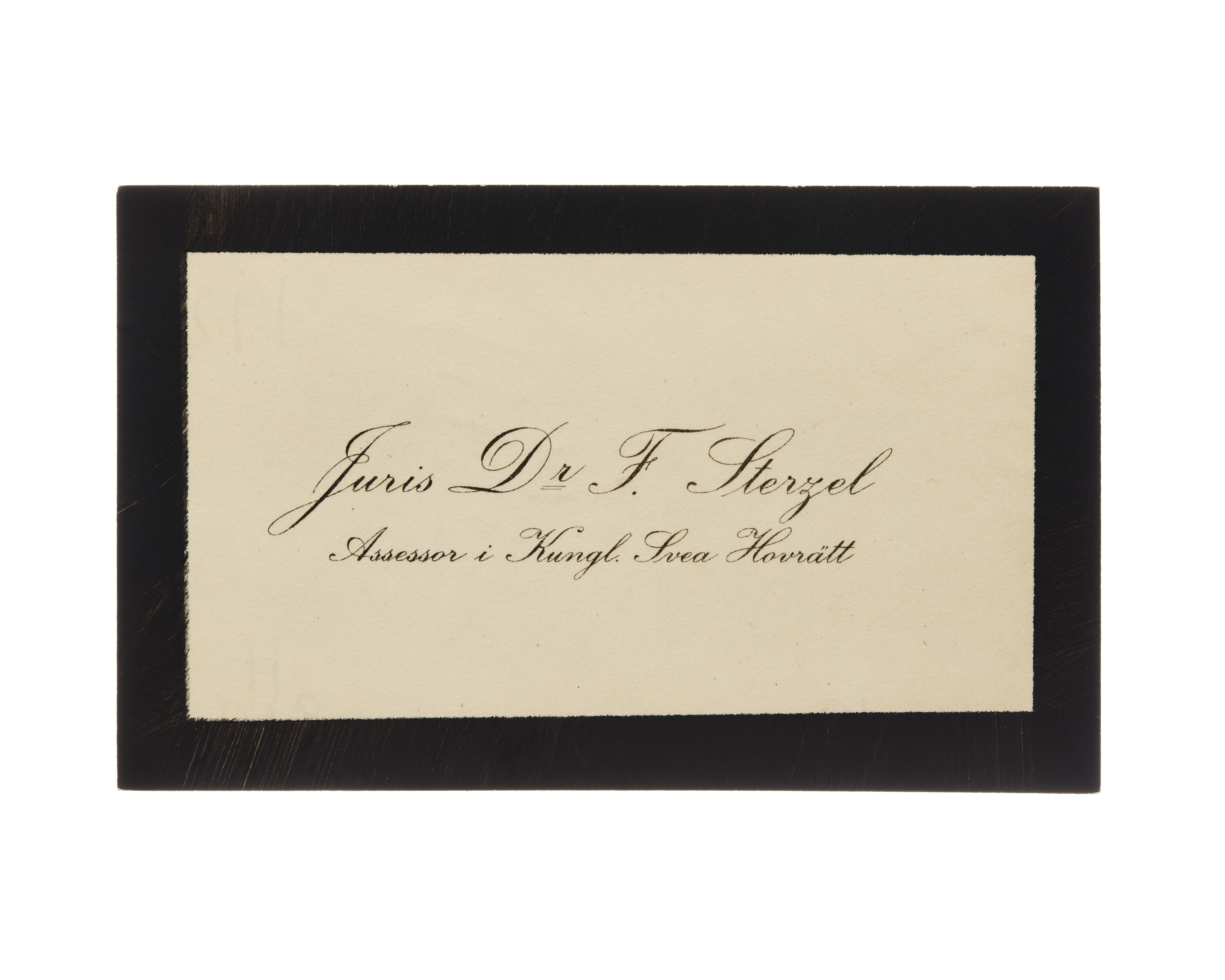 Fjorton visitkort från Juris Dr. Fritz Sterzel, docent vid Uppsala Universitet och assessor i Kungl. Svea Hovrätt. Första kortet daterat 1916. Andra kortet daterat 1916. Tredje kortet daterat 1916, vikt i högra sidan. Fjärde kortet daterat 1916, vikt i högra sidan. Femte kortet daterat 1916. Sjätte kortet daterat 1917. Sjunde kortet daterat 1917, vikt i övre högra hörnet. Åttonde kortet daterat 1917, vikt i övre högra hörnet. Nionde kortet daterat 1918, vikt i högra sidan. Tionde kortet daterat 1918, vikt i vänstra sidan. Elfte kortet daterat 1919. Tolfte kortet daterat 1919-1920. Trettonde kortet daterat 1922 samt sorgkant. Fjortonde kortet daterat 1923, vikt i högra sidan.