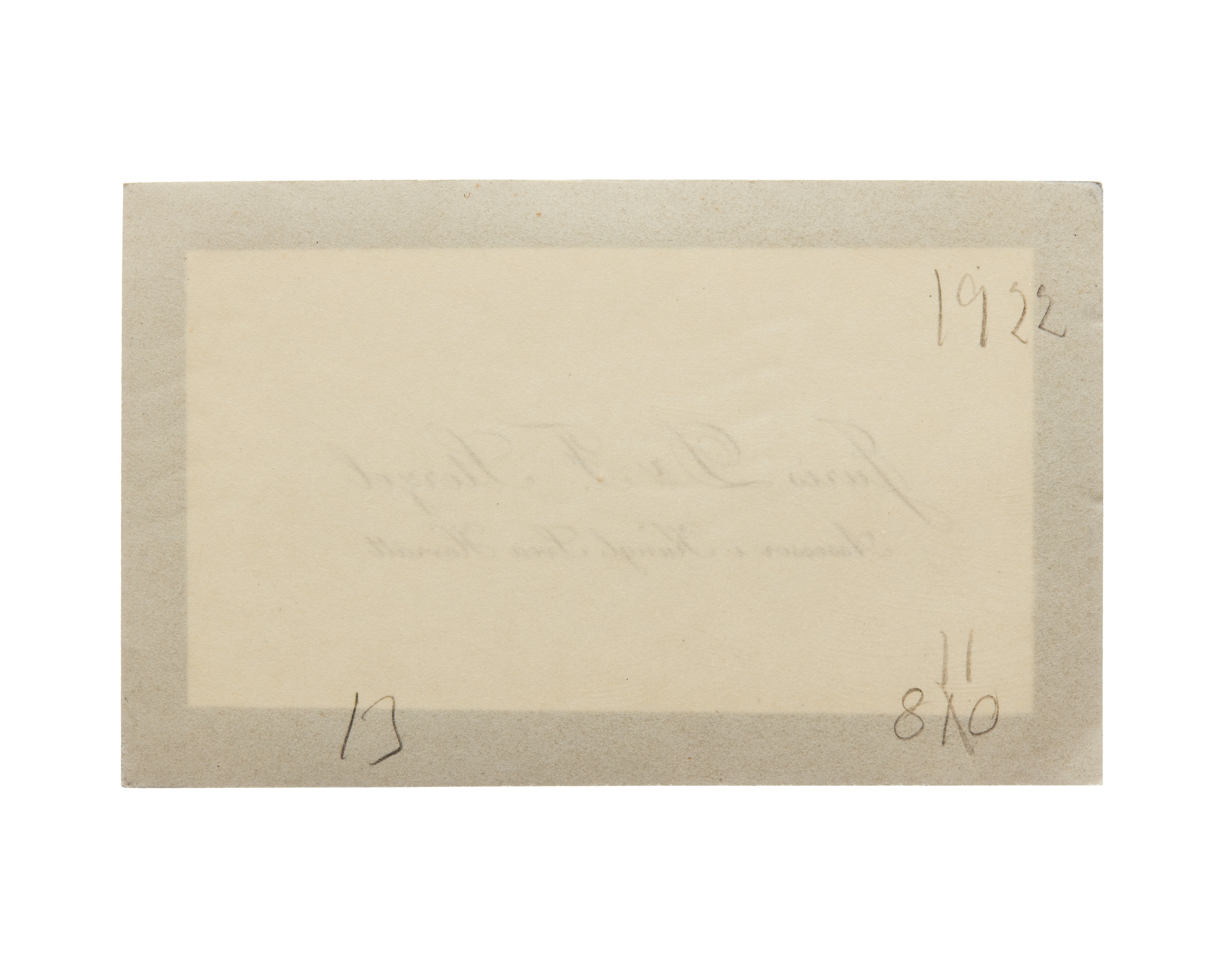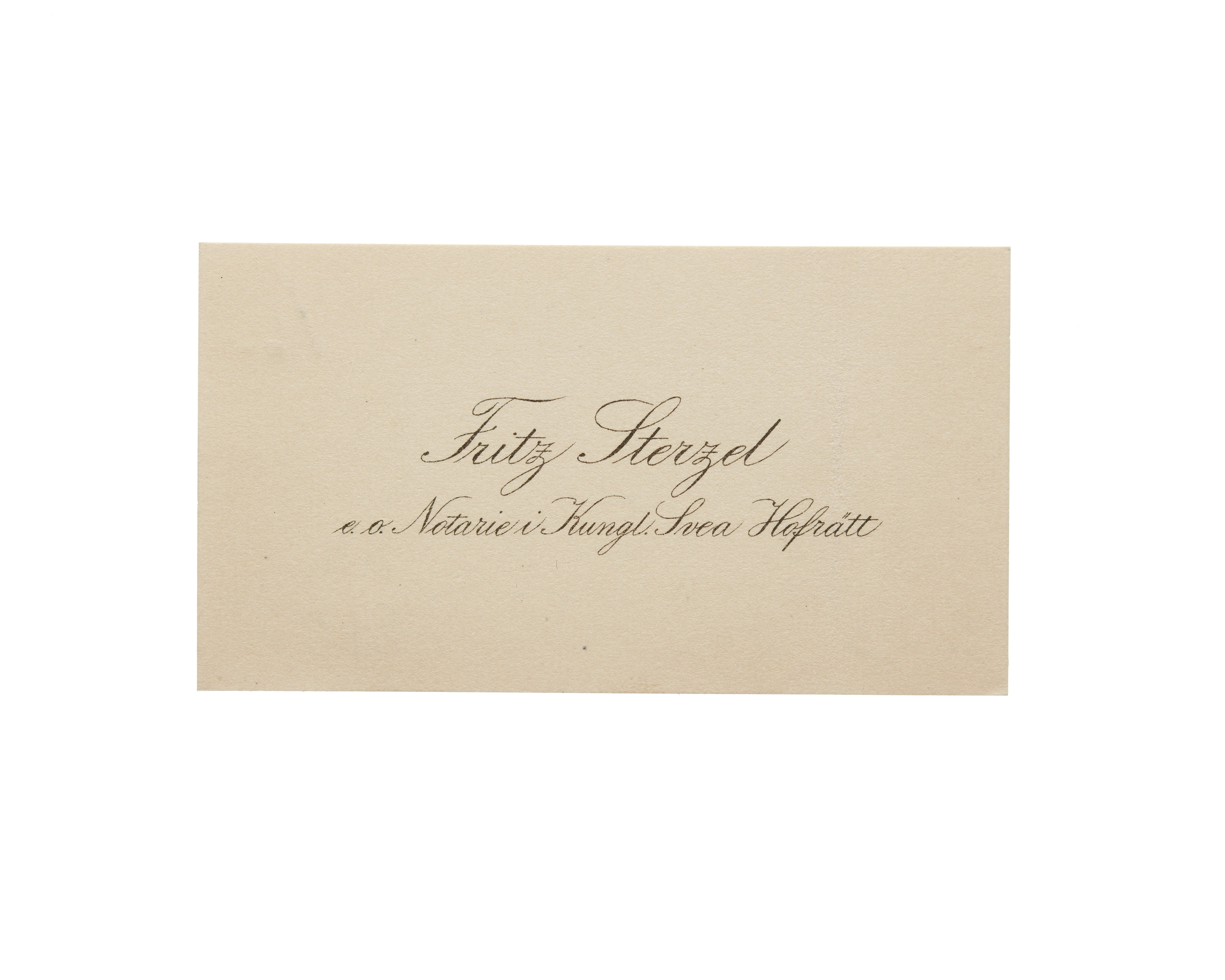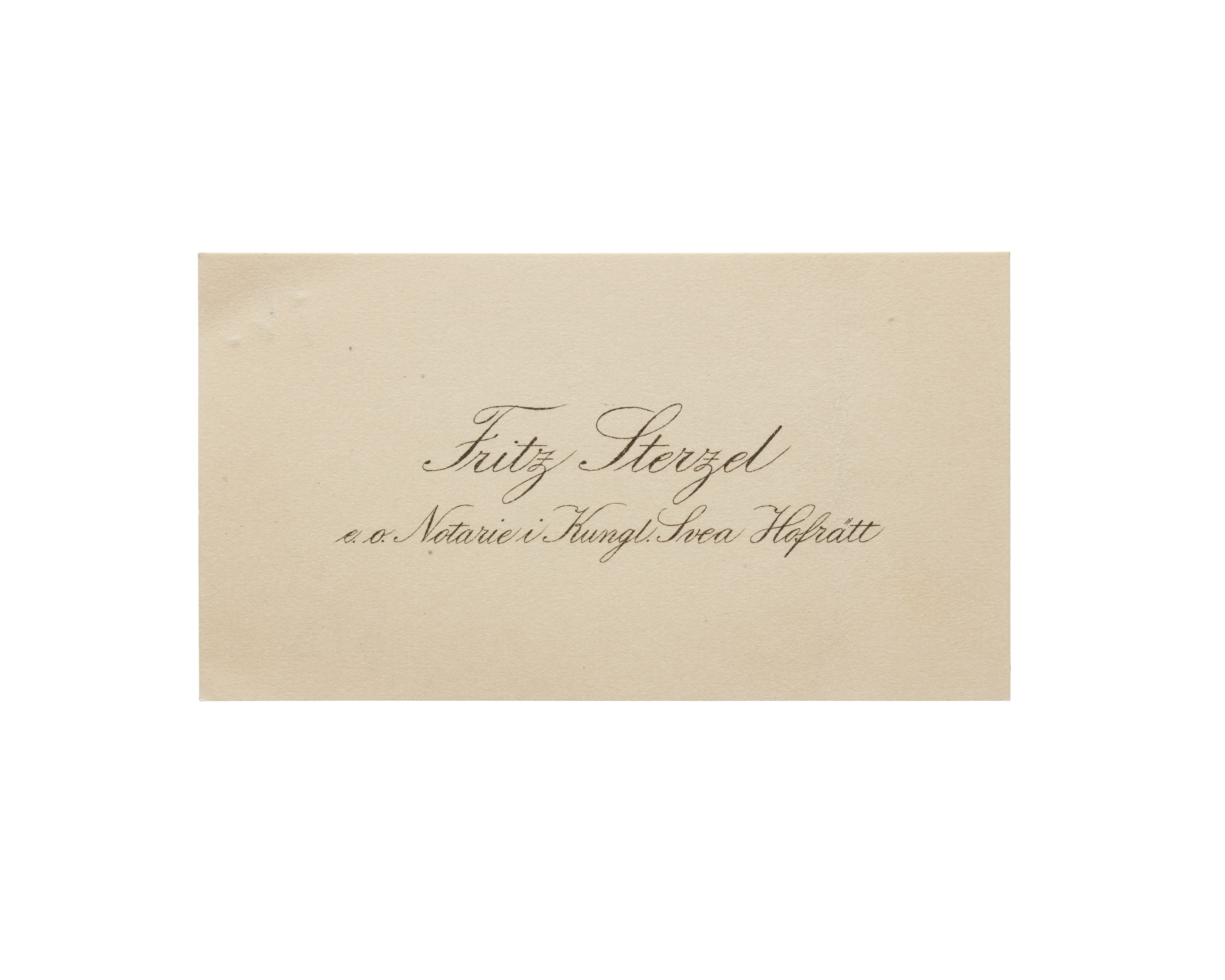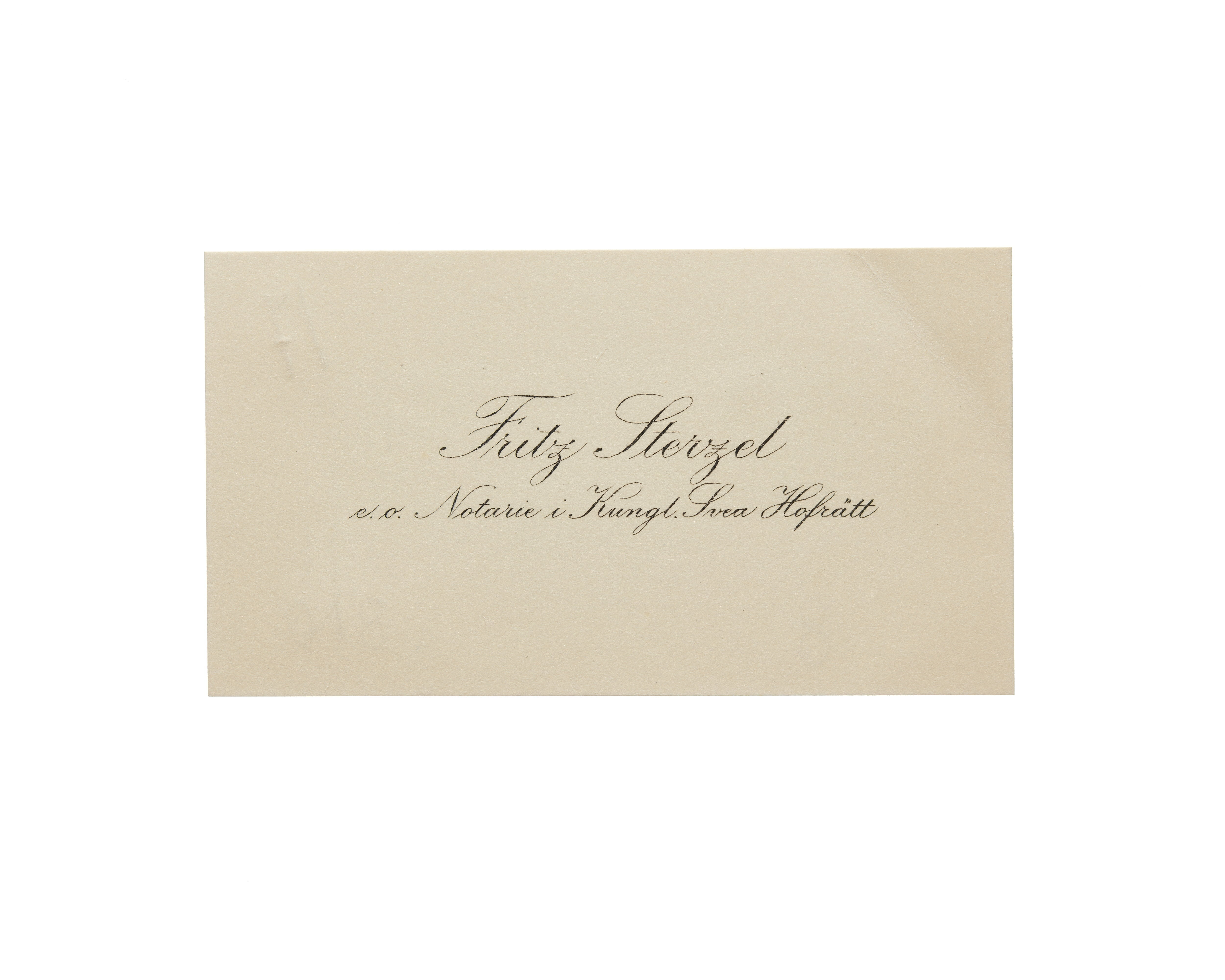 Fjorton visitkort från Juris Dr. Fritz Sterzel, docent vid Uppsala Universitet och assessor i Kungl. Svea Hovrätt. Första kortet daterat 1916. Andra kortet daterat 1916. Tredje kortet daterat 1916, vikt i högra sidan. Fjärde kortet daterat 1916, vikt i högra sidan. Femte kortet daterat 1916. Sjätte kortet daterat 1917. Sjunde kortet daterat 1917, vikt i övre högra hörnet. Åttonde kortet daterat 1917, vikt i övre högra hörnet. Nionde kortet daterat 1918, vikt i högra sidan. Tionde kortet daterat 1918, vikt i vänstra sidan. Elfte kortet daterat 1919. Tolfte kortet daterat 1919-1920. Trettonde kortet daterat 1922 samt sorgkant. Fjortonde kortet daterat 1923, vikt i högra sidan.