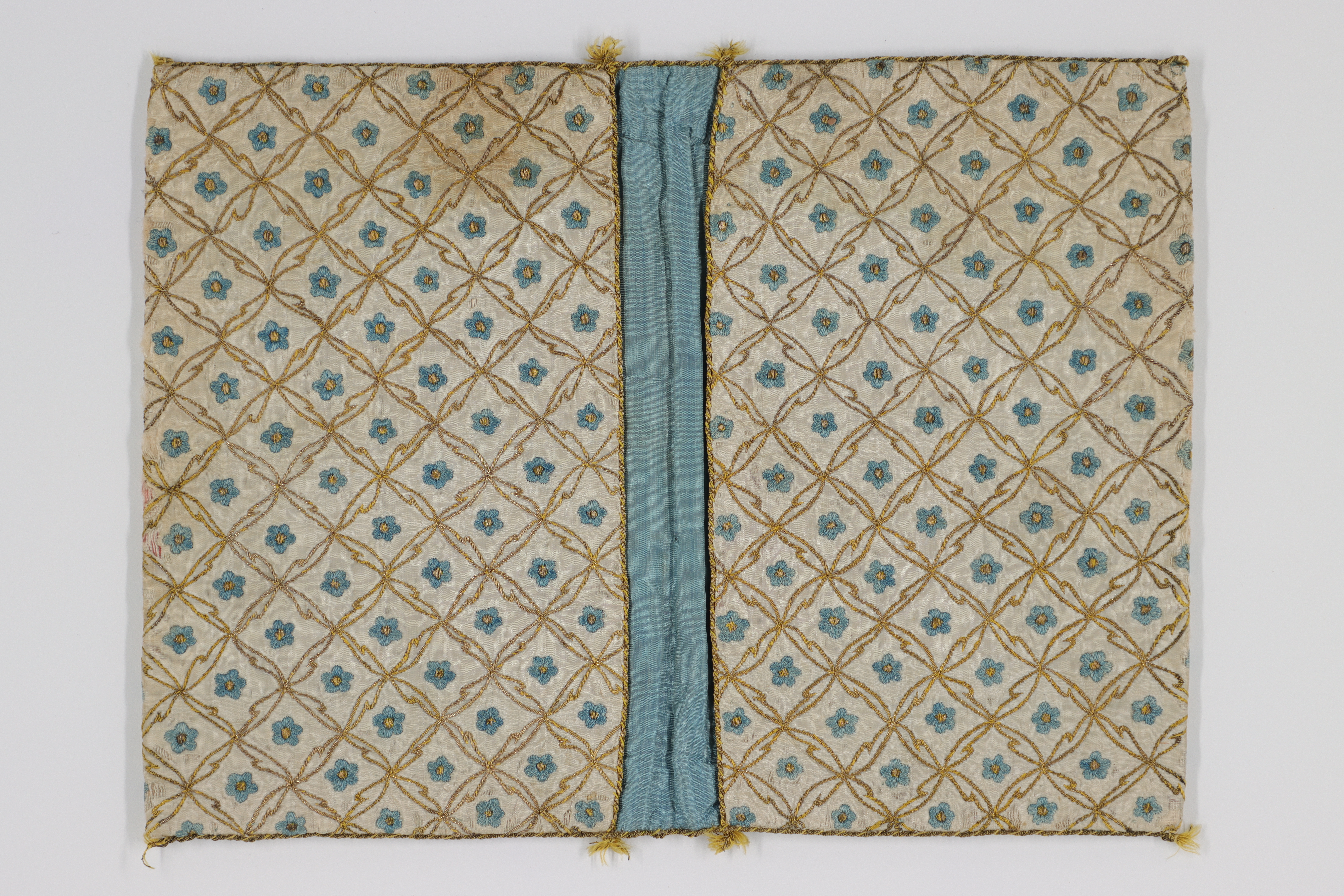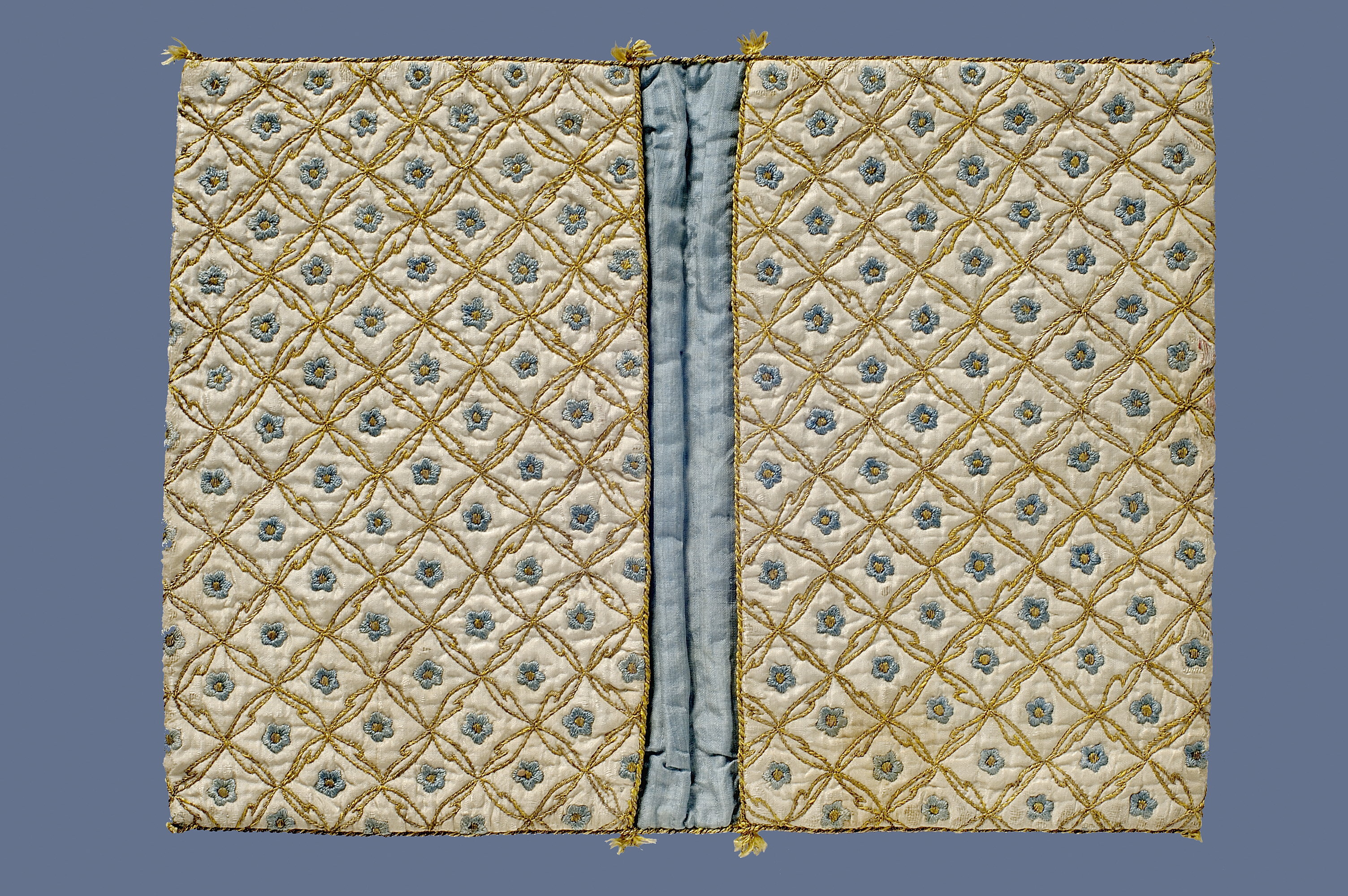 Matelasserad plånbok av vitt siden med broderade blå blommor i guldfärgat rutmönster. Kantad med gult/guldfärgat snöre. Likadan på insidan. Två fack som är fodrade med ljusblått siden.
