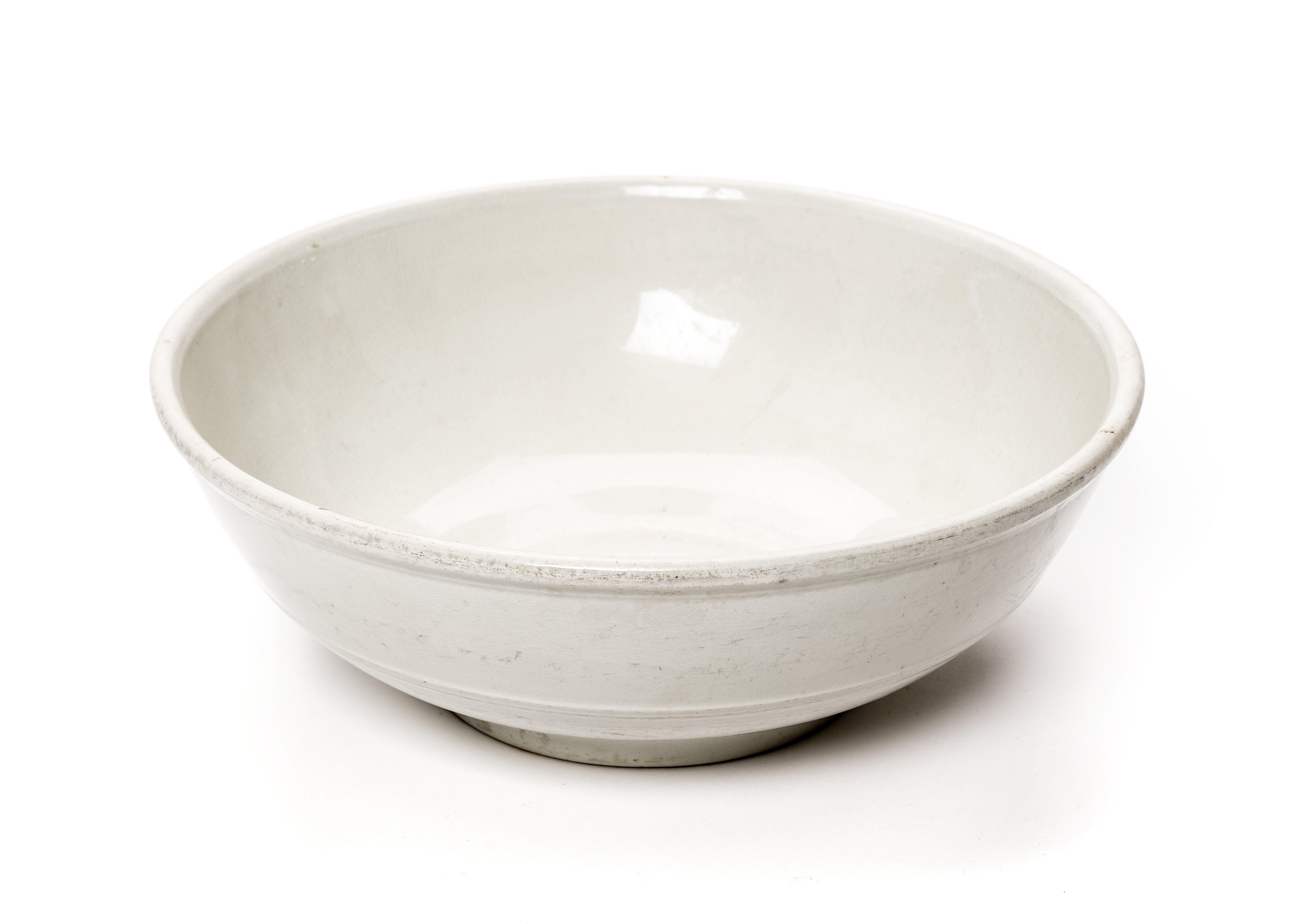 Handfat av vitglaserat flintporslin, halvsfäriskt med fotring.