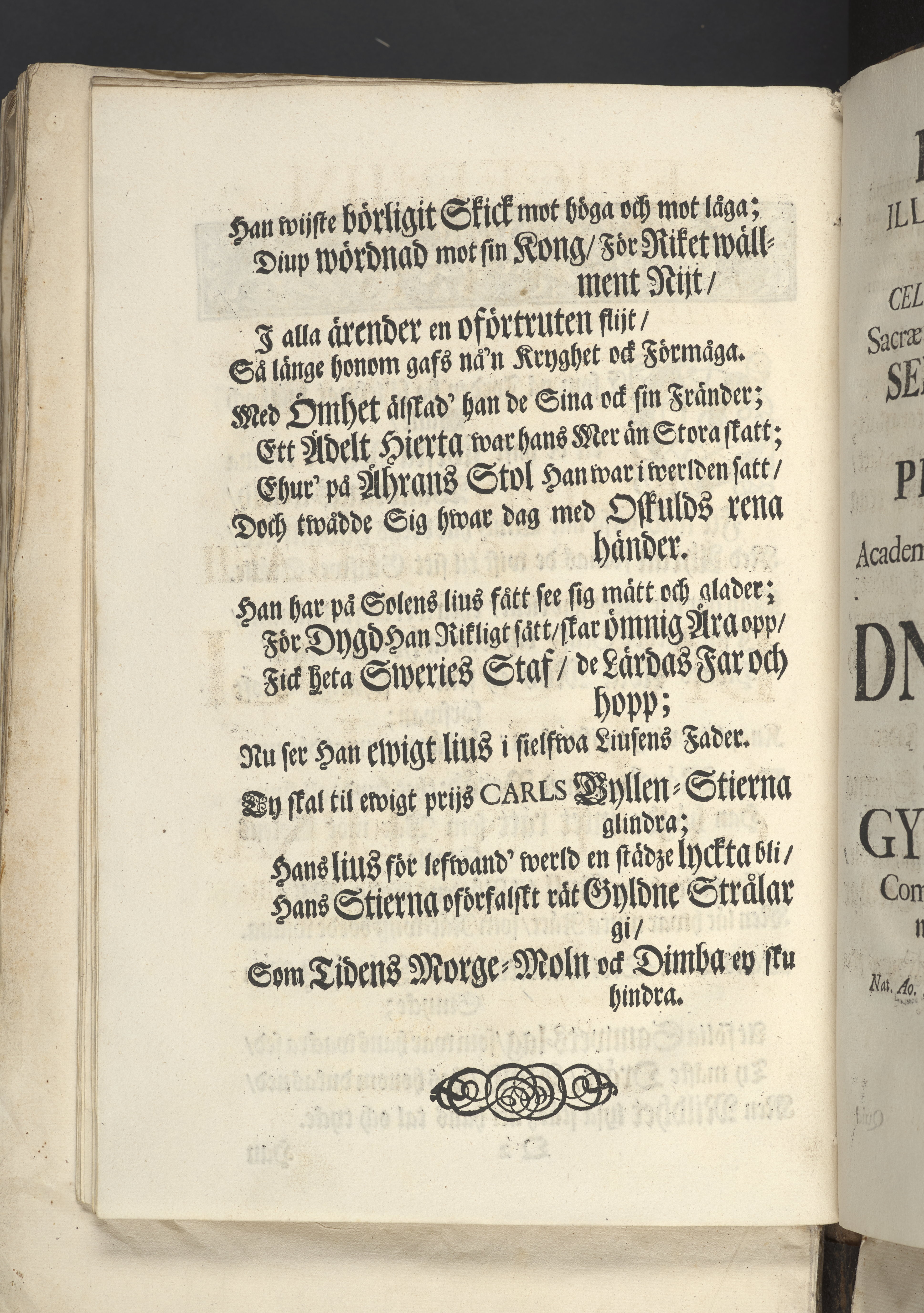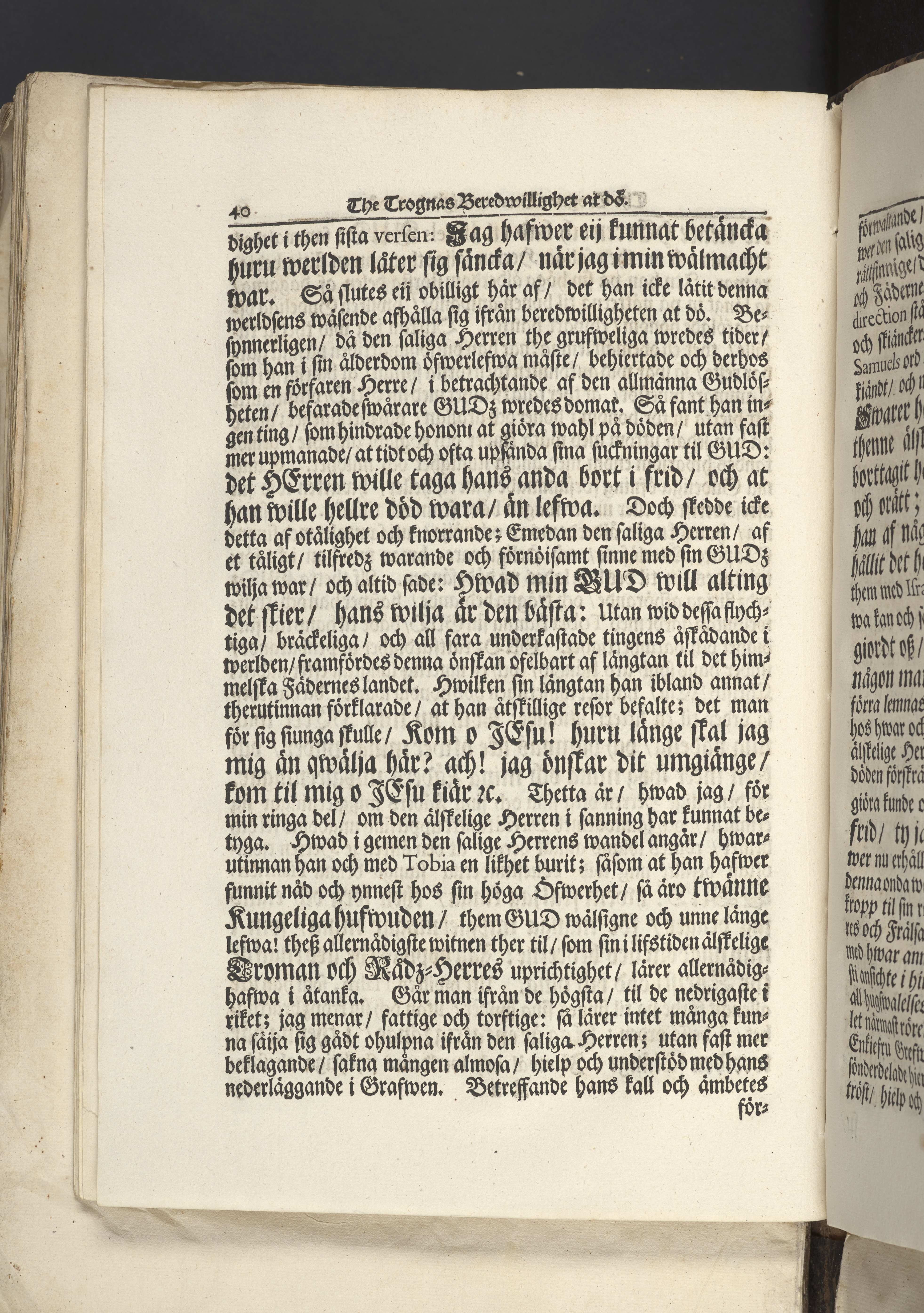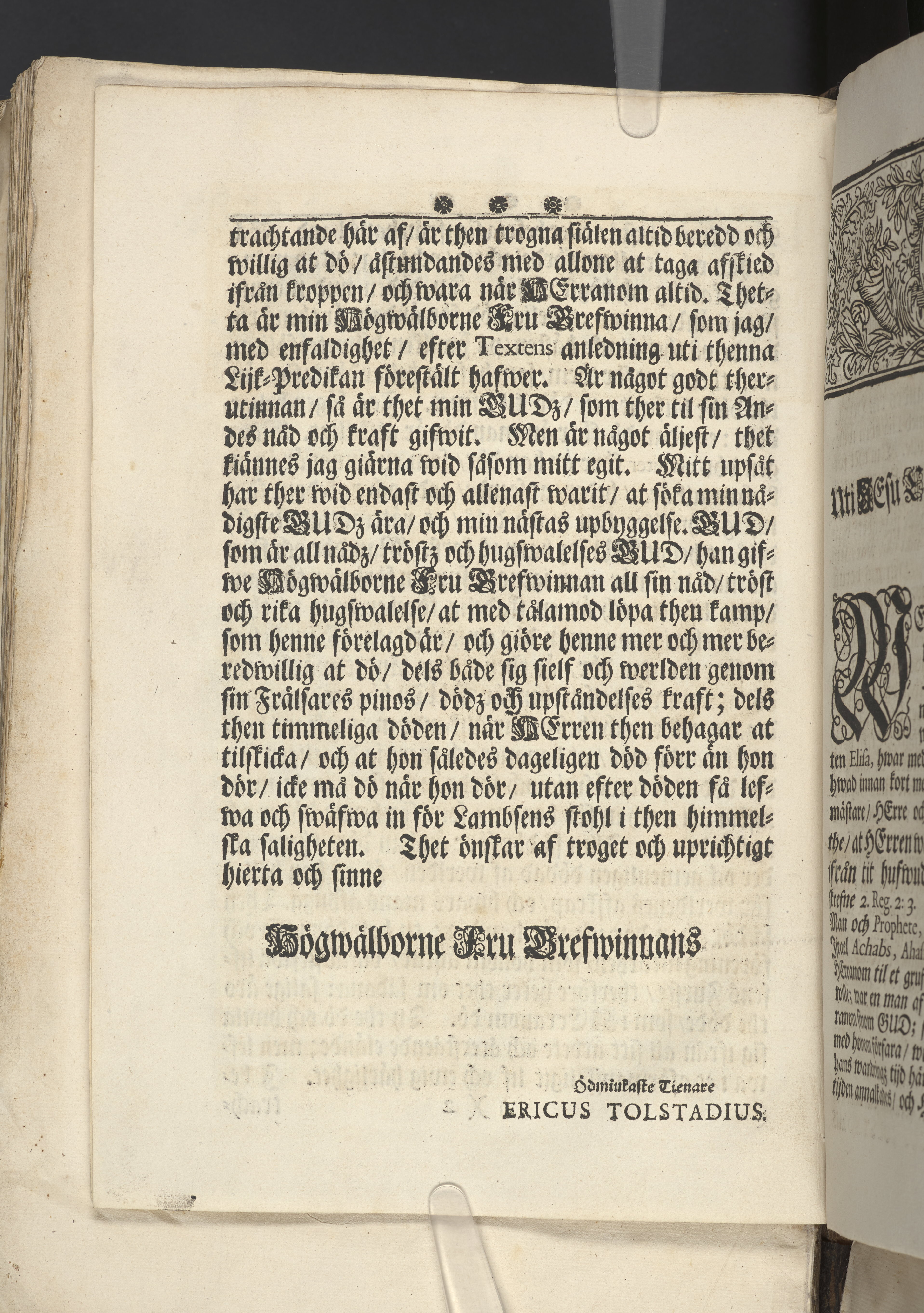 The trognas beredwillighet at dö. Betrachtades i anledning af Tobiæ 3. cap. 3: och 6. verser. Wid hans kongl. majestetz högt-betrodde manns, riksens rådz, præsidents uti kongl. Swea hof-rätt, och Åbo academiæ cancellers ... Carl Gyllenstiernas ... högt-ansenliga jordafärd, uti Riddarholms-kyrckan i Stockholm den 30. junii, åhr 1723. Uti en christelig och enfaldig lijk-predikan förestäld; men sedermera efter begiäran til trycket befordrad, af Erico Tolstadio. Stockholm, tryckt hos Joh. Laur. Horrn, kongl. antiquit. archivi boktr.
