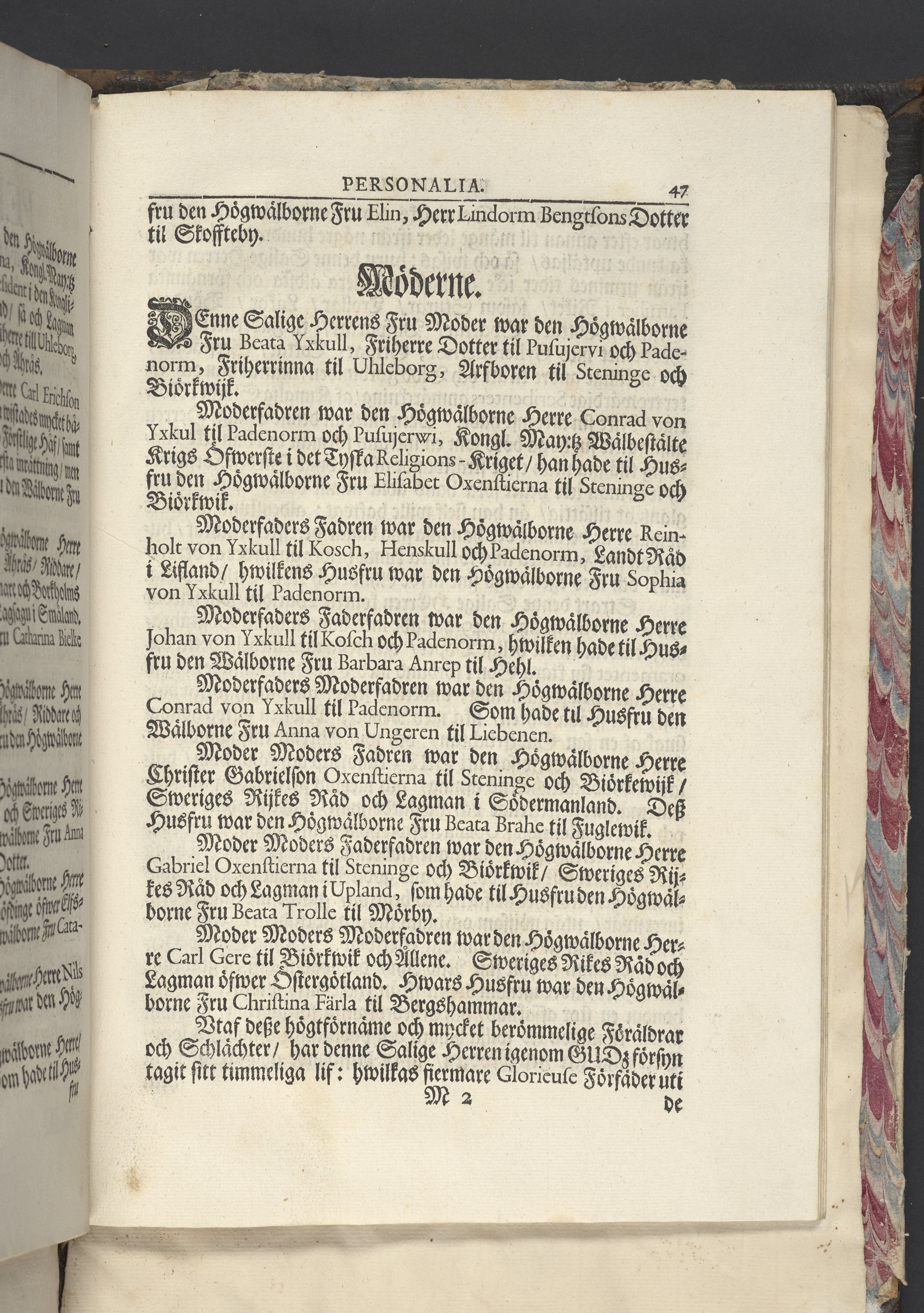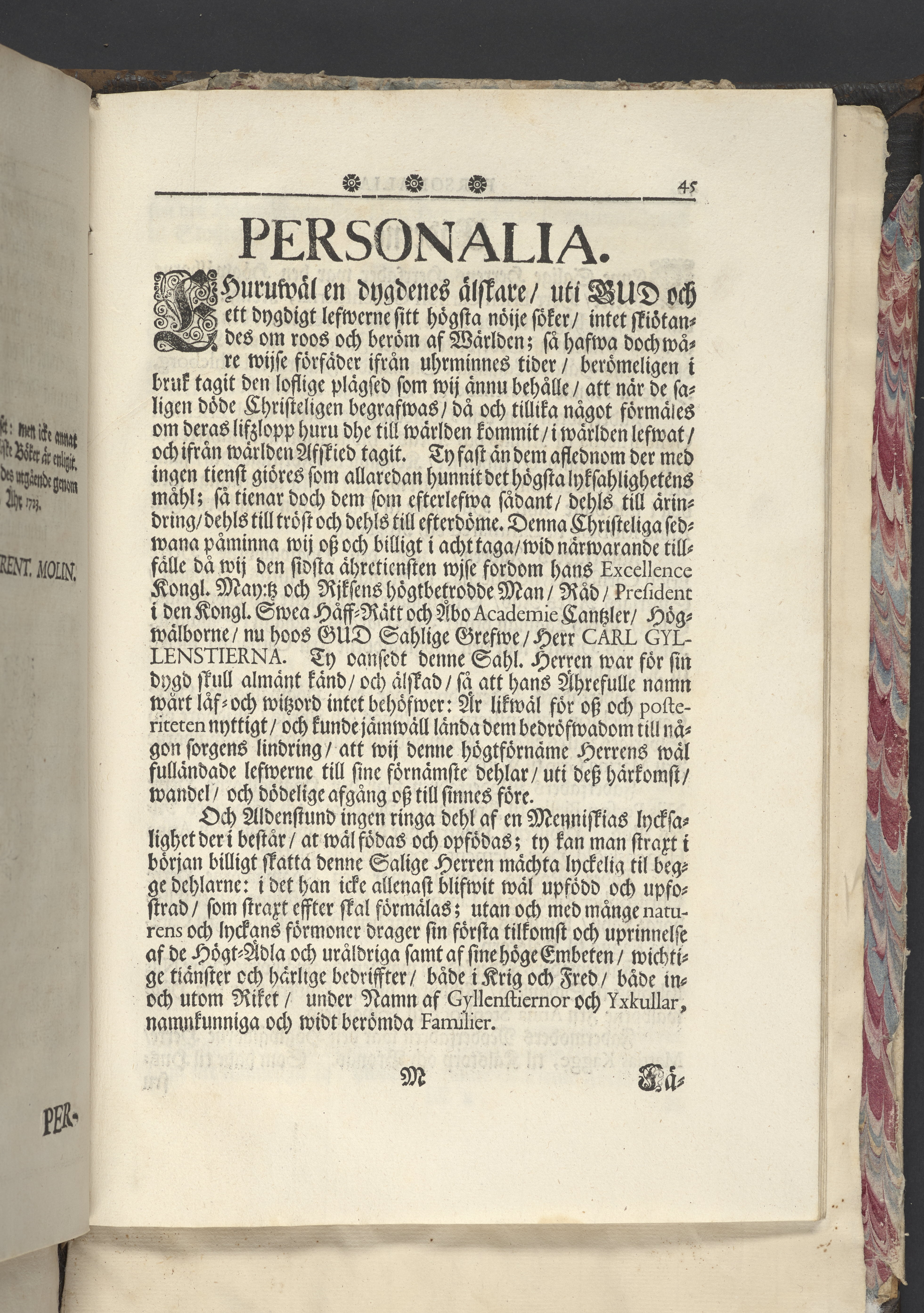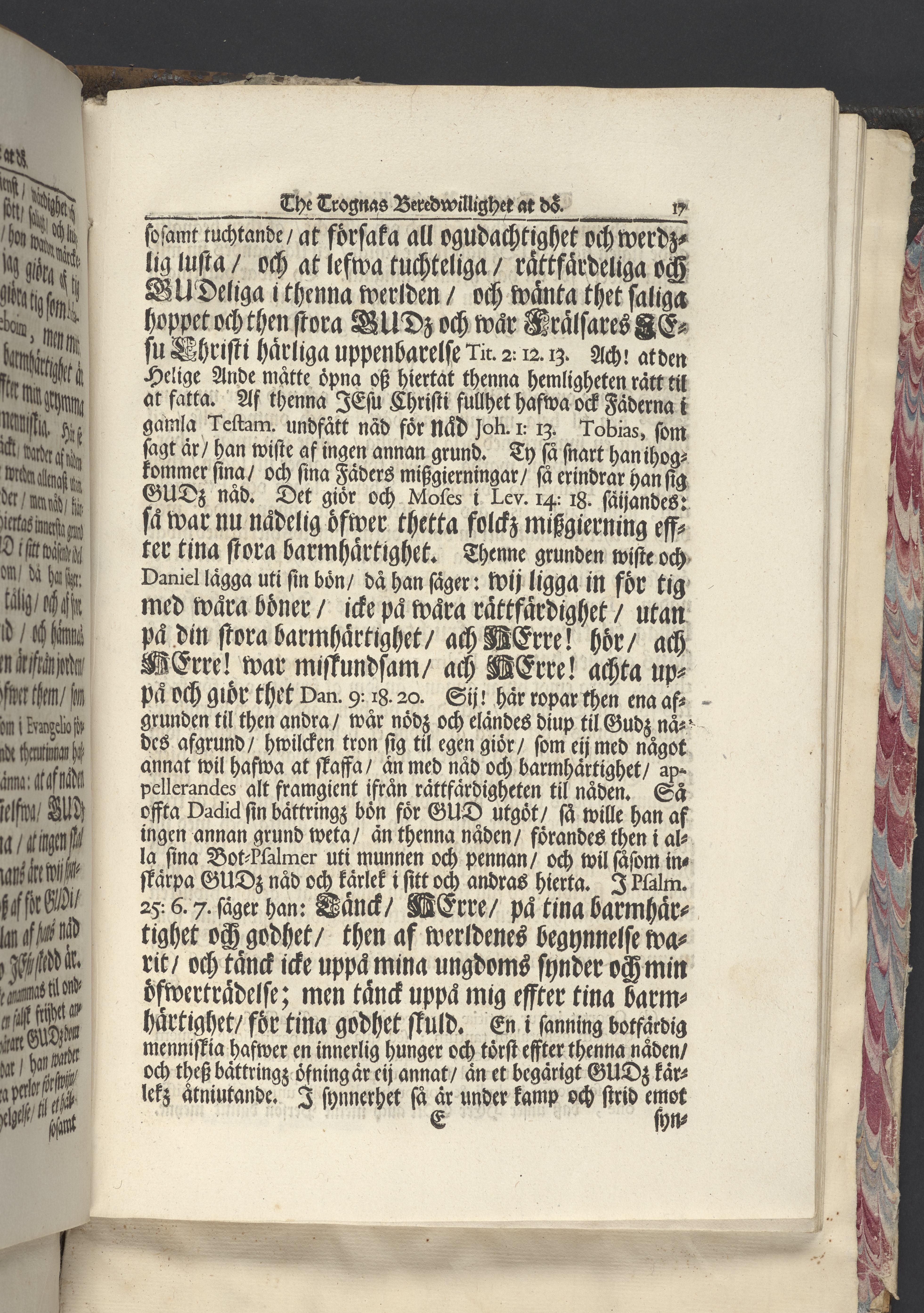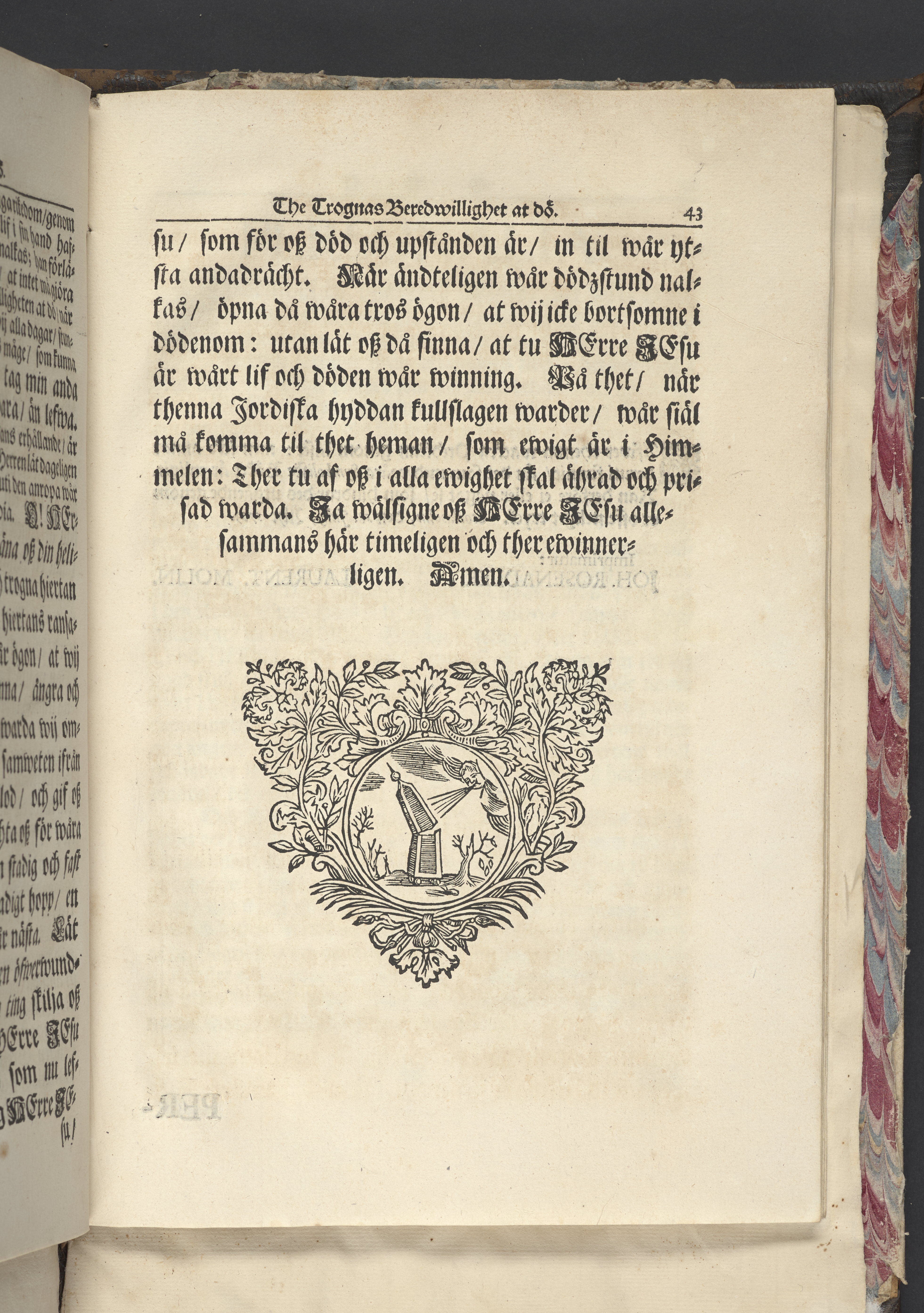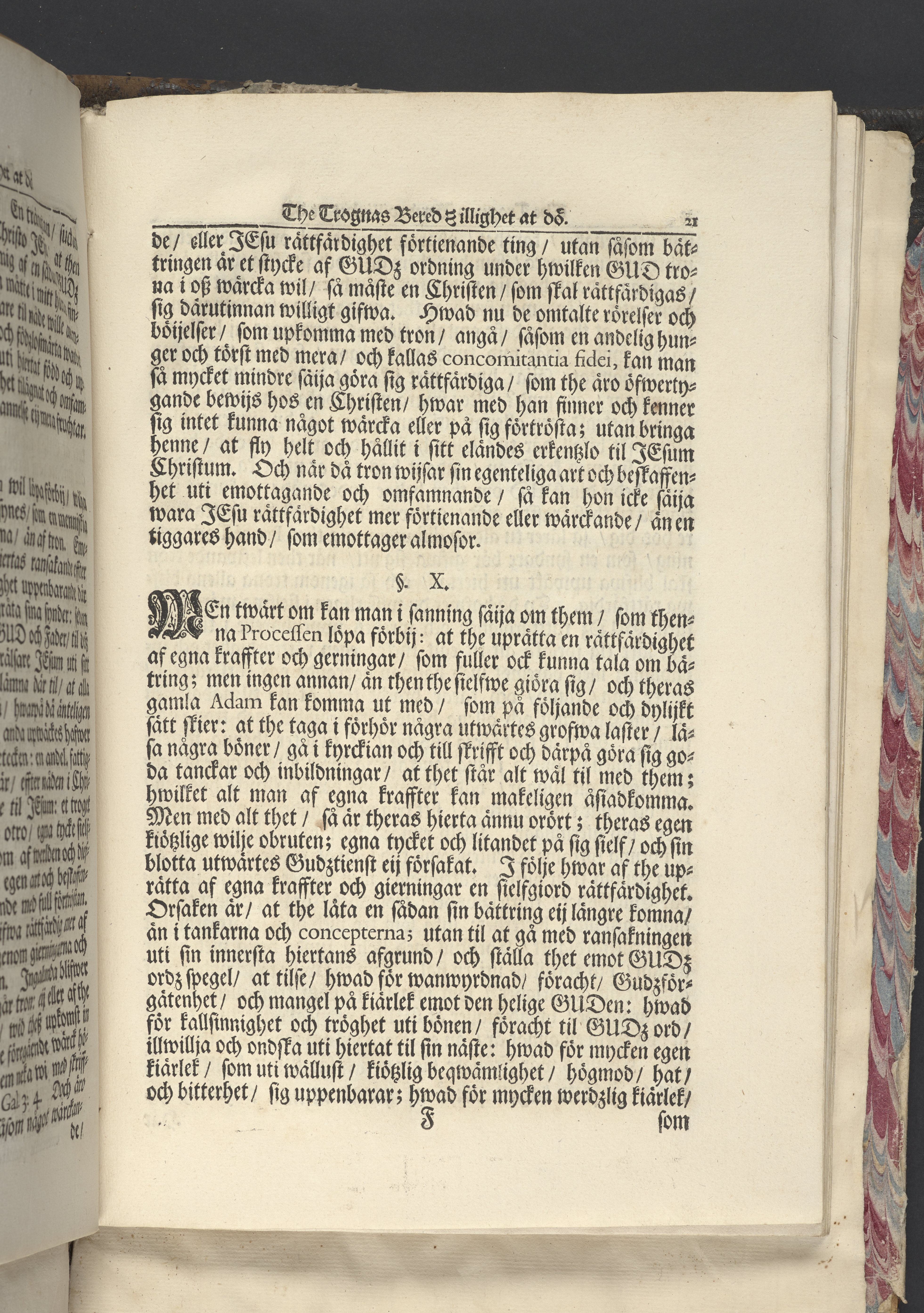 Band m. pärmar av marmorerat papper, rygg och hörn av pergament. Pärmfyllnad: trä.