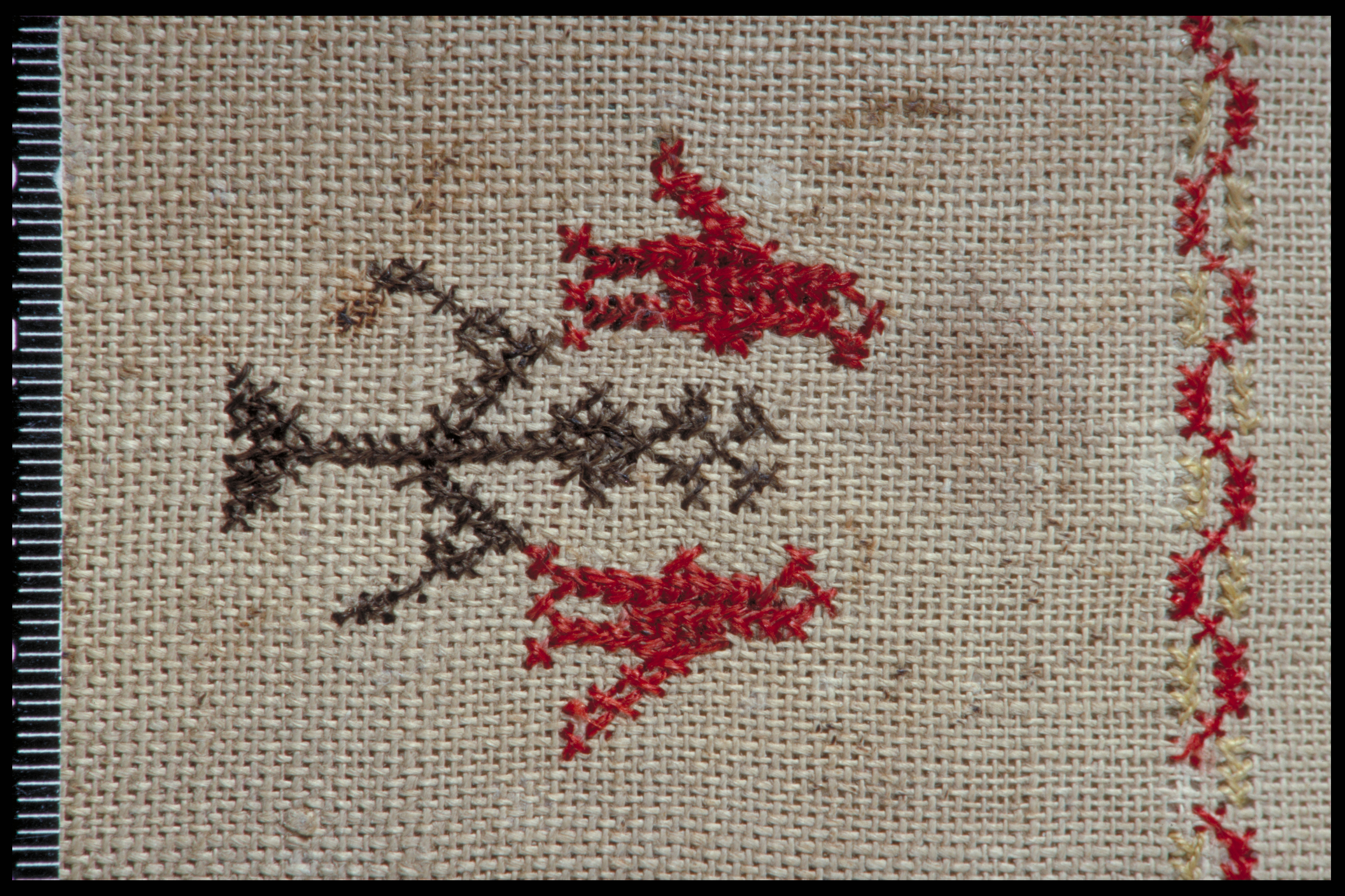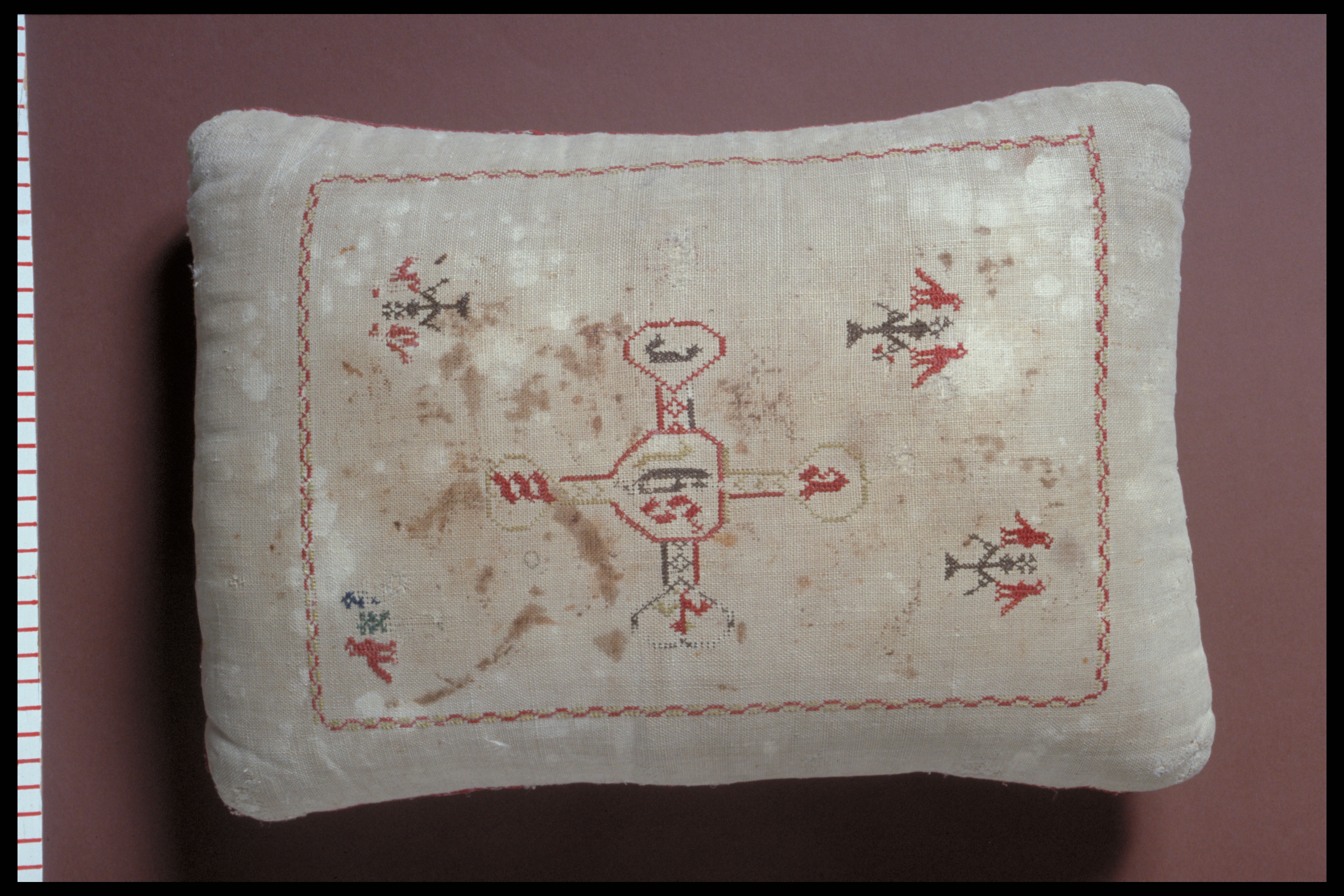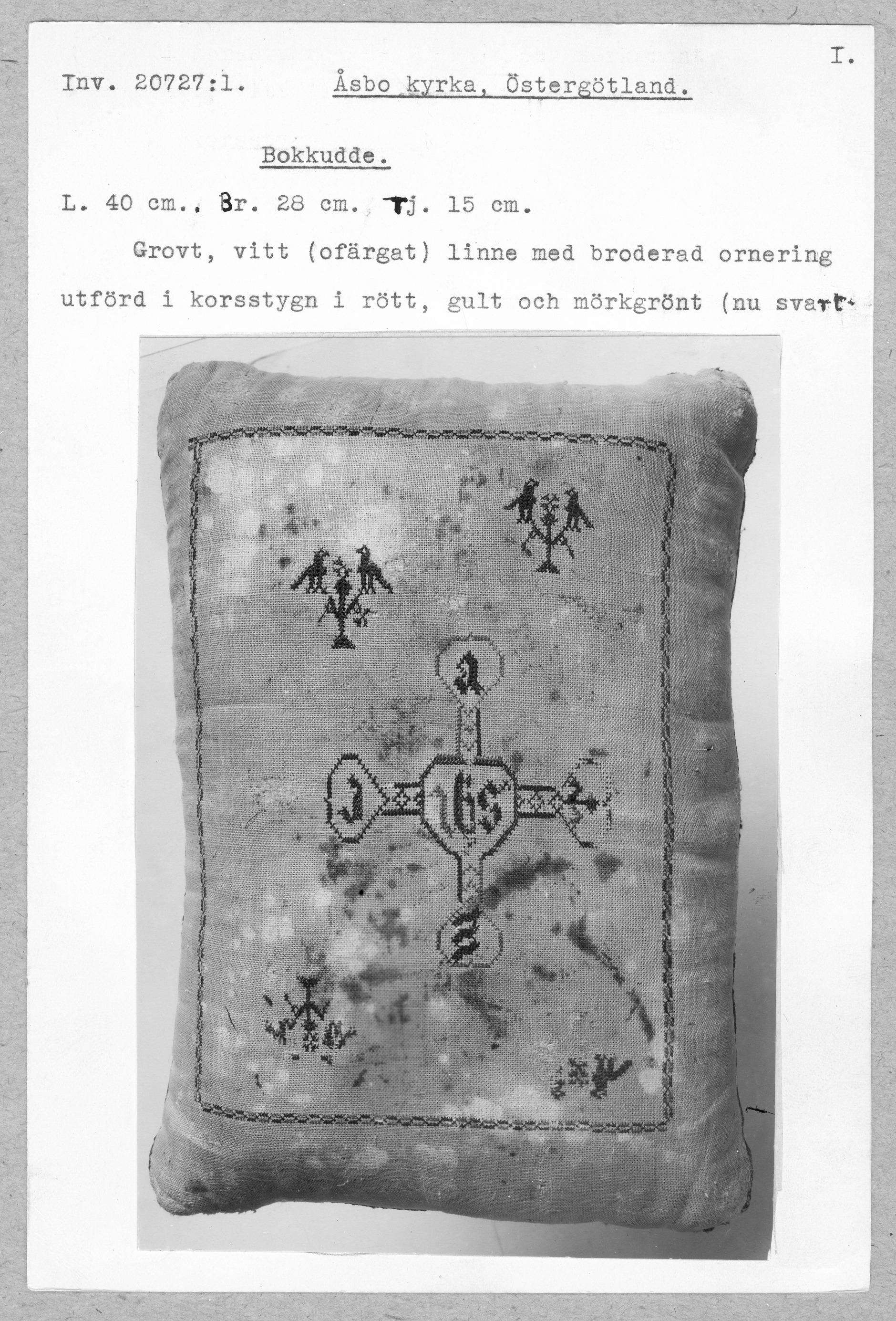 Vitt linne med korssömsbroderi i rött, gult, mörkgrönt. Likarmat kors med IHS i mitten, i var korsarm bokstäverna M A R I. Fyra träd flankerade av två fåglar. Motiven inramas av en smal bård. Runt kanterna, sammanfogande ovan- och baksidan av dynan, vävt ullband med rutmönster i färgerna vitt, rött, grönt med röda kanter. Gåva till SHM 1934. Dynan är utförd i korssöm i slutet av medeltiden. Troligen har den tjänat som bokdyna vid altaret.