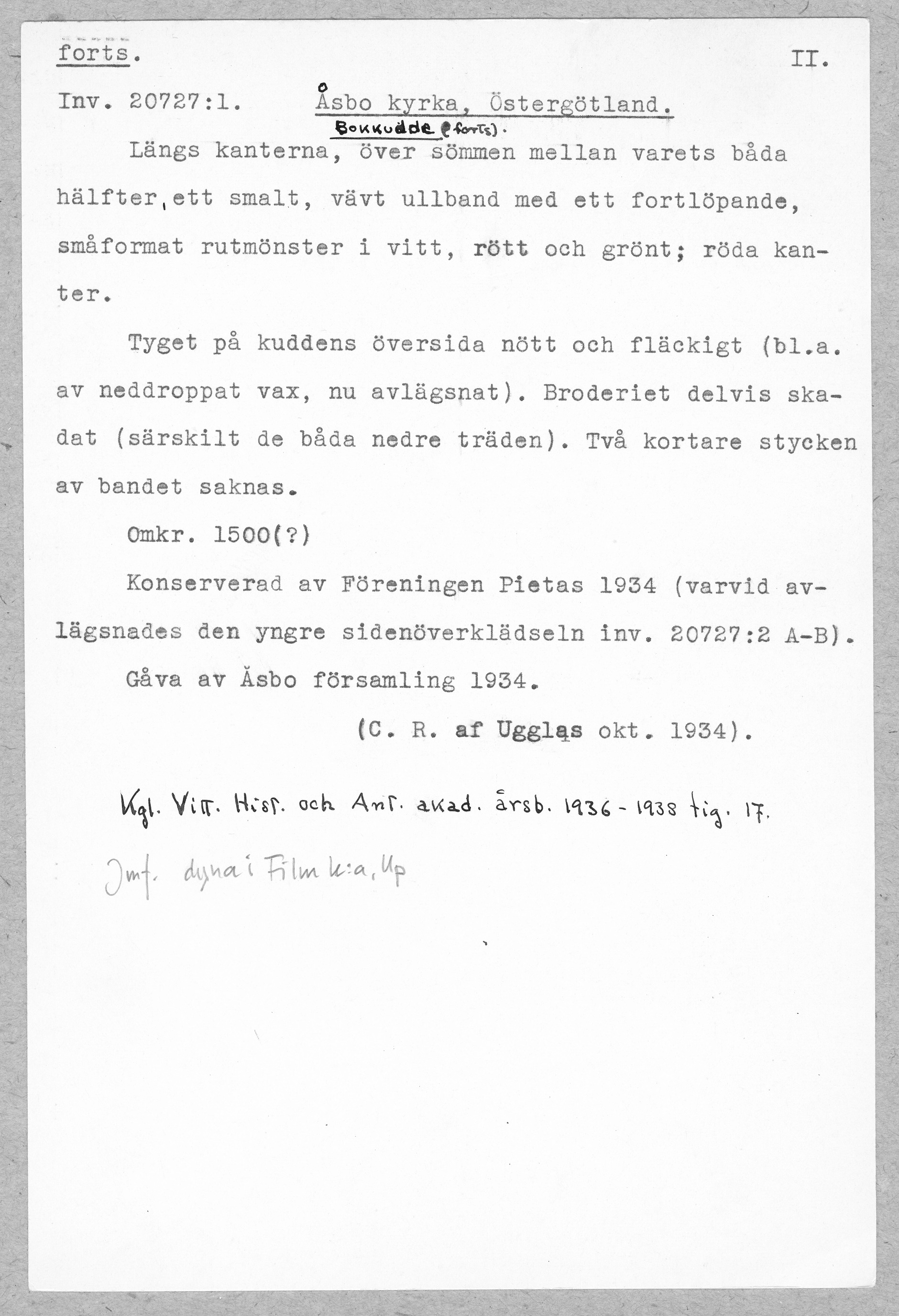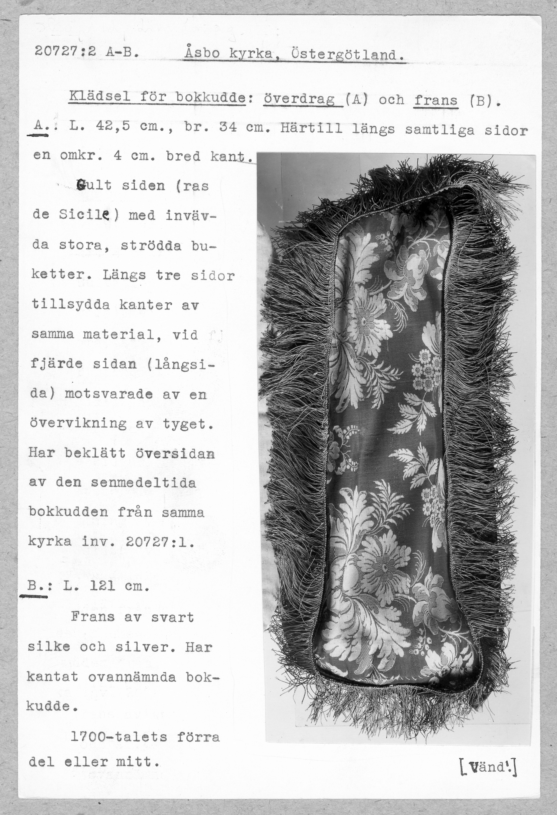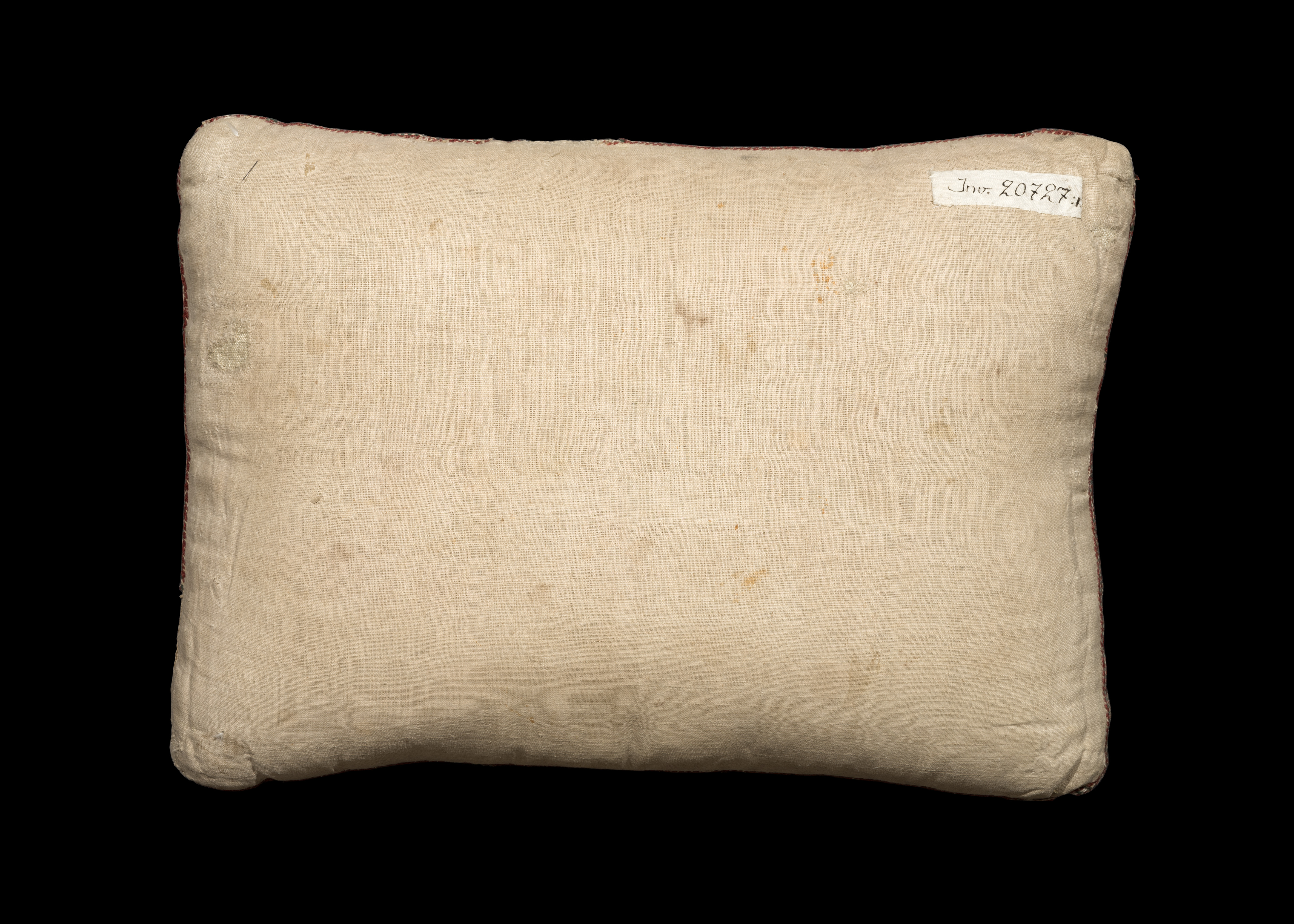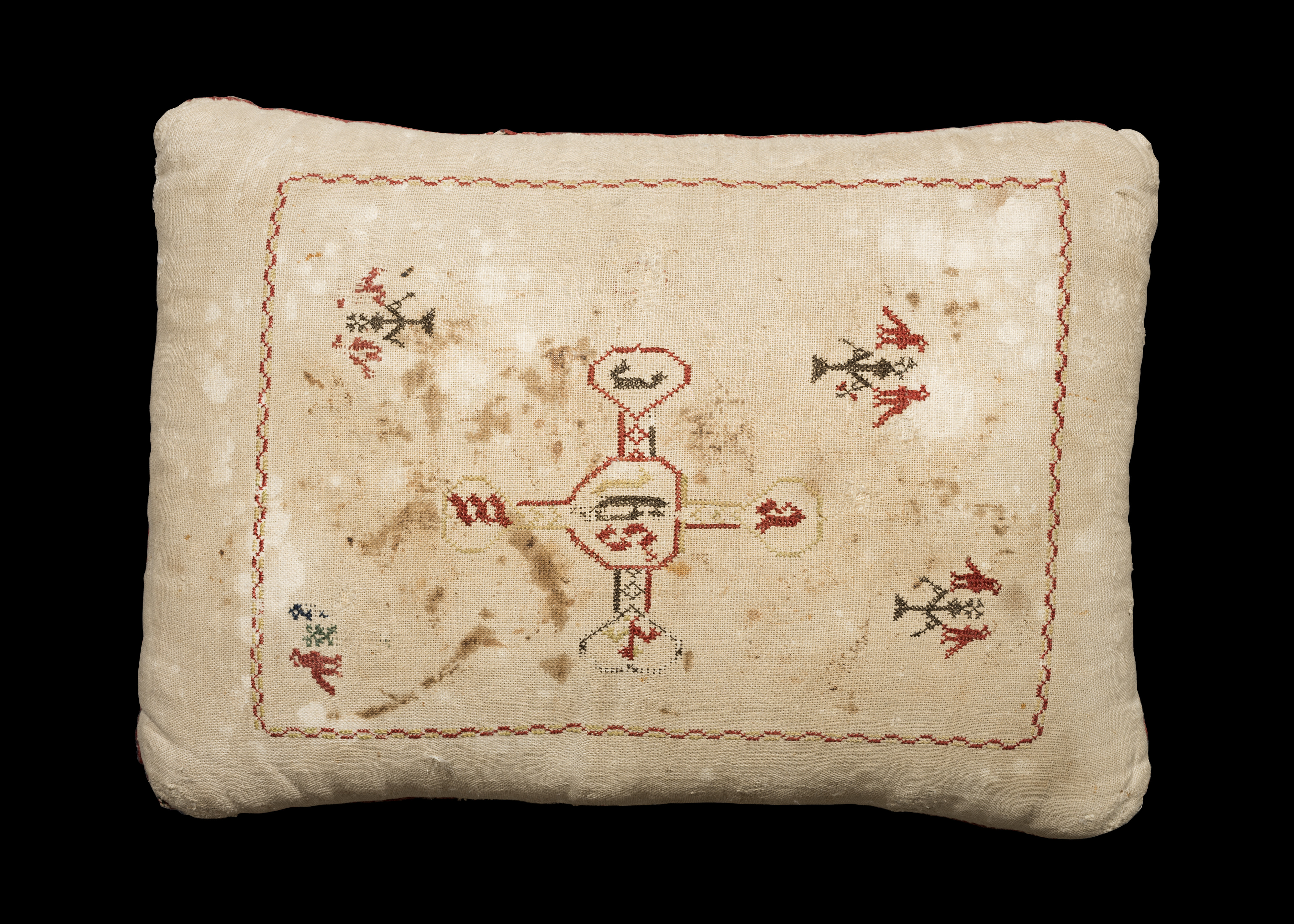 Vitt linne med korssömsbroderi i rött, gult, mörkgrönt. Likarmat kors med IHS i mitten, i var korsarm bokstäverna M A R I. Fyra träd flankerade av två fåglar. Motiven inramas av en smal bård. Runt kanterna, sammanfogande ovan- och baksidan av dynan, vävt ullband med rutmönster i färgerna vitt, rött, grönt med röda kanter. Gåva till SHM 1934. Dynan är utförd i korssöm i slutet av medeltiden. Troligen har den tjänat som bokdyna vid altaret.