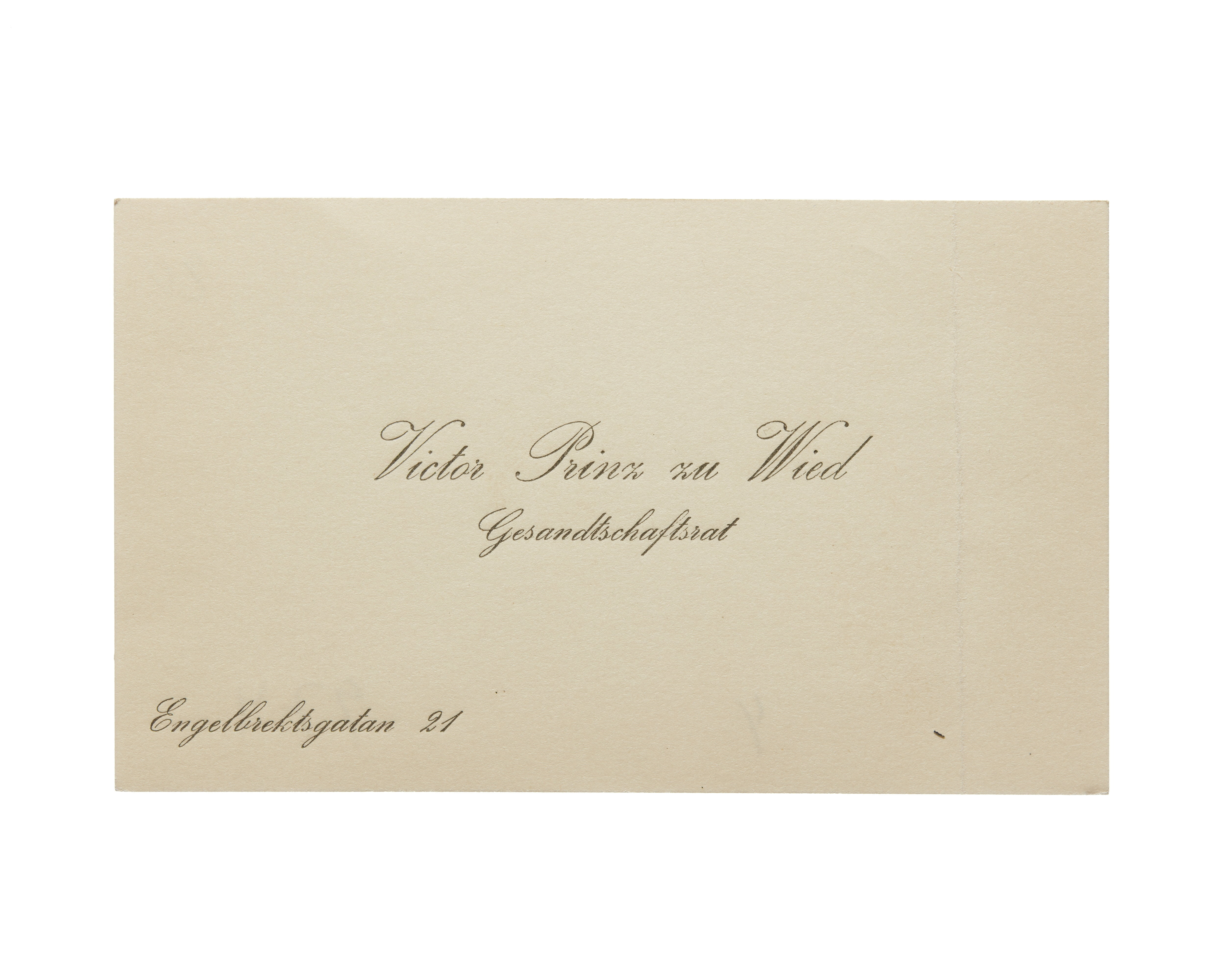 Fyra visitkort från Prinz Viktor (Wilhelm Friedrich Adolf Hermann V) zu Wied. Första kortet daterat 1919, vikt i vänstra sidan. Adress (nedre vänstra hörnet) Kommendörsgatan 9. Andra kortet där utan datum, vikt i övre högra hörnet. Tredje kortet daterat 1918, vikt i övre högra hörnet. Fjärde kortet daterat 1920, vikt i högra sidan. Adress (nedre vänstra hörnet) Engelbrektsgatan 21.