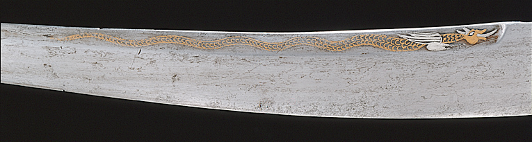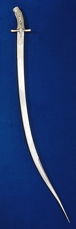 Fäste upptill framåtböjd. Kappa åttsidig med plan ovansida av silver med graverad ranka och på ovansidan en enhörning. Korta, raka parerstänger med åttsidigt tvärsnitt med rundade, vidgade ändar i ett med styrskenor av försilvrad mässing. Krysset graverat med förgylld bladbård och blomma. Kavel med kantigt, ovalt tvärsnitt, klätt med vitt hajskinn. Märken efter tre nitar, en nit med runt, välvt huvud av silver med prickdekor återstår. Klinga av stål, böjd, eneggad med ett 362 mm långt, tvåeggat spetsparti, som ytterst är något böjt i vinkel och mycket långt och smalt. Klingan ornerad på ryggen intill fäste med orientalisk ranka, längre ned en orm av påslaget guld. På utsidan nära fästet gallerverk av påslaget silver och guld, därovanför orientalisk ranka av guld. Längs den andra eggen en ringlande orm av påslaget guld. På insidan orientaliskt ornament av påslaget guld nära fästet och orm som ovan längs den andra eggen.