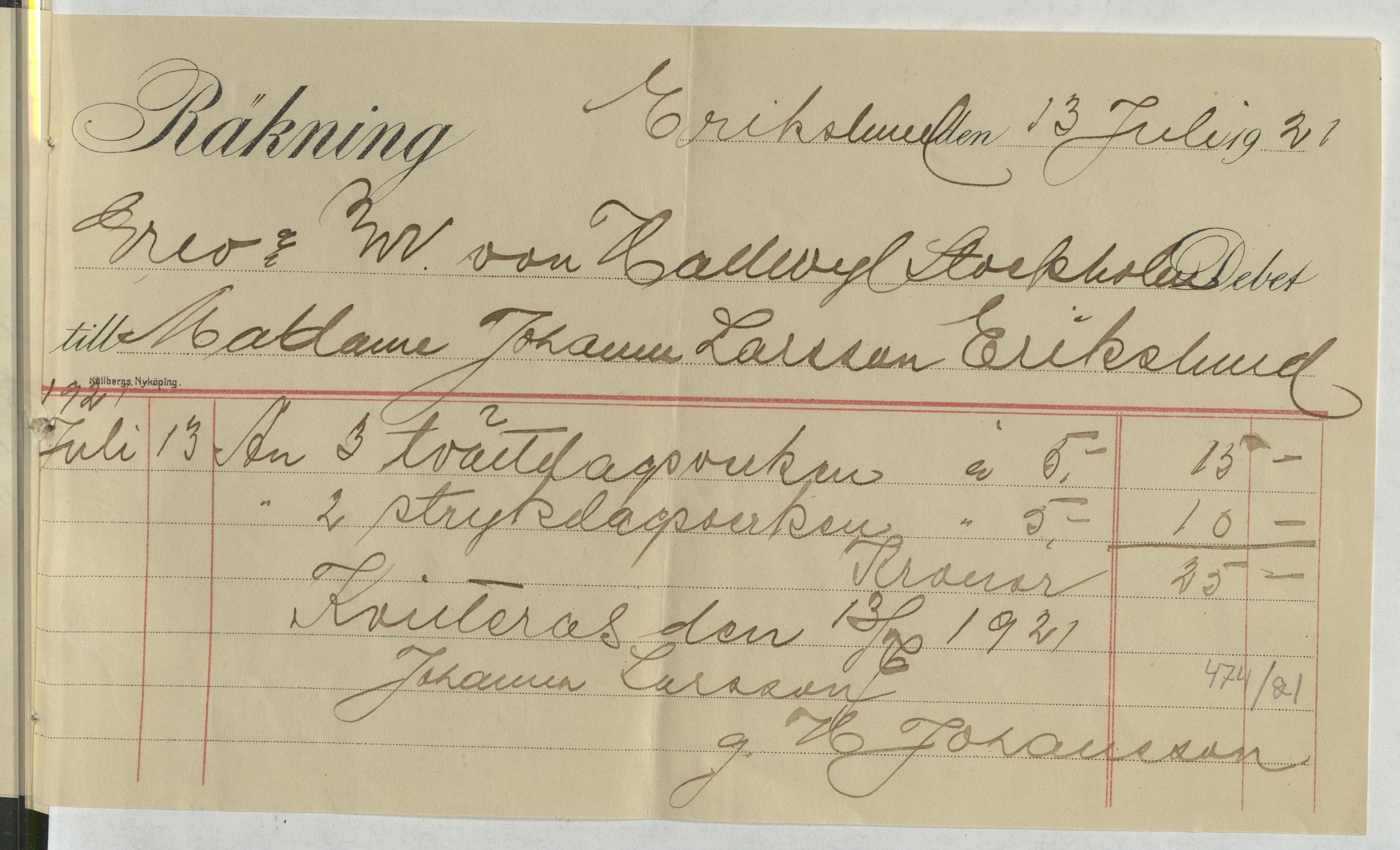 Kvitto från Johanna Larsson vid Erikslund. Gällande 3 tvättdagsverken och 2 strykdagsverken. Erikslund, 1921.