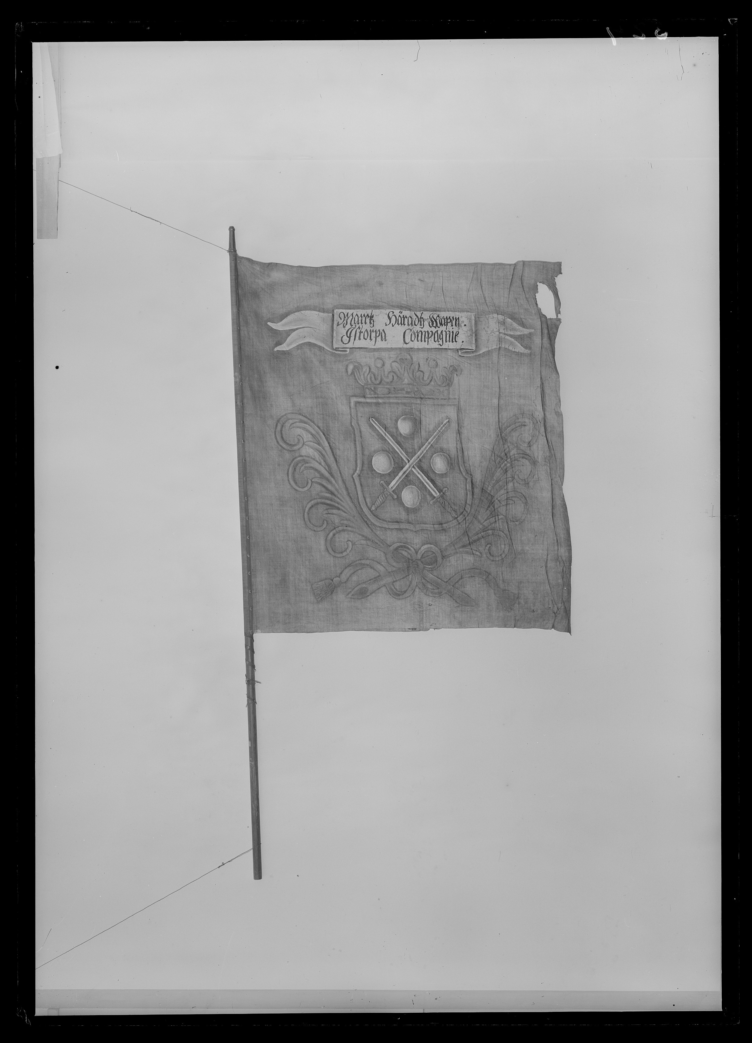 Duk av enkel linnelärft. Vådkant i vertikala ytterkanten. Dekor: Målad lika på båda sidor, i mitten i gult, en sköld krönt med öppen krona. Nedtill innefattad av två korsade palmkvistar hopknutna med långa tofsprydda band. I skölden tvåkorsade svärd med vita klingor och gula fästen följda av fyra vita kulor i vinklarna. Över vapnet ett inskriptionsband: "Marks häradsvapen // Istorpa Compagnie." Fäst vid stången med sexstjärniga tennlikor på ett band, b: 16 mm. Bandet fortsätter ner påstången, l: 290 mm. Duken fäst med separat strumpa av samma tyg som duken. Stång av brunmålat trä. Holk av mässing, h: 104 mm.